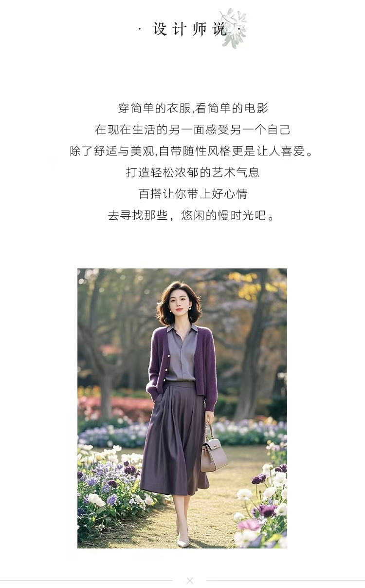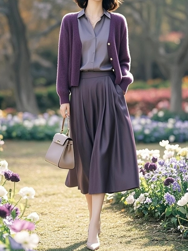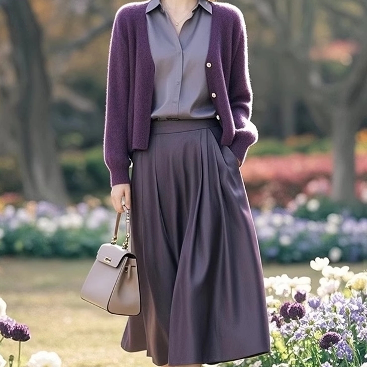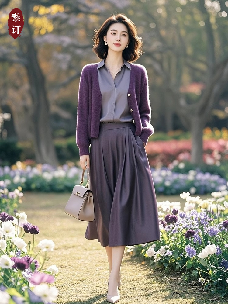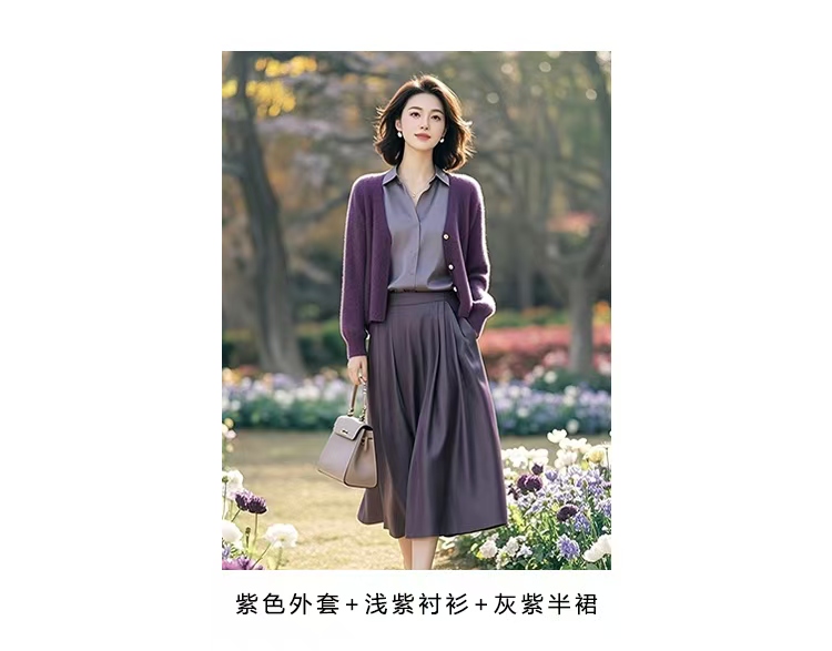 (预售15天)时髦休闲显瘦紫色针织开衫+衬衫+半身裙三件套LJX-368