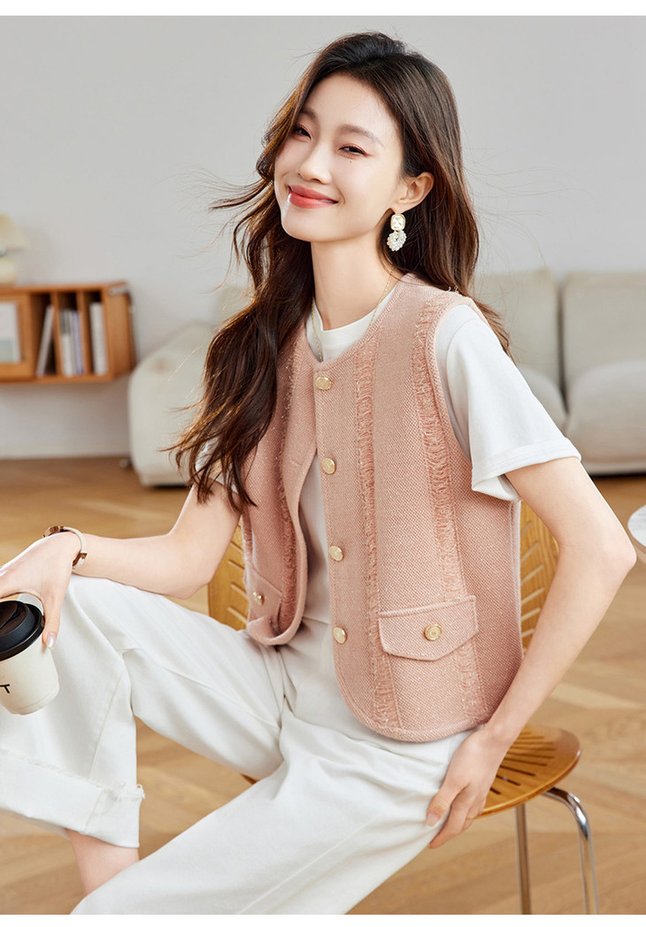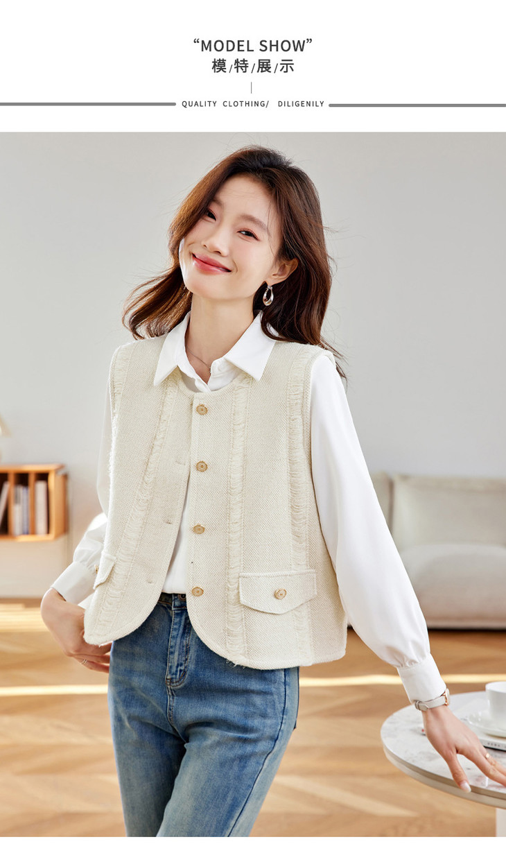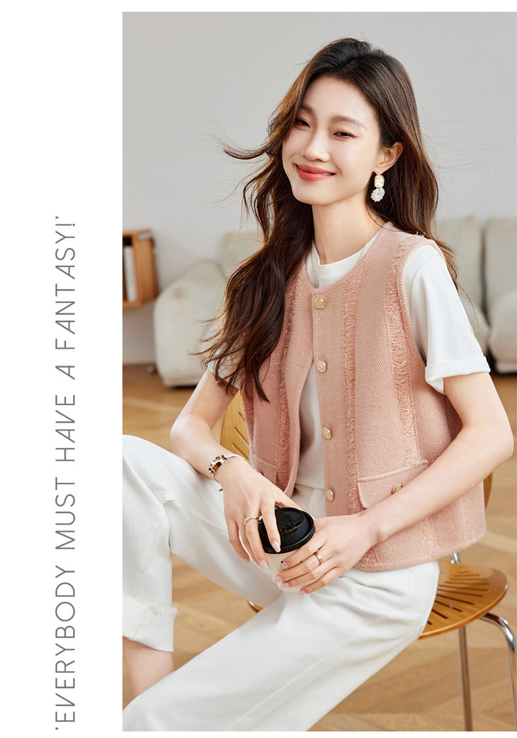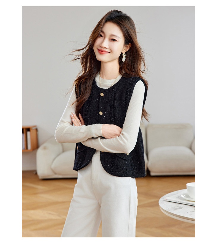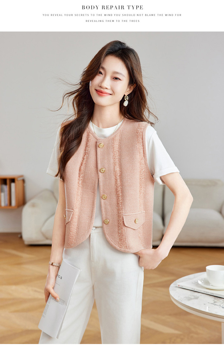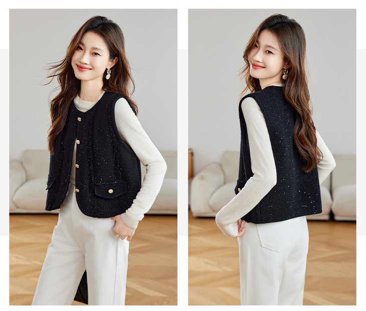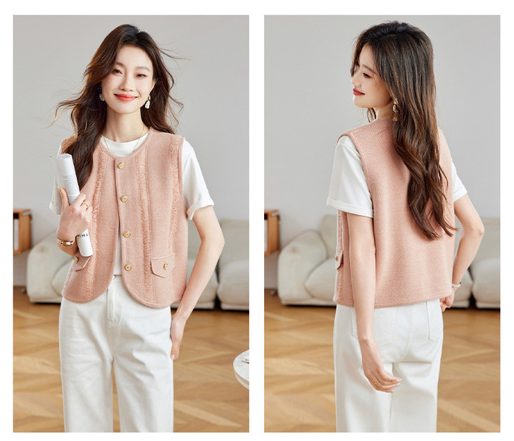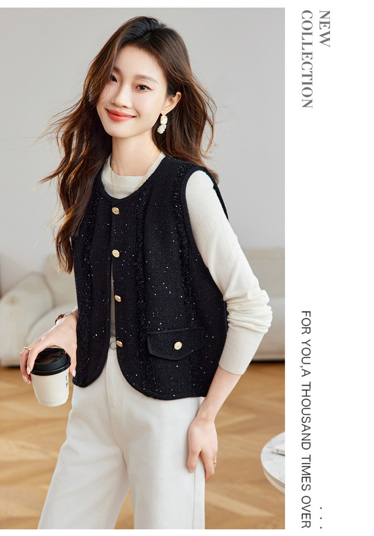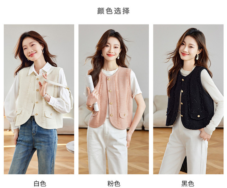 时尚气质小香风无袖通勤,圆领金属扣马甲开衫针织衫CC-16-9701