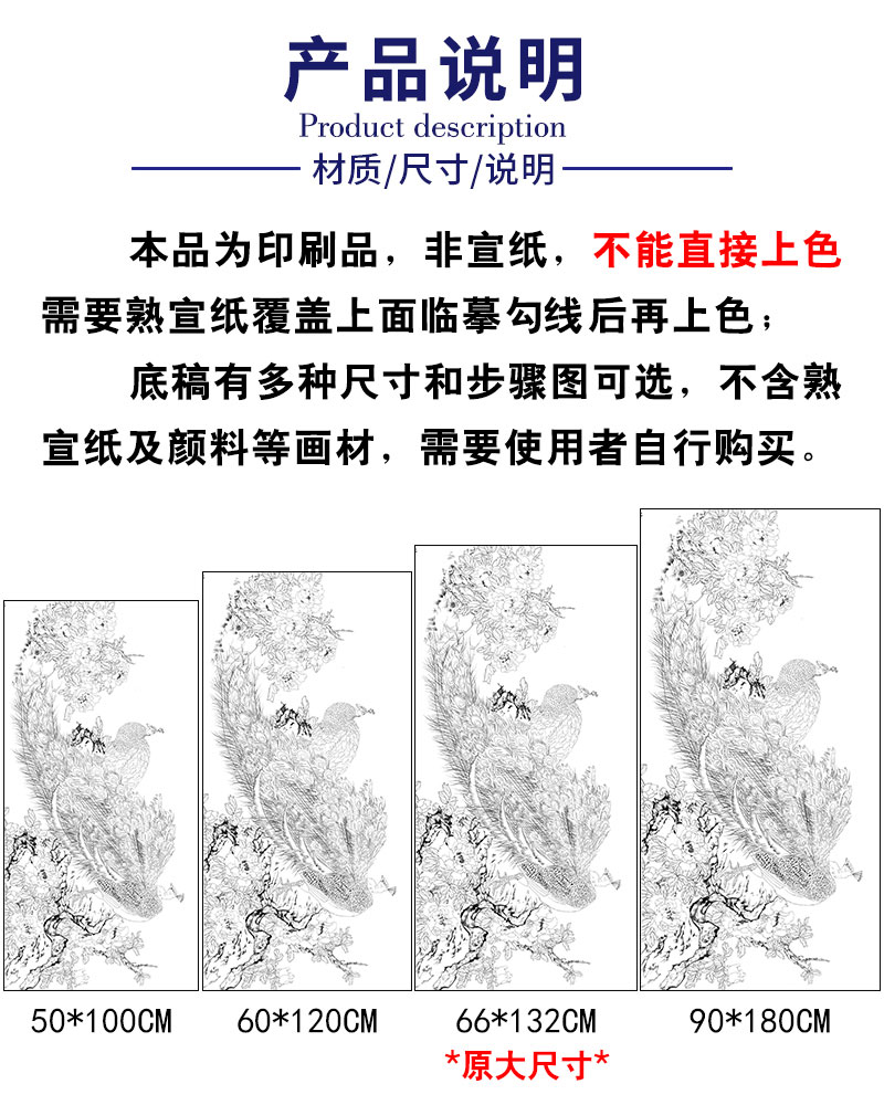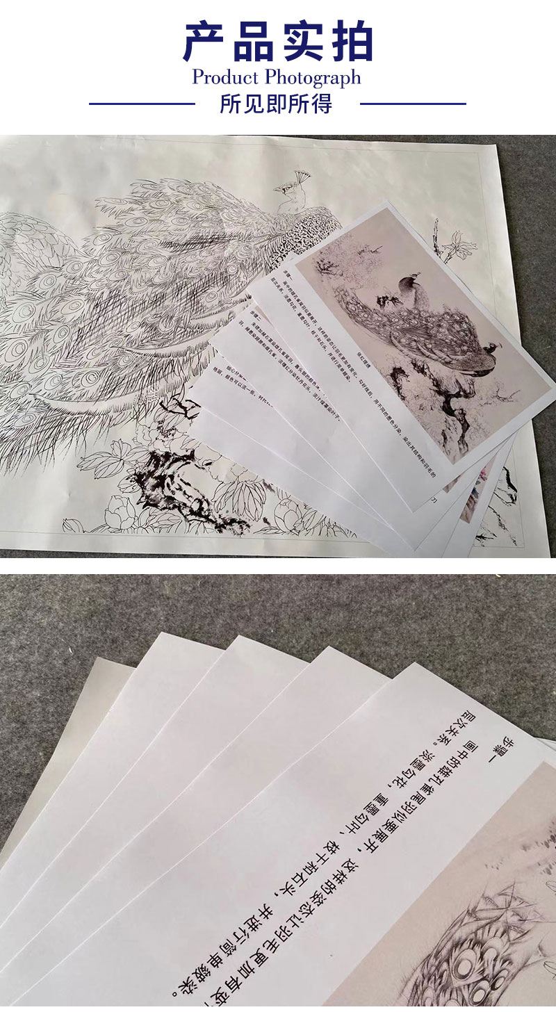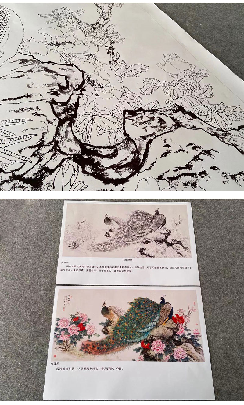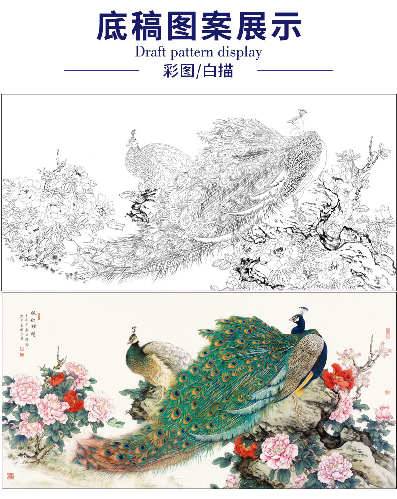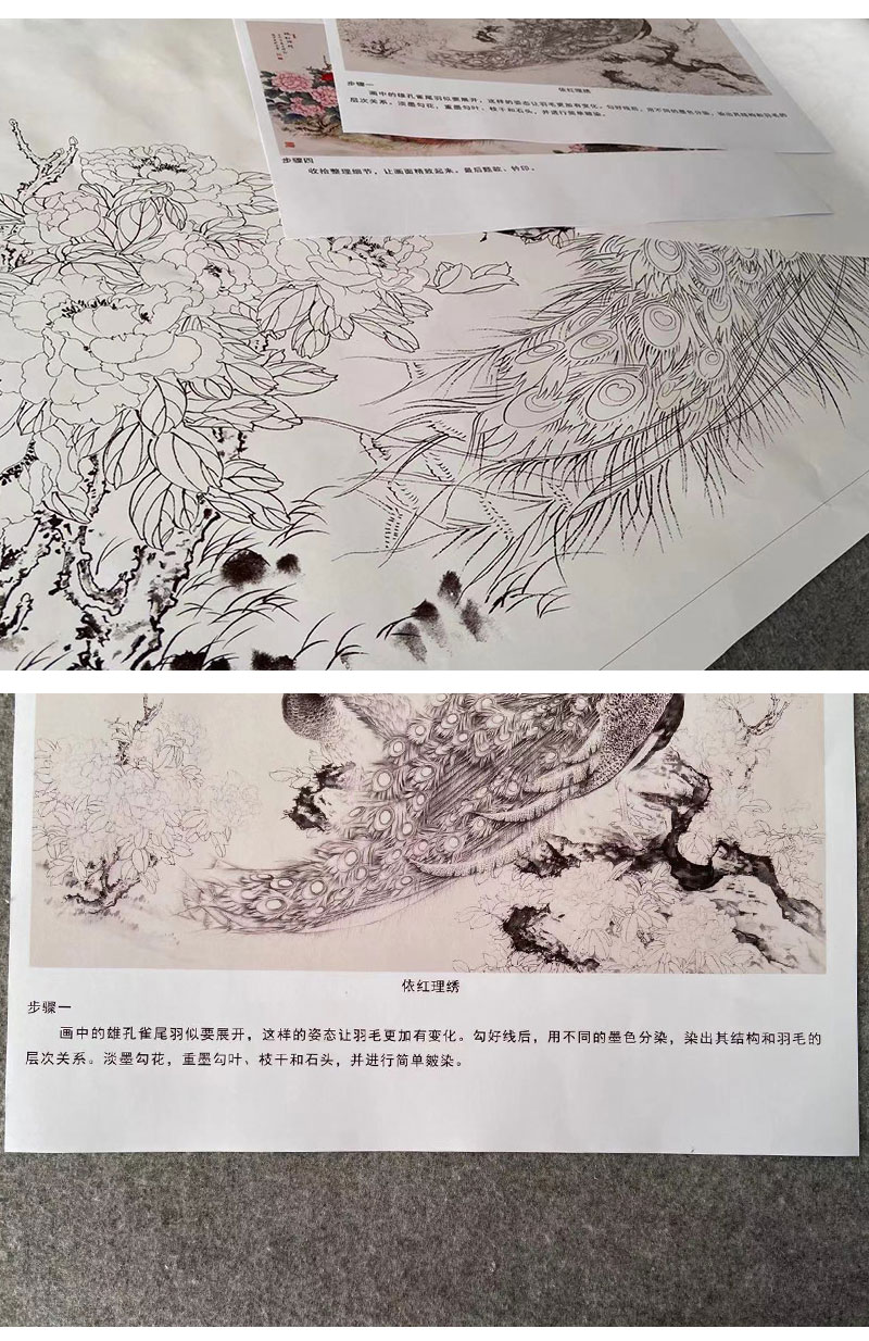 【有步骤】陈军横幅工笔画白描底稿《依红理绣》孔雀牡丹初学者临摹花鸟线稿CJ33