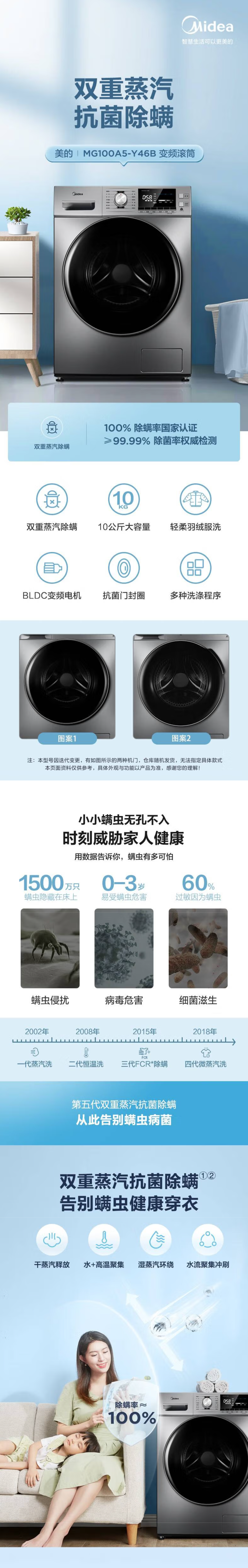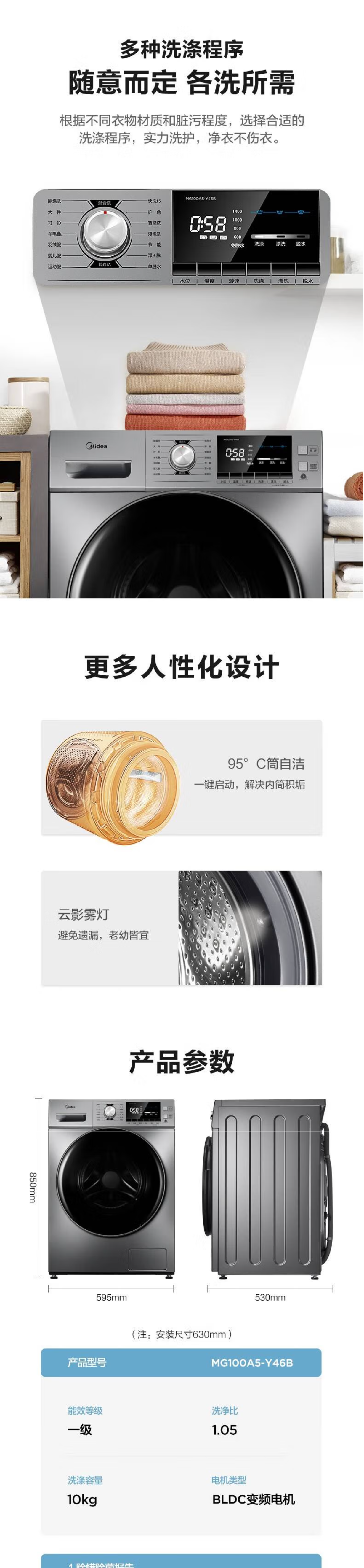 美的 (Midea)京品家电 滚筒洗衣机全自动 10KG低噪变频 双重蒸汽除菌除螨 快净系列 MG100A5-Y46B