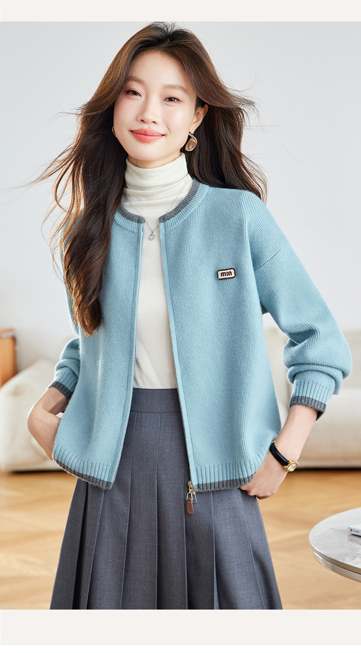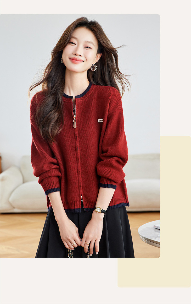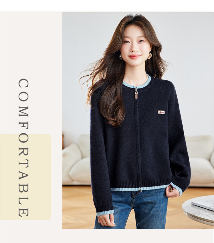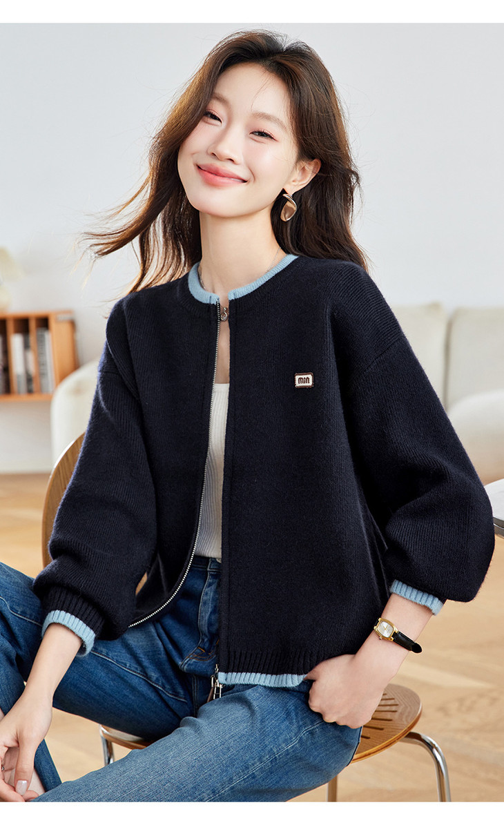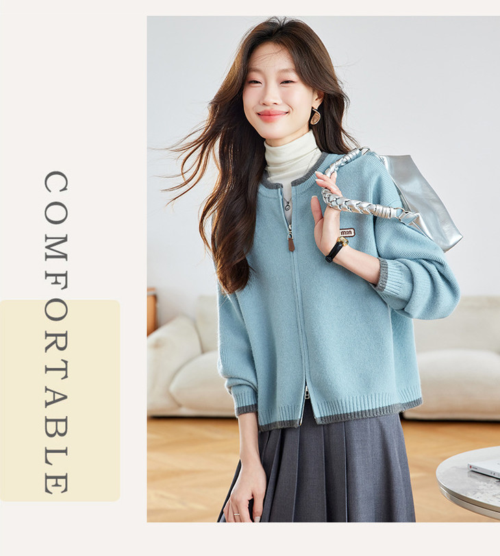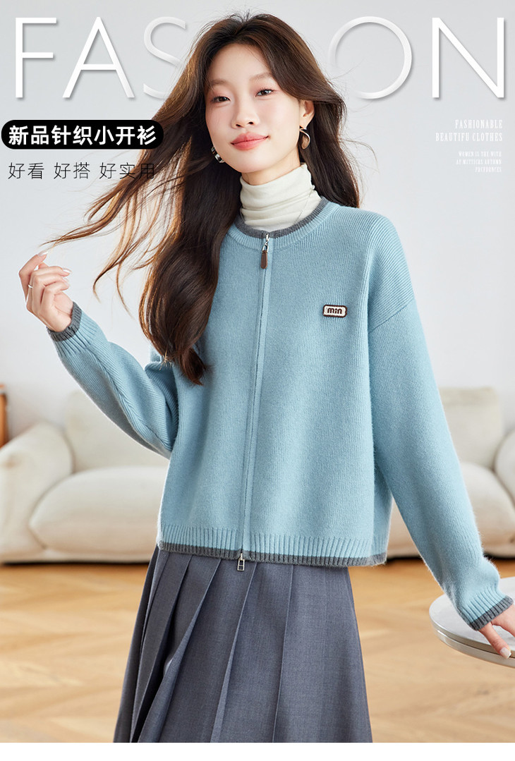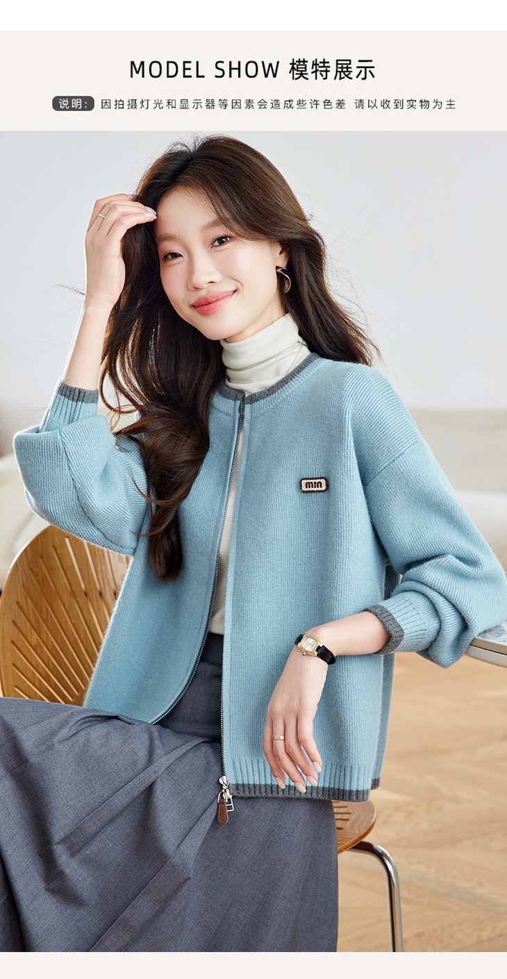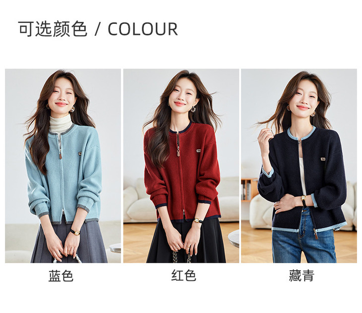 早秋双拉链短款针织开衫,宽松慵懒风毛衣外套拼色上衣CC-22-2713