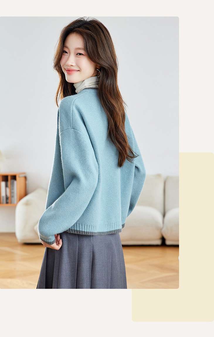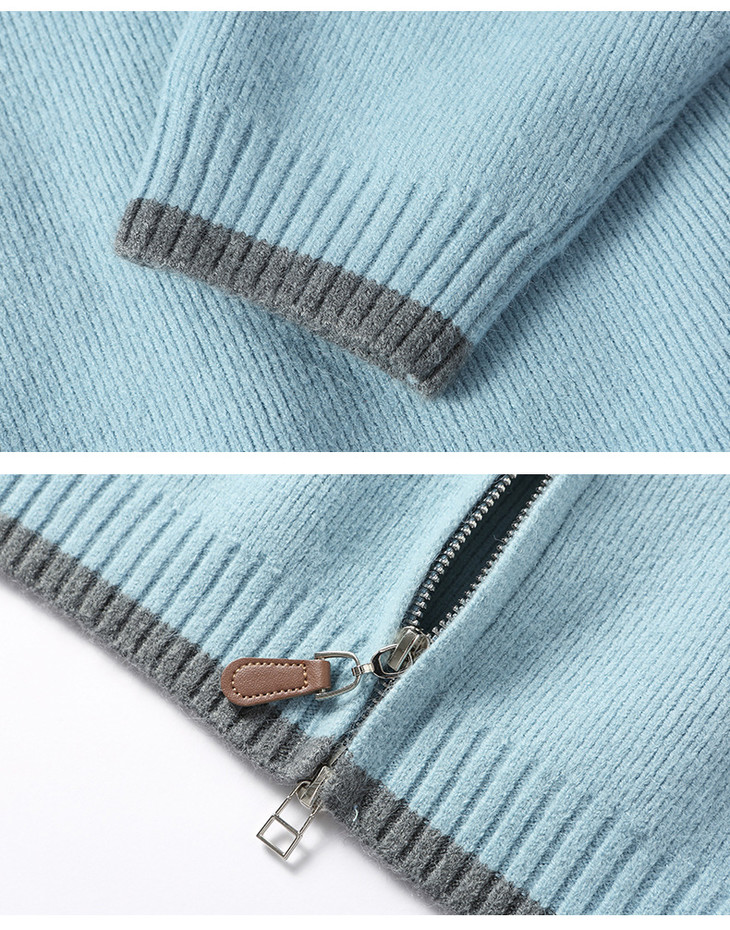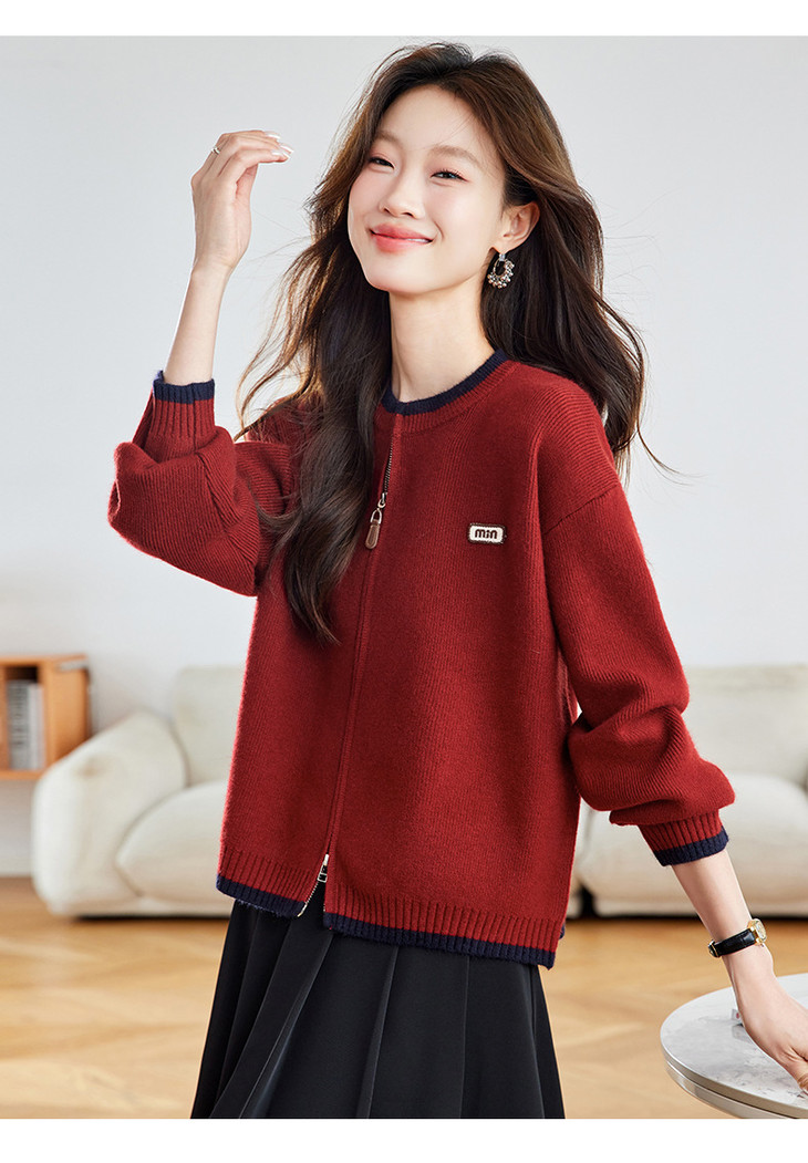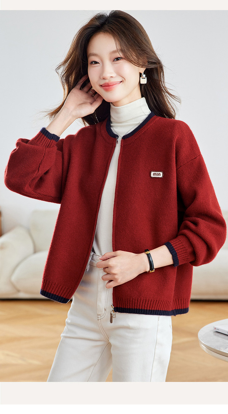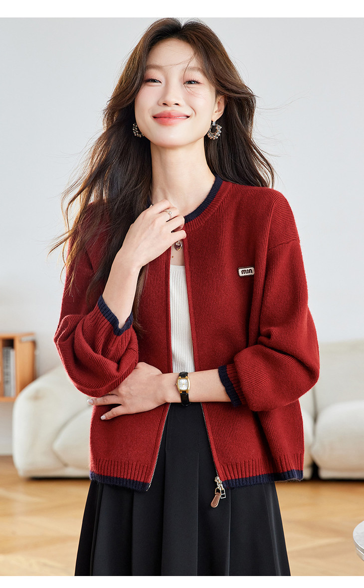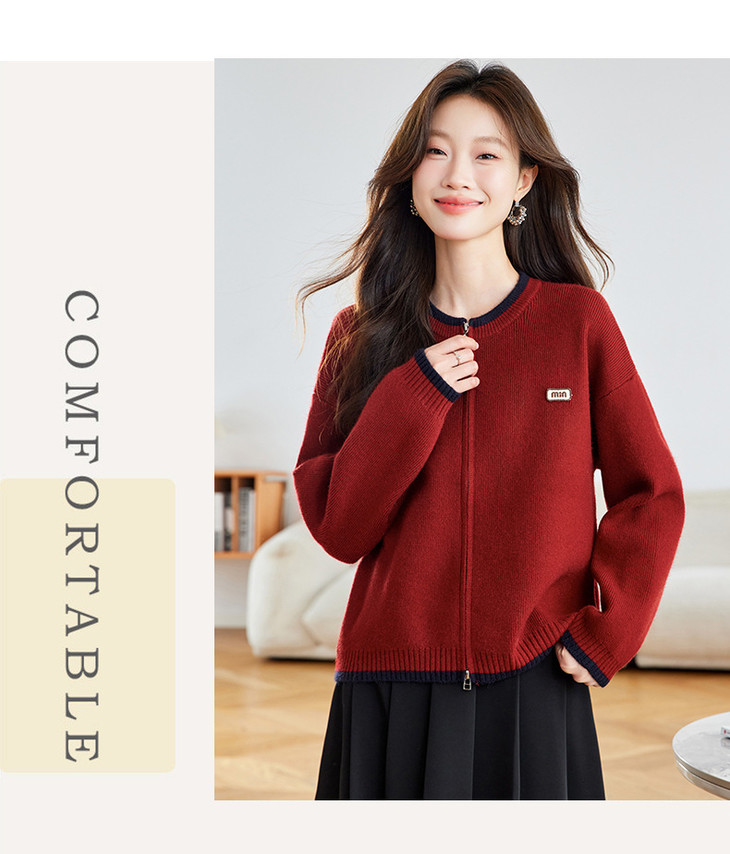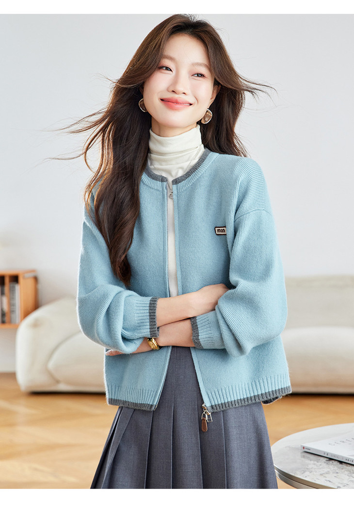 早秋双拉链短款针织开衫,宽松慵懒风毛衣外套拼色上衣CC-22-2713