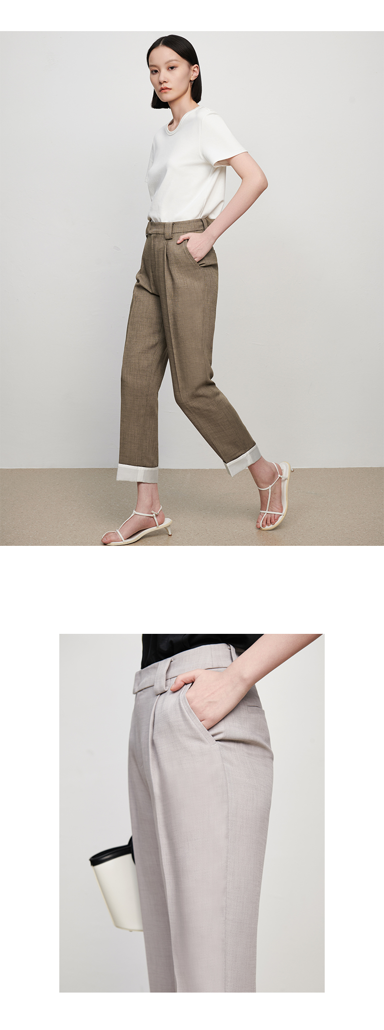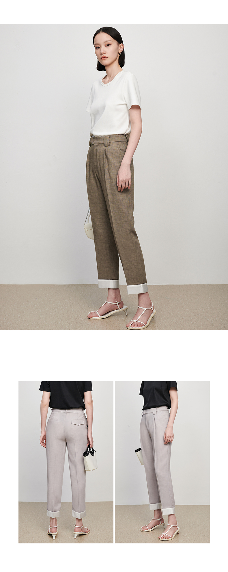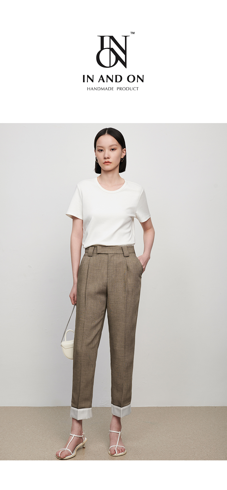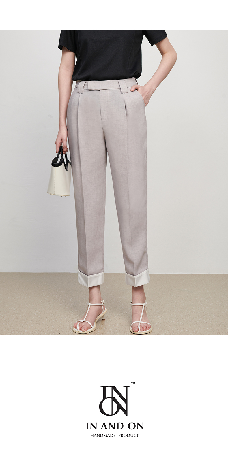 IN AND ON52186新款醋酸质感翻边休闲裤女高腰显瘦百搭锥型裤通勤