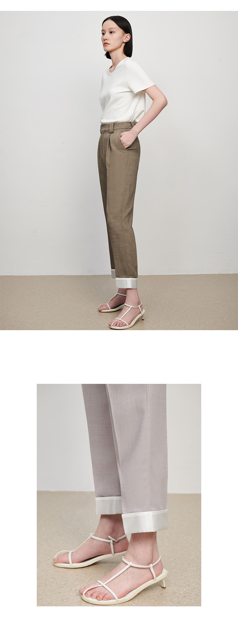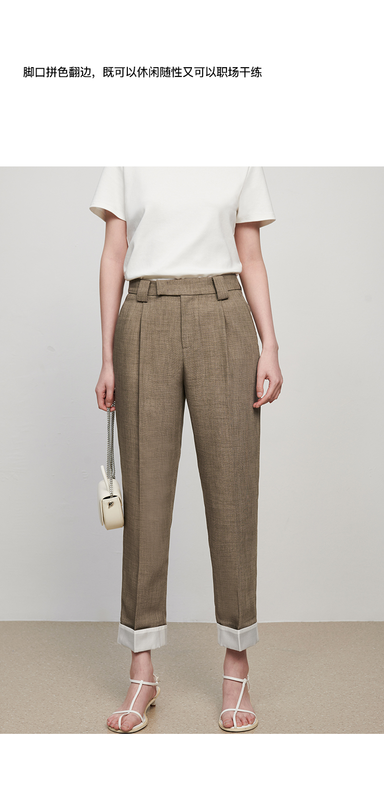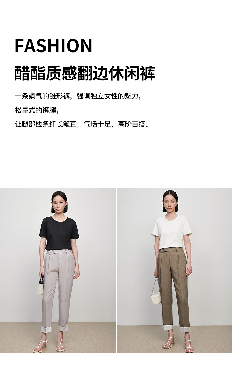 IN AND ON52186新款醋酸质感翻边休闲裤女高腰显瘦百搭锥型裤通勤