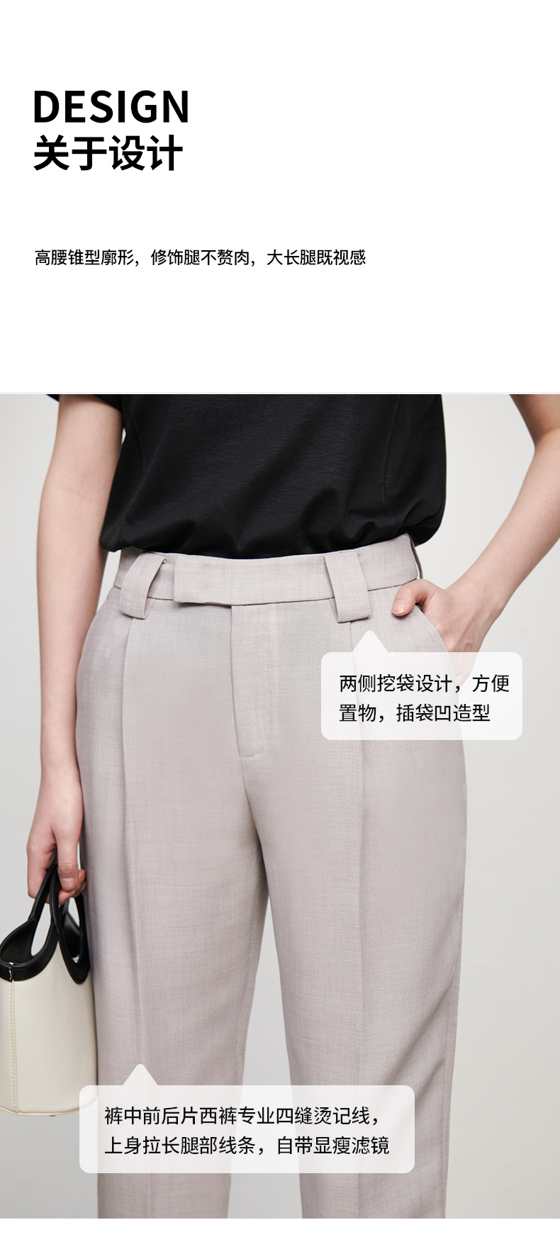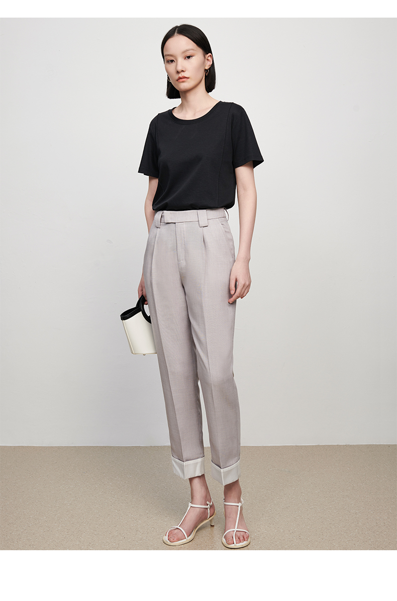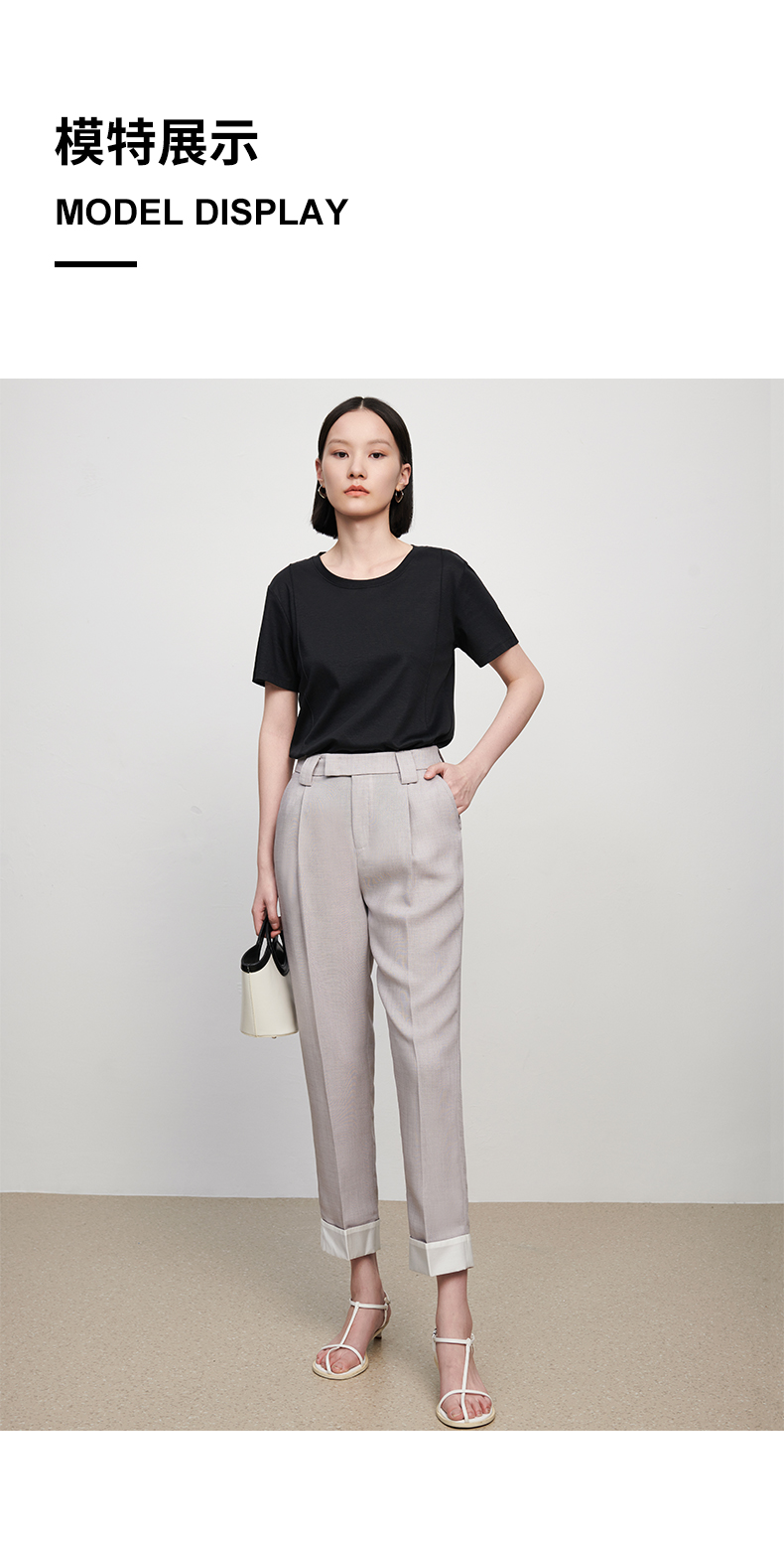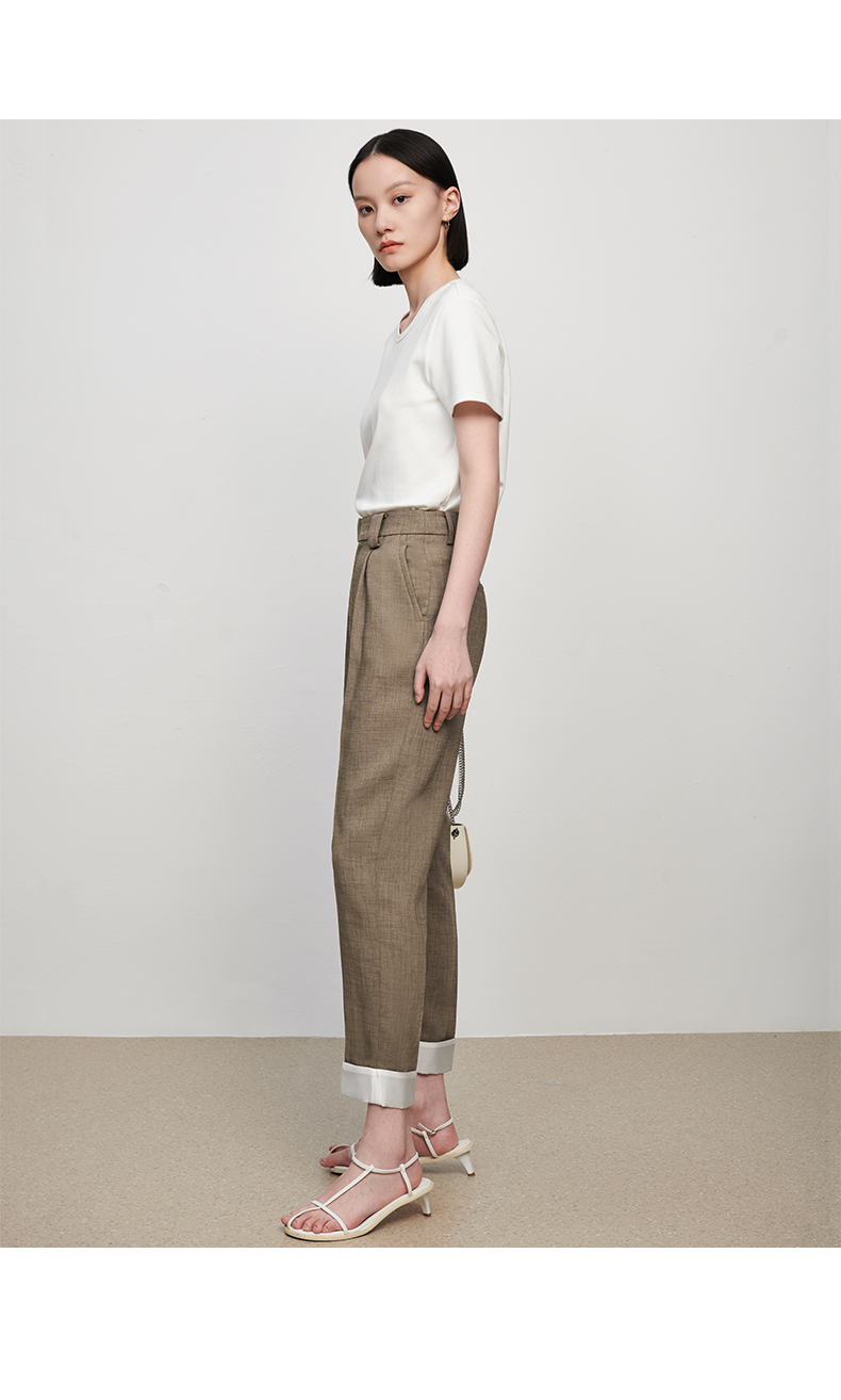 IN AND ON52186新款醋酸质感翻边休闲裤女高腰显瘦百搭锥型裤通勤