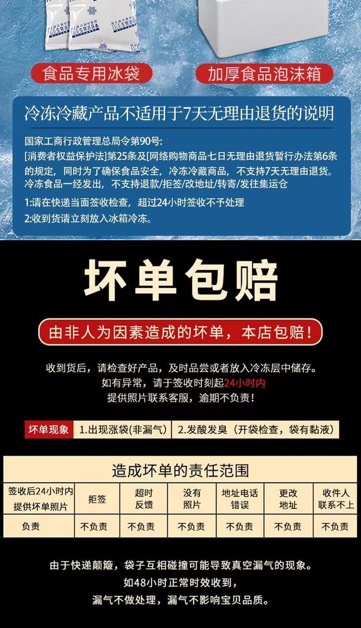 品名:潮汕手工卷章 规格:200g/袋*3袋;拍几份发几个包裹,不一定能同时到达,请耐心等待; 发货地/产地:广东 包装方式:袋装 物流信息:默认中通冷链发货,不支持指定快递 发货区域:新疆、西藏、内蒙不发; 物流详情:周六、周日及节假日除外,正常48小时内发货,到货时间约为2~5天,请耐心等待 售后说明:收到货后有质量问题,在24小时内都可以拍照(坏品+快递单面箱子一起拍)上传,申请按坏品比例理赔或联系客服;生鲜食品性质特殊,不支持7天无理由退换货;因地址错误,手机号联系不上,拒收等造成的损失无法售后,请理解; |