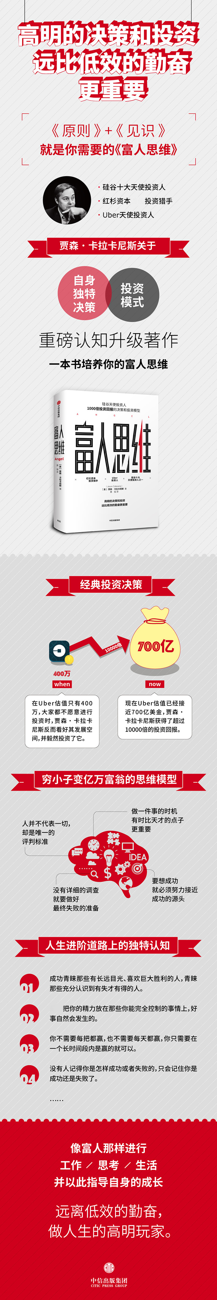 就像瑞·达利欧在《原则》一书中讲述自身的投资和决策理念一样,《富人思维》通过对贾森·卡拉卡尼斯事业发展的回顾,展现了其之所以大获成功的独特思维和决策模型,并对人们一生当中很多关键的投资和决策要点提出了自己的建议。对于想要了解富人如何进行工作、思考、生活,并以此指导自身成长的人来说,《富人思维》是一本难得的作品。
