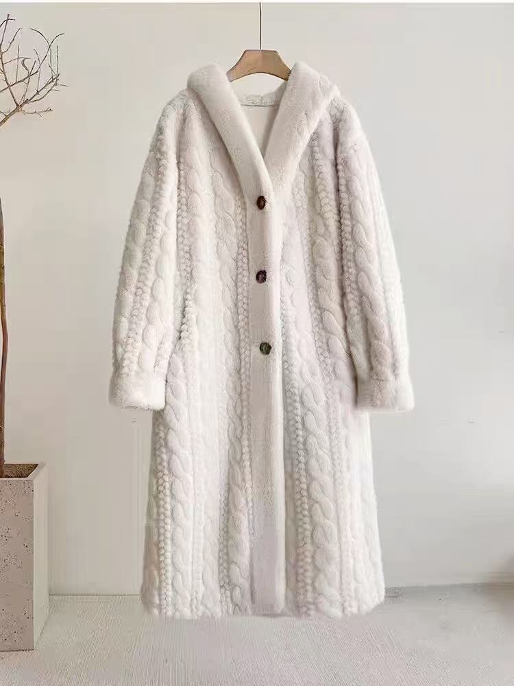 【冬季系列】环保水貂(连帽款)重工麻花连帽外套大衣-喜出