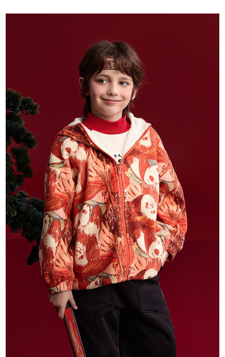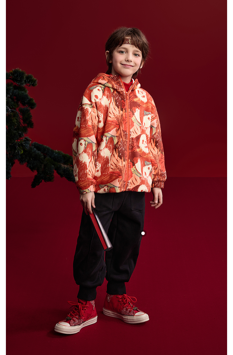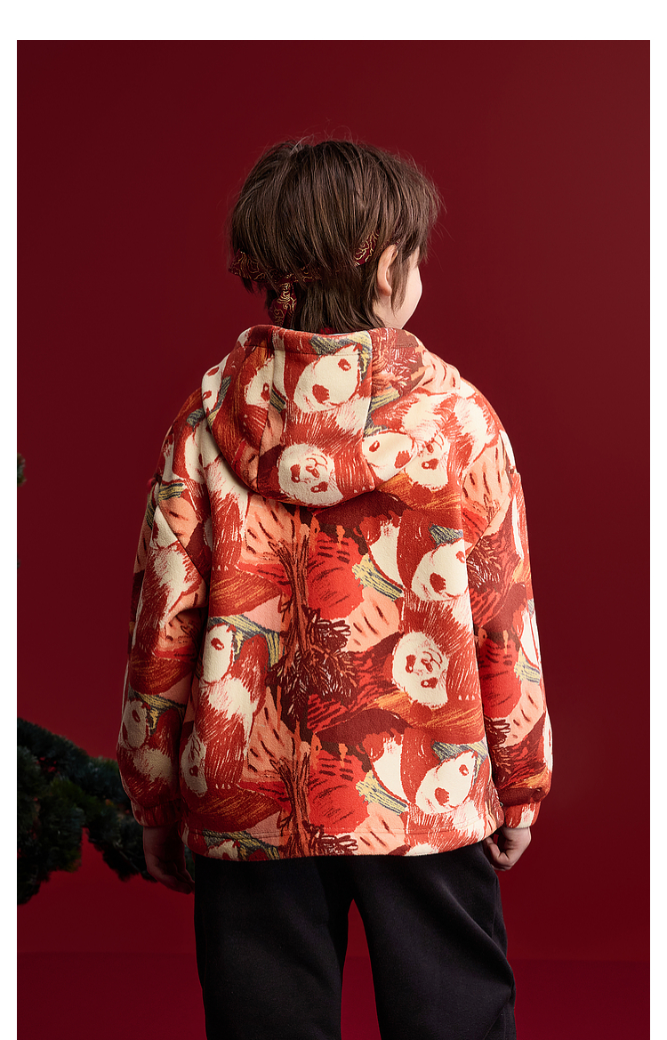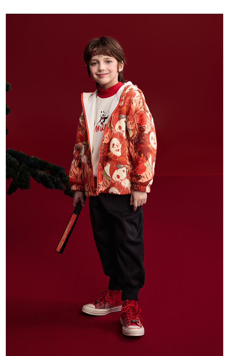 【MQD】童装男童红色外套冬装新款连帽保暖熊猫新年拜年服上衣