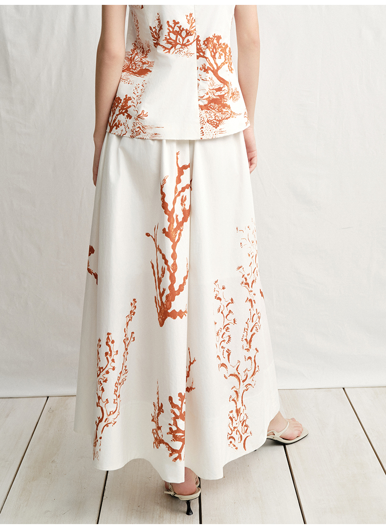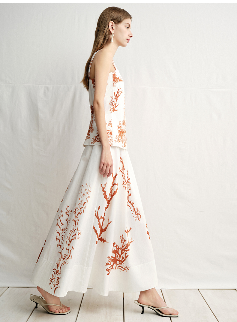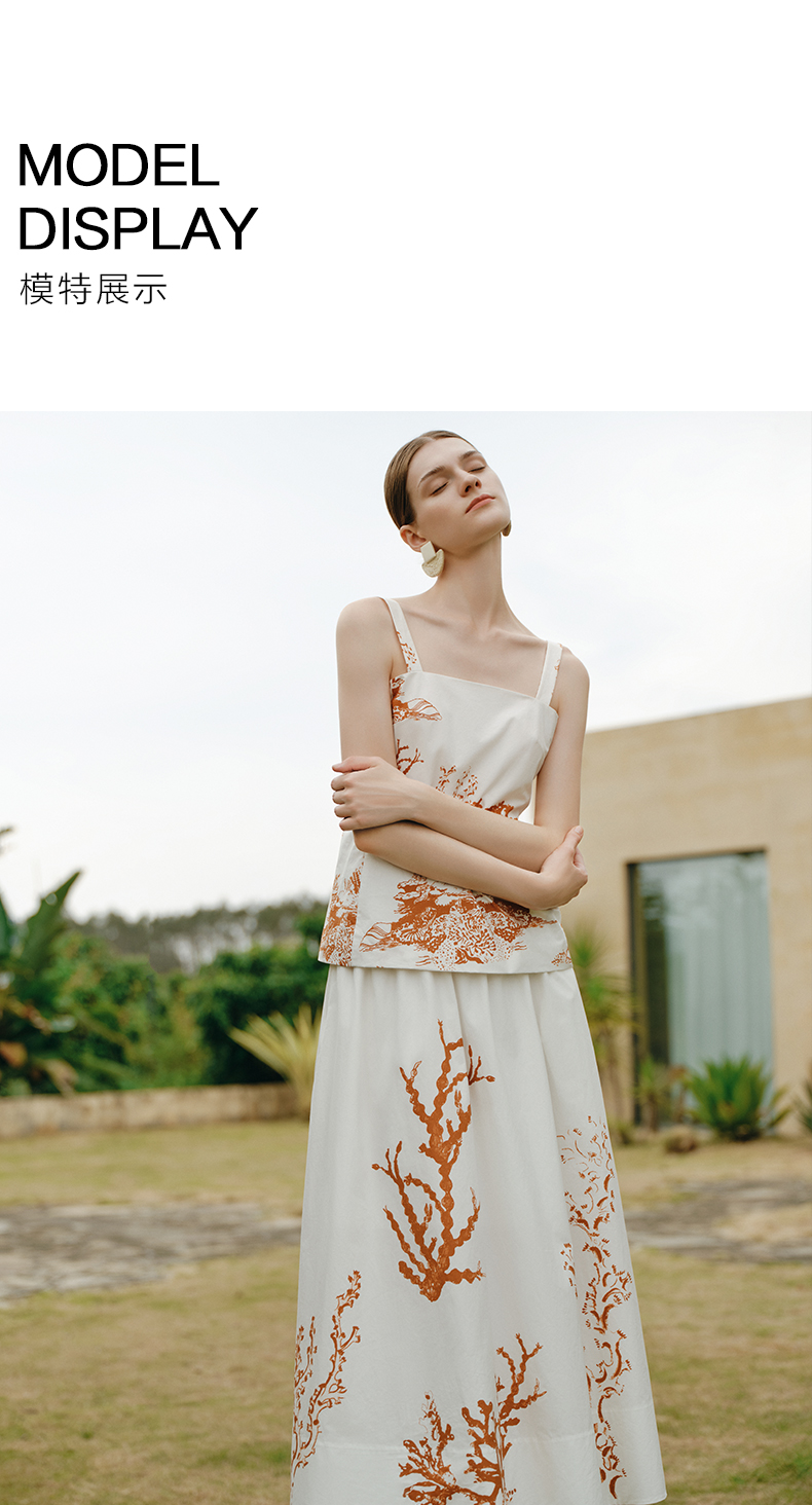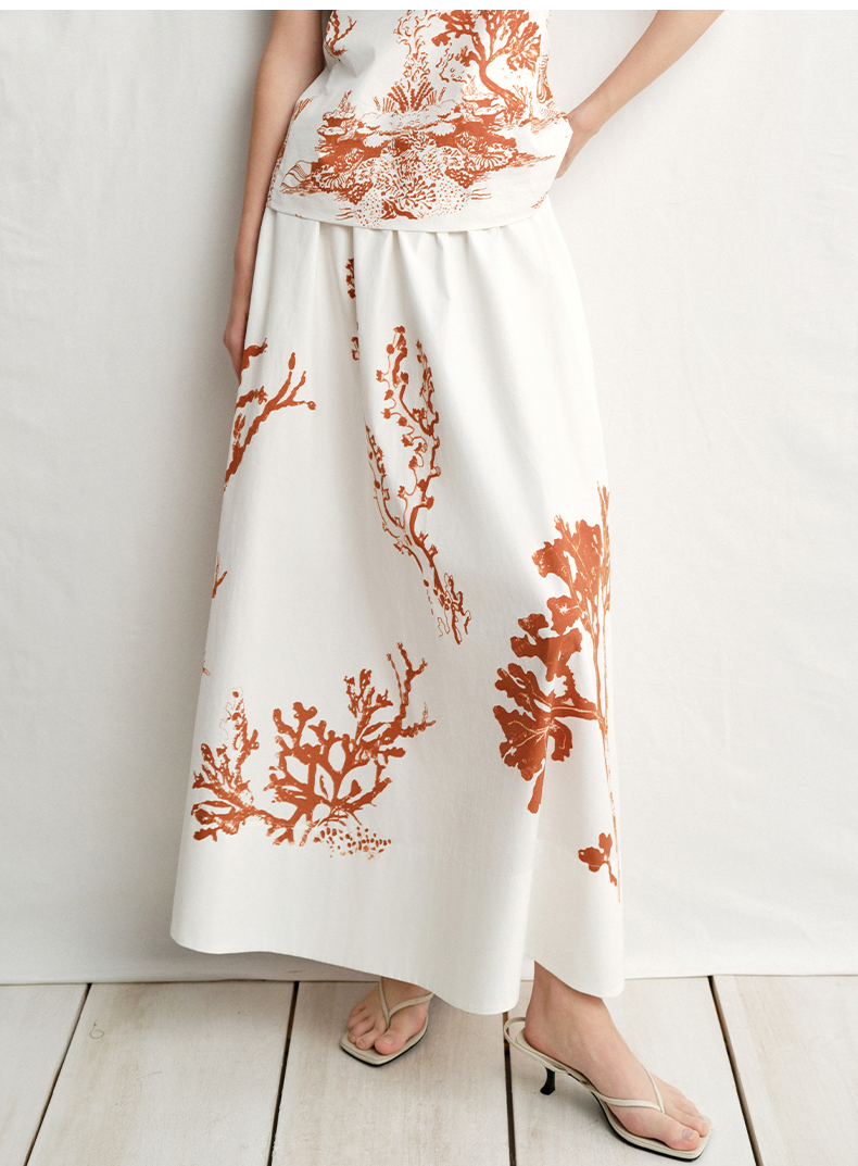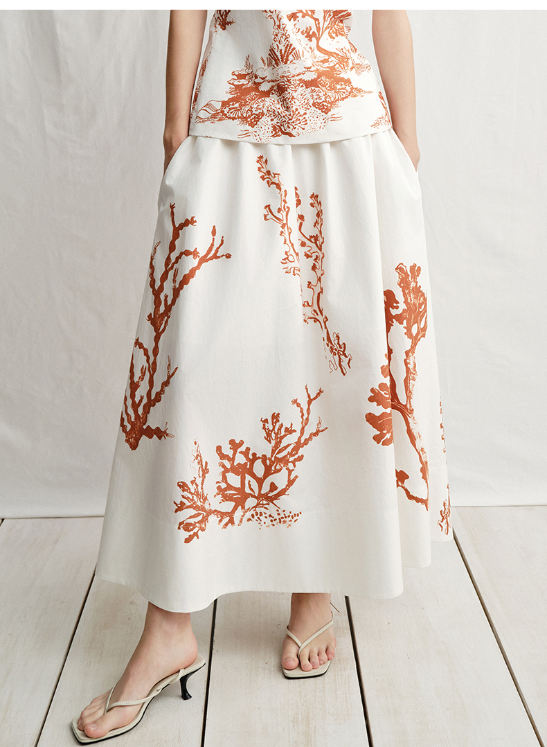 VIMAGE纬漫纪度假风珊瑚印花高腰浪漫显瘦A字半身裙2025夏季新款V2306917