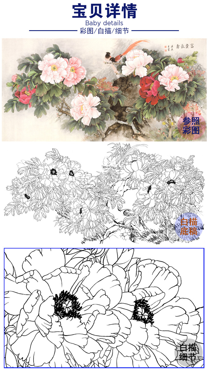 横幅工笔花鸟白描底稿-梁燕生-牡丹绶带鸟《富贵长寿》-多种白描尺寸可选-A006