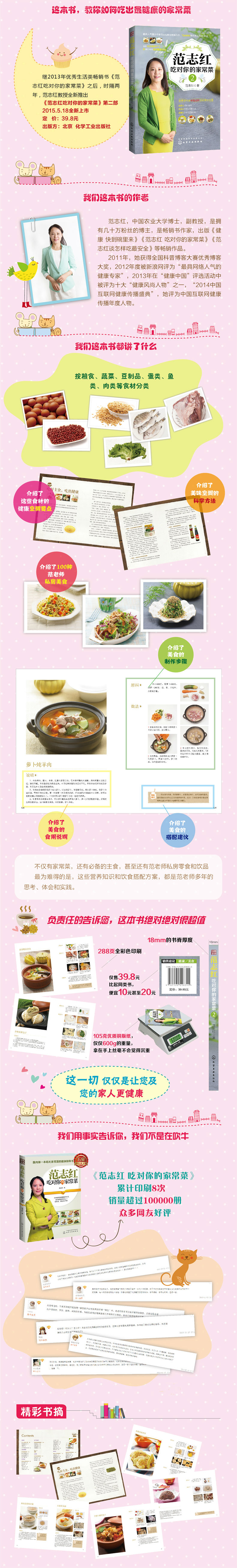 《范志红:吃对你的家常菜2》是范志红老师继畅销书《范志红吃对你的家常菜》后推出的的第二部家常菜谱。书中全新收录了近百道范老师私房营养家常美食,以全彩步骤图解的方式呈现给读者,希望给更多的读者带来切切实实的美味和健康。《范志红:吃对你的家常菜2》按照粮食、蔬菜、豆制品、蛋类、鱼类、肉类等食材分类,介绍了各类食物的健康烹调要点,也介绍了饭、粥、煎饼、汤面、炒饭、菜肴、汤羹、零食、饮料等如何兼顾健康和美味的要点。这些知识和方案,都是作者多年思考、体会和实践的结果。书中的每一道主食、菜肴和饮品,都出自作者本人的私家菜谱,其中绝大多数的食材配方和烹调方法,或是作者原创,或是经过作者修改而改善健康特性。书中的每一道食物,不仅有详细的制作方法和图片,还有细致的解释和叮咛,帮助读者理解为什么要选择这些食材,为什么要这样烹调处理,哪些细节是健康的关键。跟着范老师,吃对你的家常菜,吃出全家人的健康!