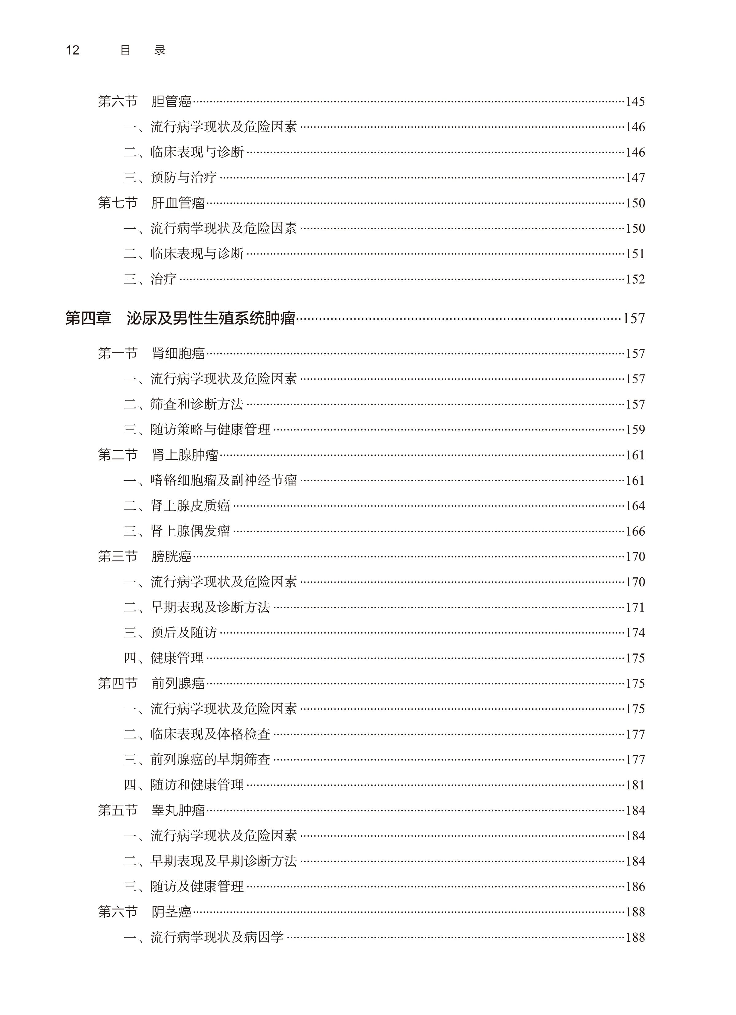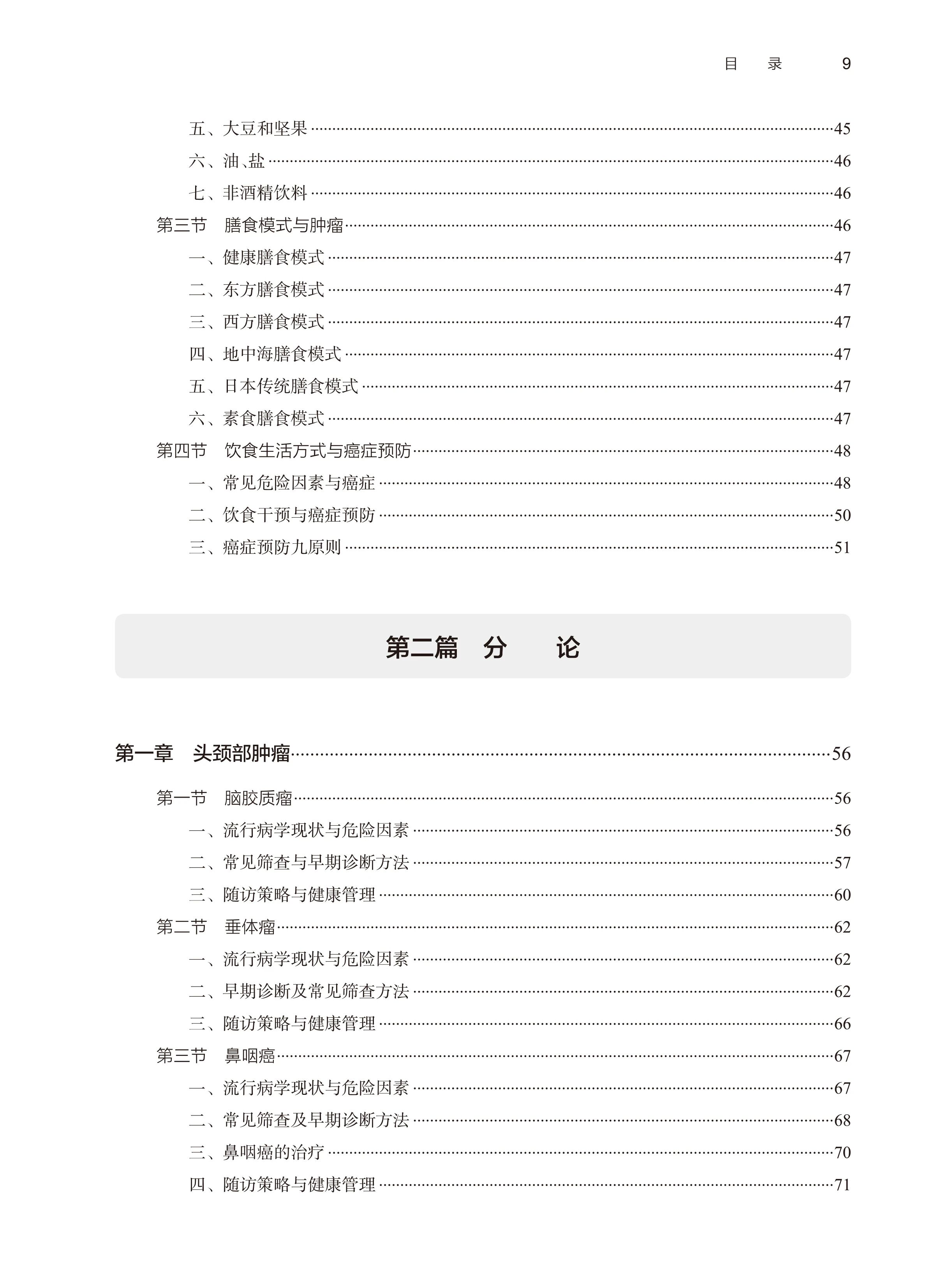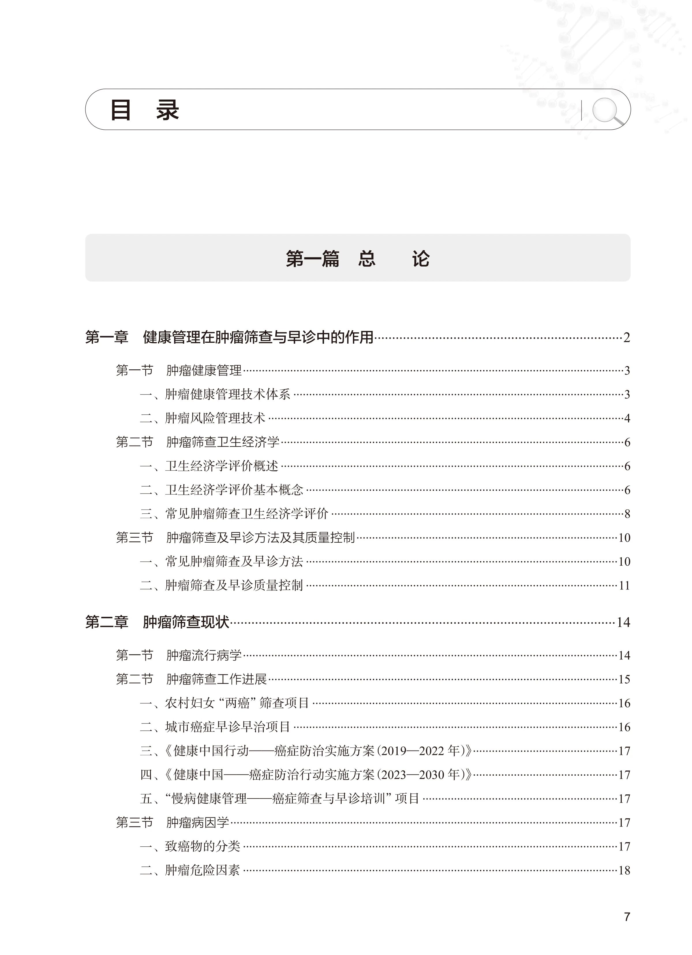 本书一共分为2篇,“总论”与“分论”。“总论”部分具体包含了肿瘤的流行病学,健康管理在肿瘤心理学、肿瘤营养学中的应用。“分论”中为各系统常见恶性肿瘤,包含肺癌、结直肠癌、肝癌、食管癌、胃癌、乳腺癌、子宫颈癌、鼻咽癌和前列腺癌等,每个癌种分别从危险因素、常见筛查与早诊方法、随访策略与健康管理等方面进行了阐述。按照不同系统,选取我国发病率较高或预后较差的癌种,结合实际的癌症筛查工作的经验及研究成果,提出相关的规范化的筛查路径及程序,实用强性强,获益大且覆盖范围广泛
