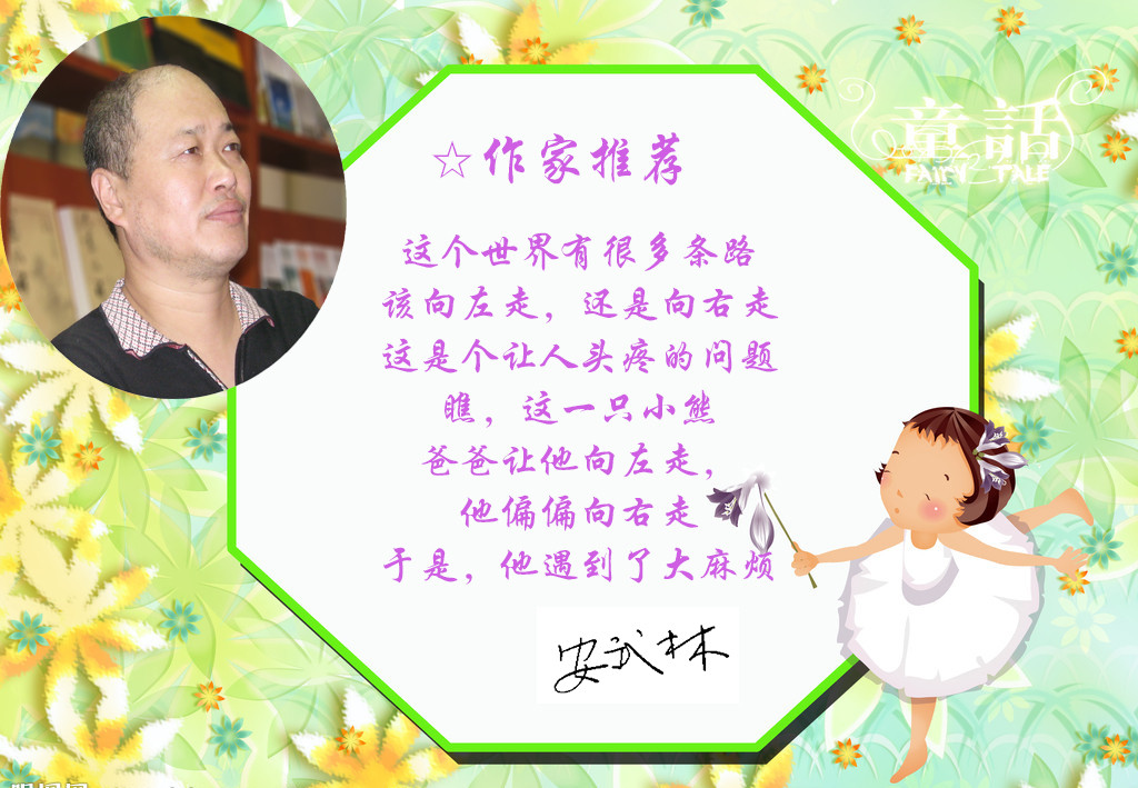 安武林,中国作家协会会员,中国寓言文学研究会副会长。出版过小说《泥巴男生》,散文集《肚子里的虫子》,散文诗集《月亮花》,童话集《老蜘蛛的一百张床》,诗集《月光下的蝈蝈》,随笔集《爱读书》,绘本《麻花小熊》等。