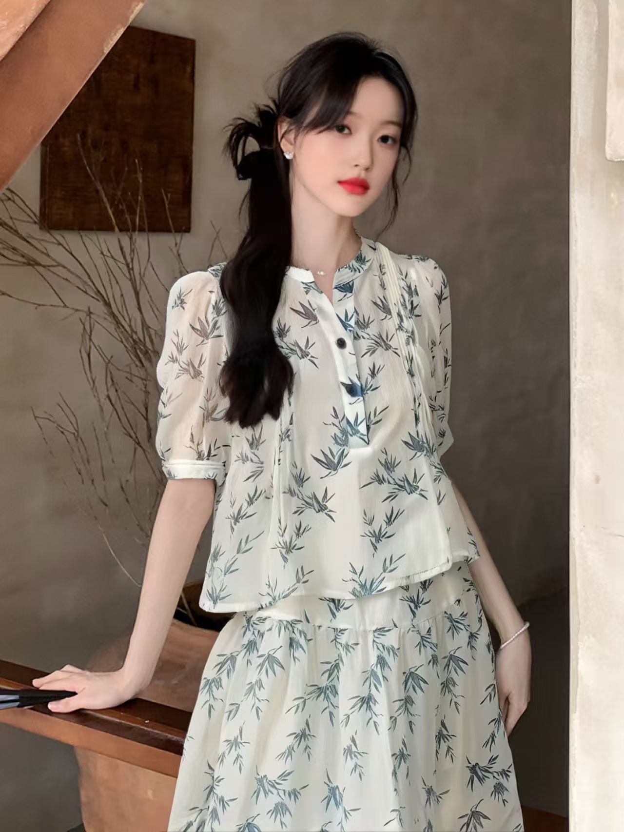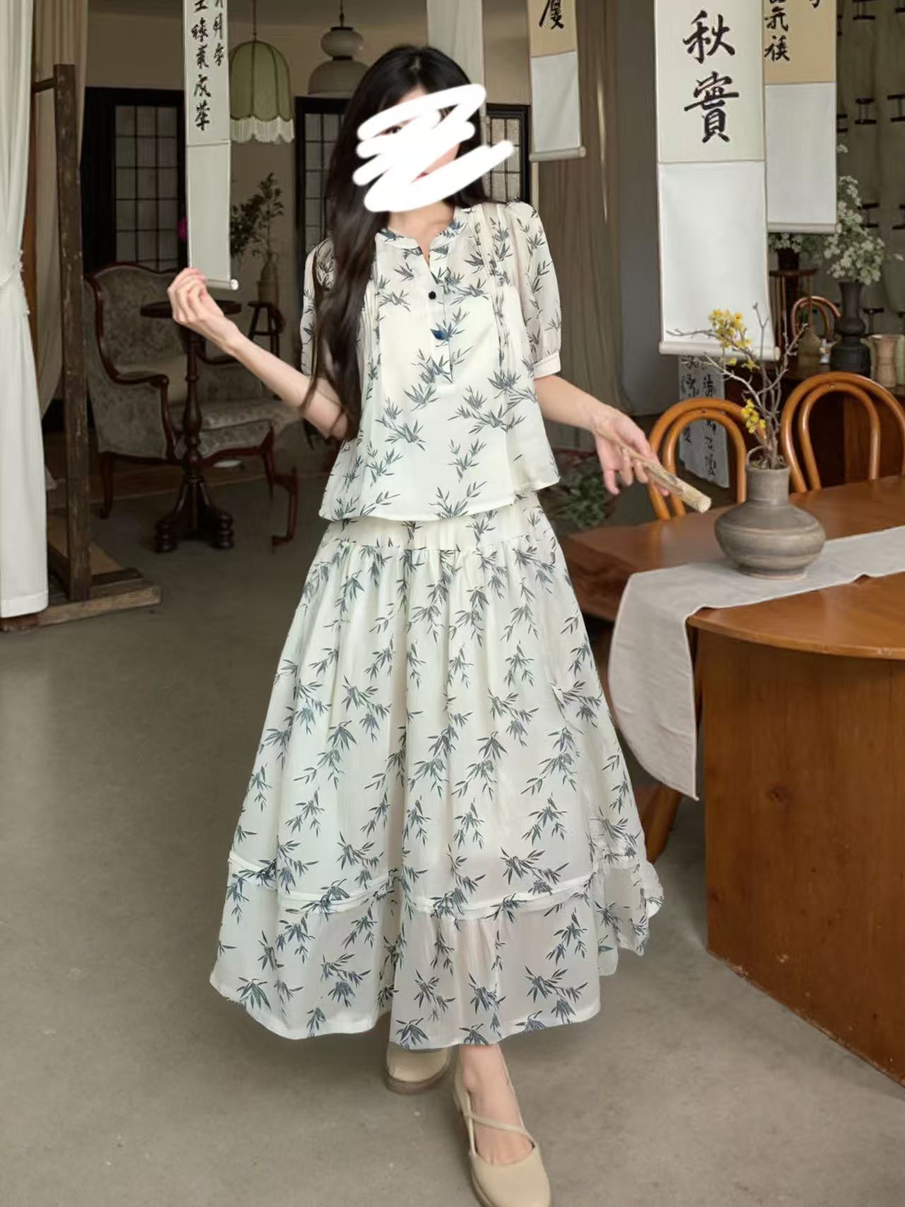 七夕节清仓 天丝面料!!【三件套】超美推荐 雅致竹叶款春夏短袖上衣+吊带+连衣裙套装-喜出