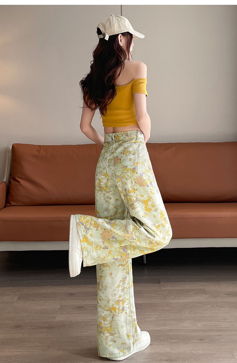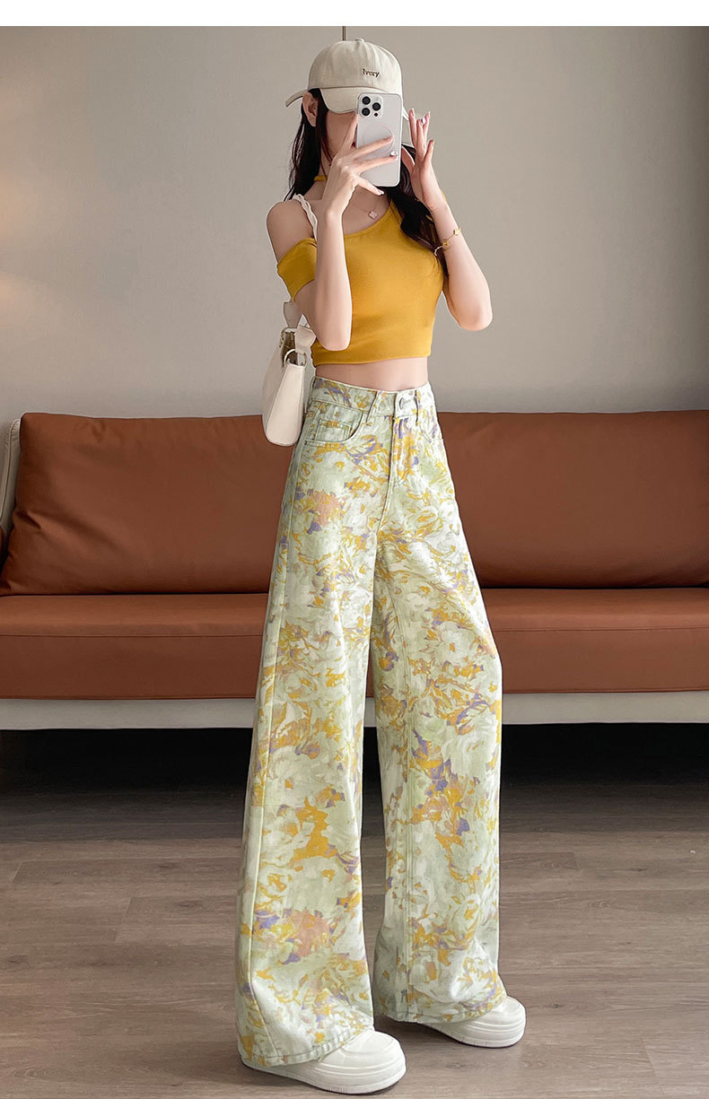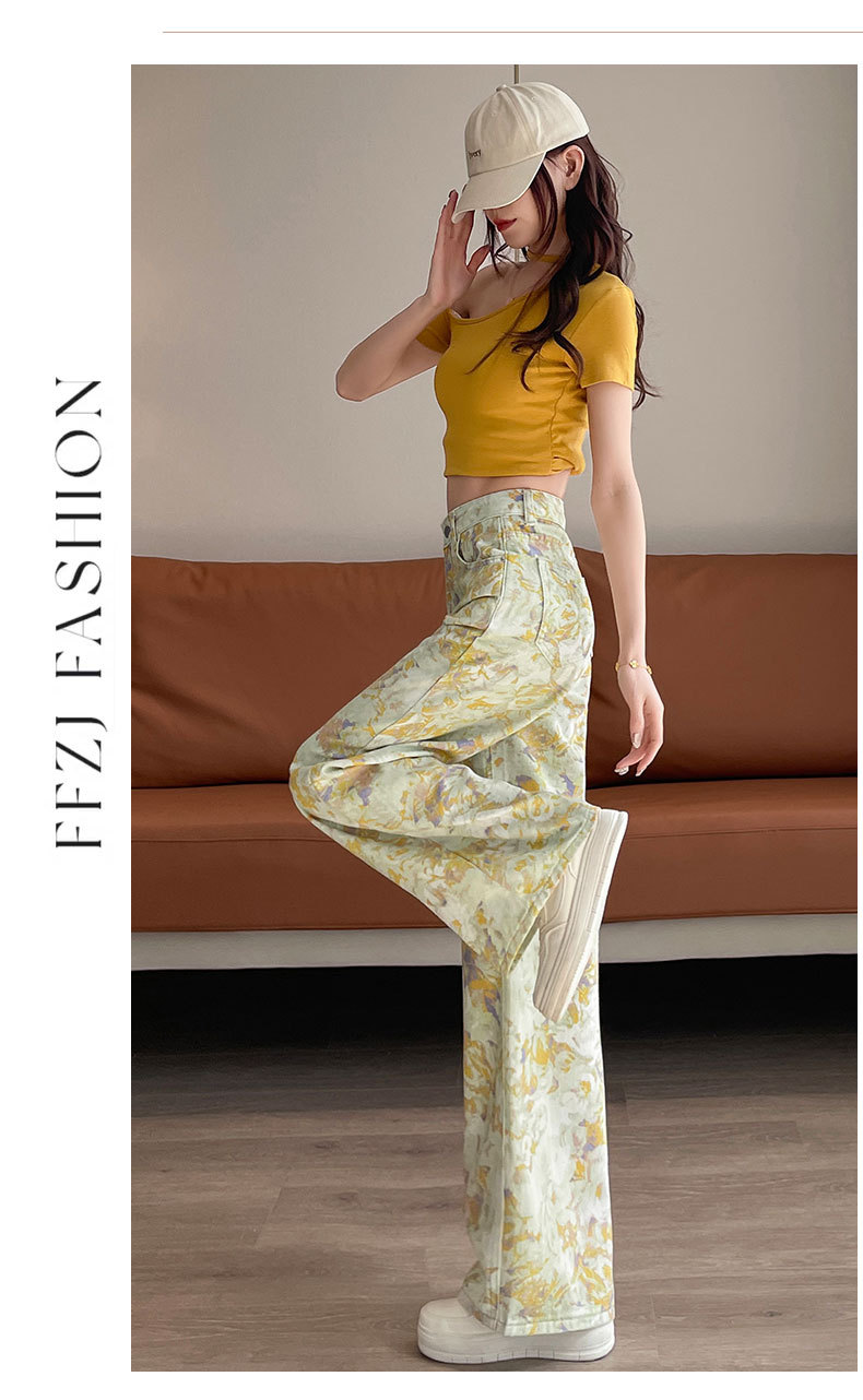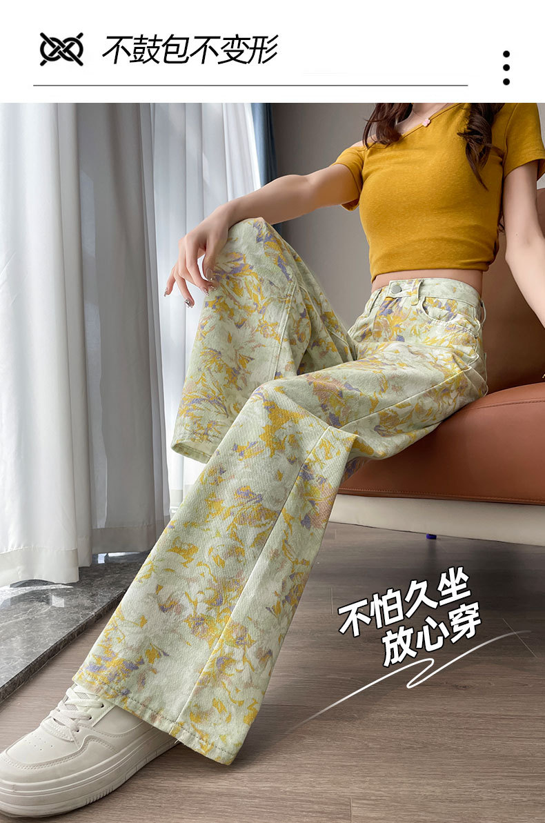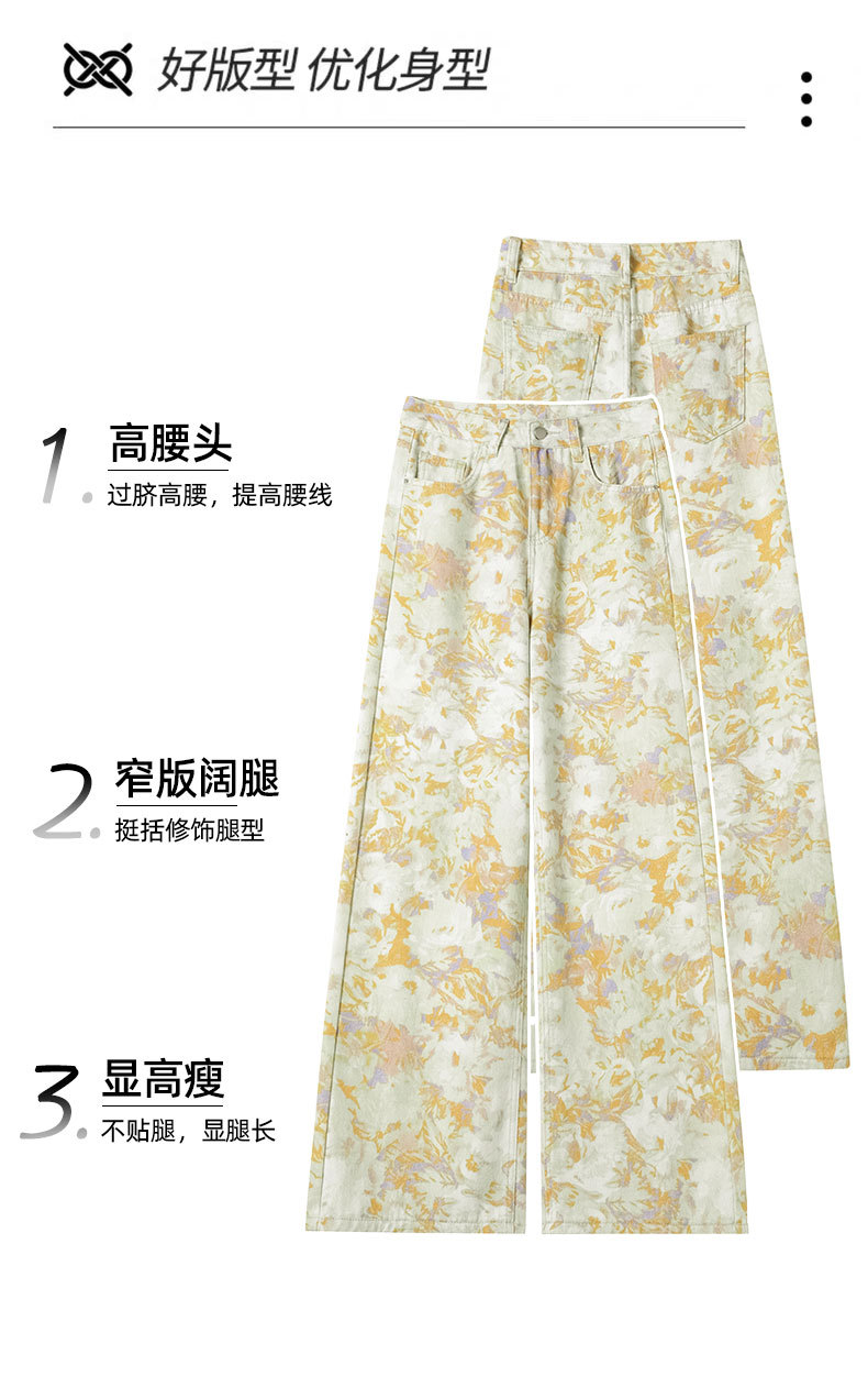 雀说黄色扎染印花阔腿牛仔裤今年流行高腰感小众碎花直筒裤AL6763
