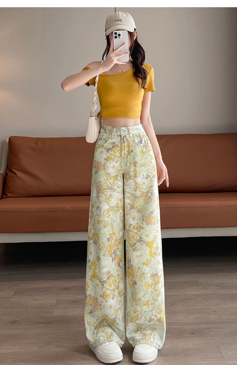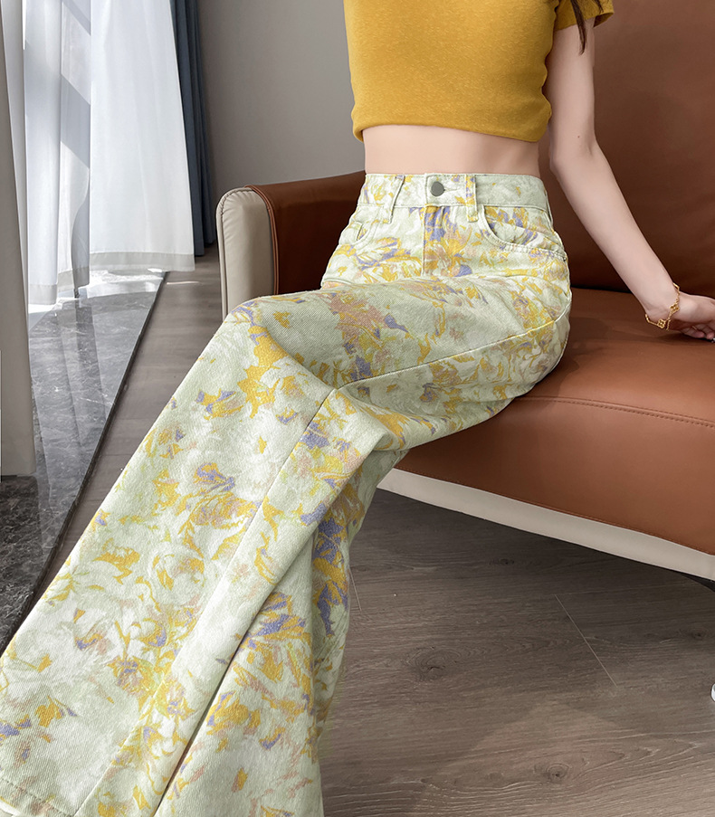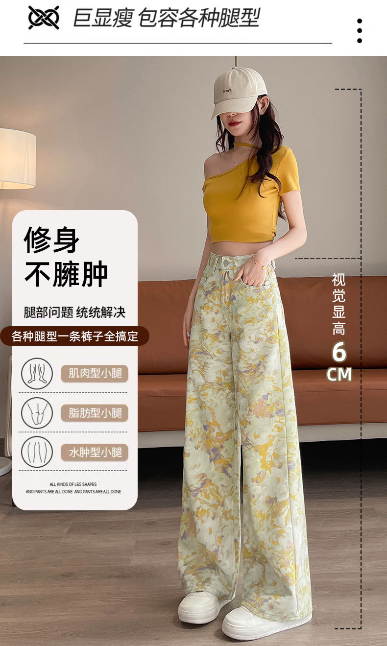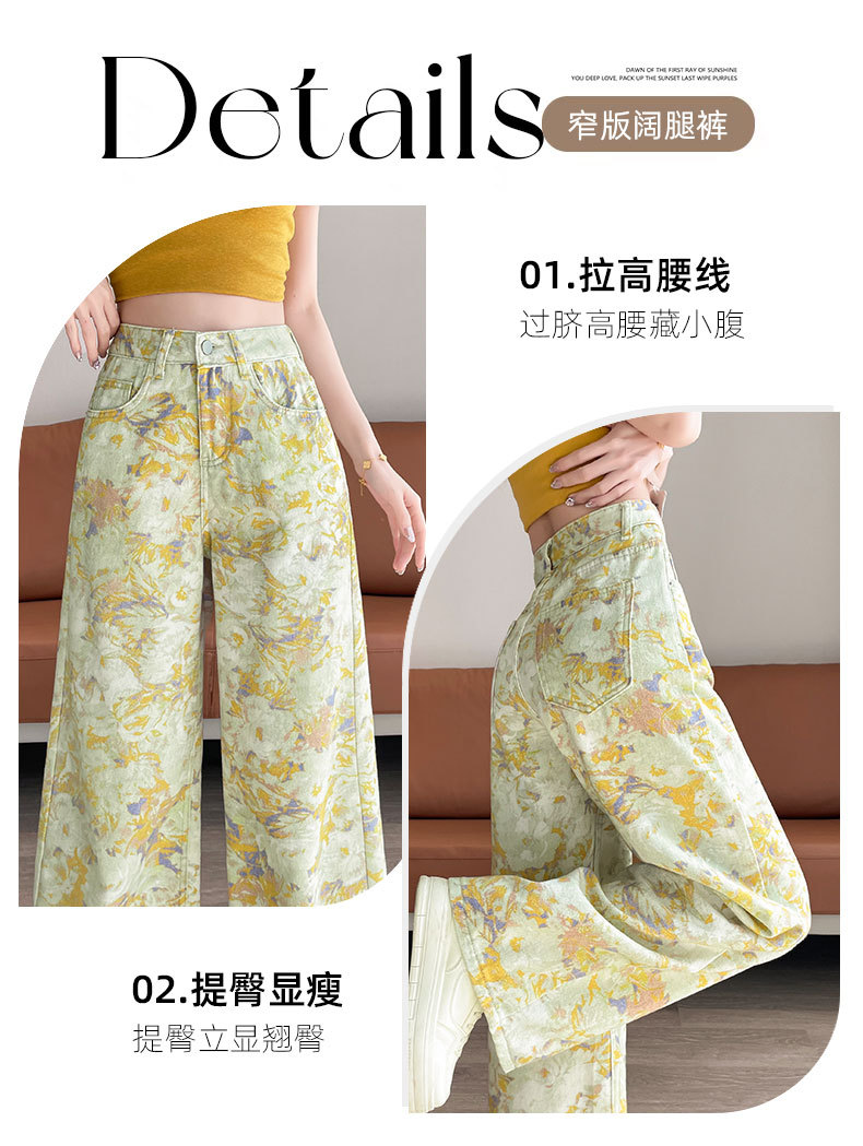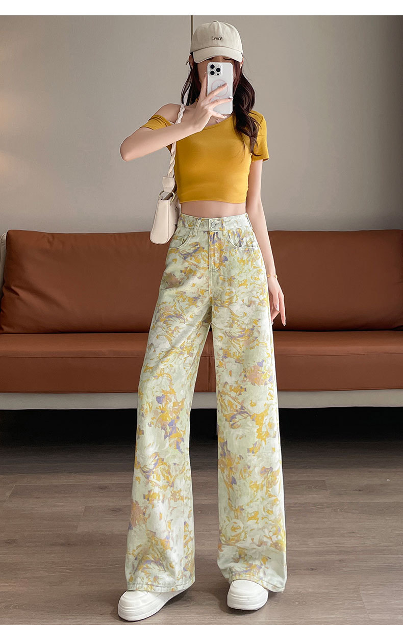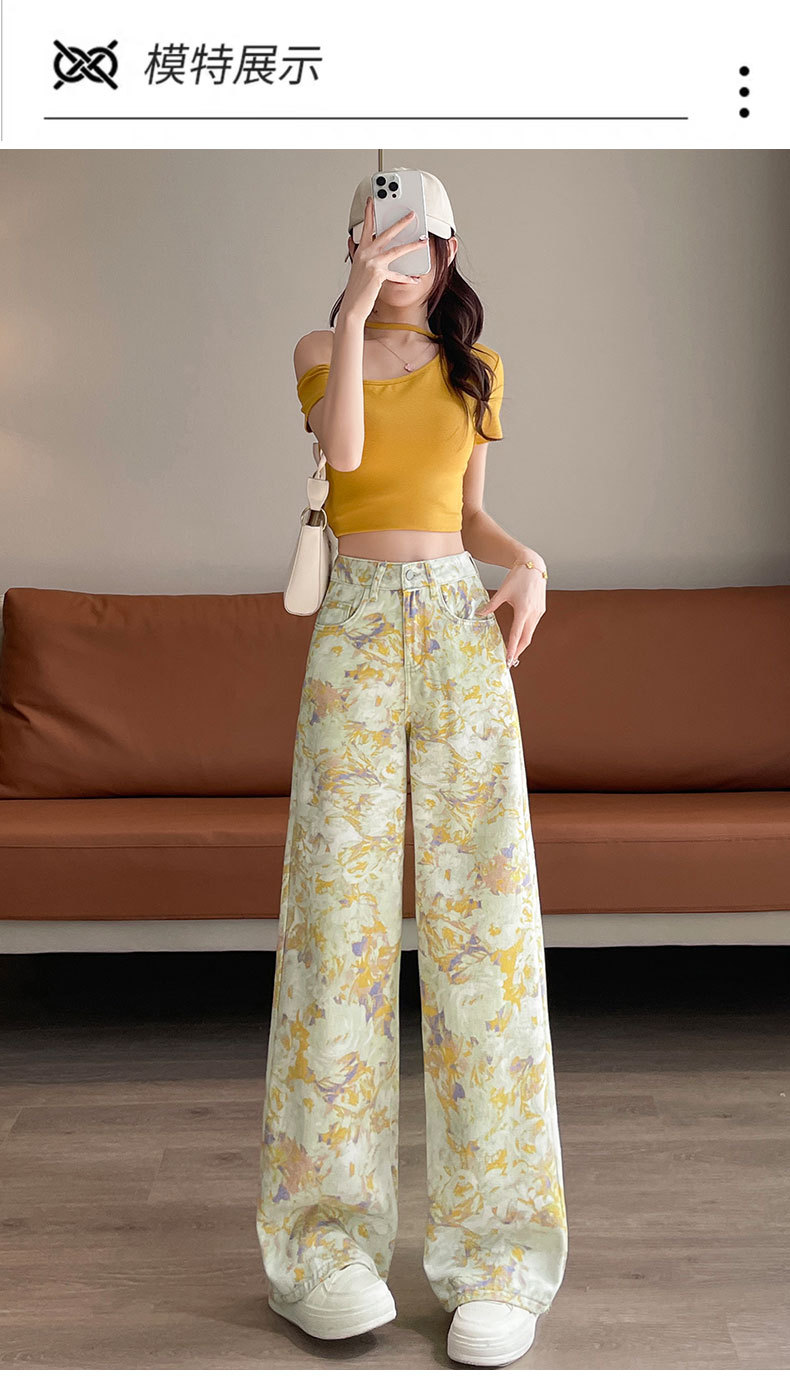雀说黄色扎染印花阔腿牛仔裤今年流行高腰感小众碎花直筒裤AL6763
