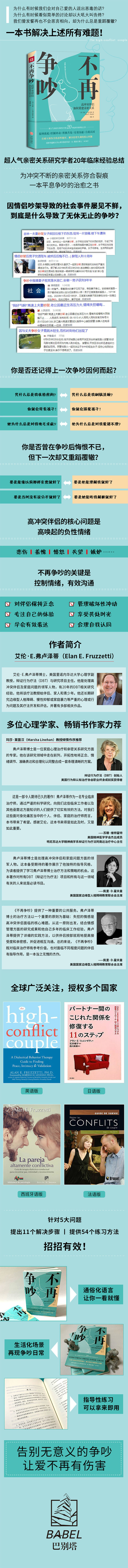 推荐序没有哪一段感情会一直一帆风顺,恰恰相反,所有的亲密关系中有冲突和过度的消极情绪,而感情中的问题总会在某个时刻影响每一个人。一段高冲突的感情令人筋疲力尽,会使双方感到痛苦、孤独。不幸的感情往往会给人带来比常人更高的抑郁感和焦虑感,而生长在冲突严重的家庭中的孩子也更有可能出现心理问题,甚至会有自杀倾向。本书探讨了如何改善爱人间的亲密关系,从而使我们的家庭更加幸福。本书是根据辩证行为疗法(Dialectical Behavior Therapy,简称DBT)的原则编写的。该疗法是由华盛顿大学首创的心理治疗方法,其治疗效果已经被大量临床实践所证实。本书作者艾伦·弗卢泽蒂是首个DBT治疗团队的成员,他和团队中的其他成员为DBT 提供了第一个批判性反馈。该疗法能发展至今,他们功不可没。艾伦有 20 年的DBT相关工作经验,他将该疗法教授给伴侣、不同家庭的成员和青少年,并根据这些人群的实际情况对DBT进行相应的调整。然而,目前几乎所有关于DBT的研究集中在如何将该疗法应用在个体身上,很少涉及家庭层面的研究。可以说,目前关于如何将 DBT 应用于伴侣和家庭关系上的文献寥若晨星。弗卢泽蒂博士是一位伴侣、家庭心理治疗和亲密关系研究方面的专家。他在该研究领域中走在前列,开拓性地将正念、情绪调节、准确表达和合理化认同整合成一套条理清晰的方案。他撰写了数十篇专业论文,参与编写多部专著。这些作品的内容不仅包括对DBT理论自身的探讨,也包括从DBT的角度分析伴侣、家人之间的互动和治疗方案。在本书中,弗卢泽蒂博士将他在伴侣关系治疗上的专长与在DBT方面的专业知识结合在了一起。本书采纳了辩证行为疗法中非评判的方法,以提高对自我和伴侣的接受度。这种方法可以帮读者掌握对自身和伴侣的正念、提高自我合理化认同。同时,本书也着眼于改变,例如减少对自身和伴侣行为的非合理化认同和消极反应,以及增强对本人情绪的自我调整能力,提高表达自己感受和行为的能力,培养更有效处理问题的技能。此外,本书还着重介绍了接受策略和改变策略及其融合,以期切实地帮助读者提升对自己或他人的合理化认同能力。必须指出的是,本书建立在完备的心理学原理和研究的基础上,其中包括对基本情绪过程的研究、伴侣互动研究以及大量辩证行为疗法的评估性研究。由于真正建立在研究基础上的同类书籍少之又少,因此本书自然脱颖而出,显得出类拔萃。对于那些在感情关系中遍体鳞伤却仍满怀希望的配偶或伴侣来说,本书所介绍的方法能充分照顾到他们的需求。对于亲密关系中出现的种种问题,本书提供了贴心而实际的方法和练习,从而帮助读者减少破坏性冲突,让感情更加和谐、甜蜜。