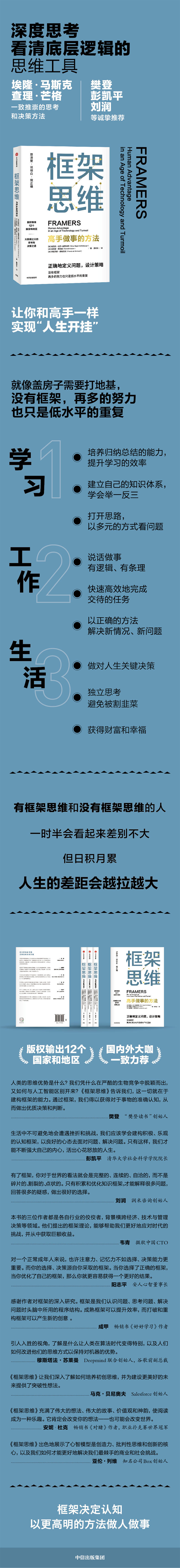 《框架思维》充满了伟大的想法、伟大的故事、价值观和神韵,使阅读成为一种乐趣。它肯定会改变你的想法——也可能会改变世界。