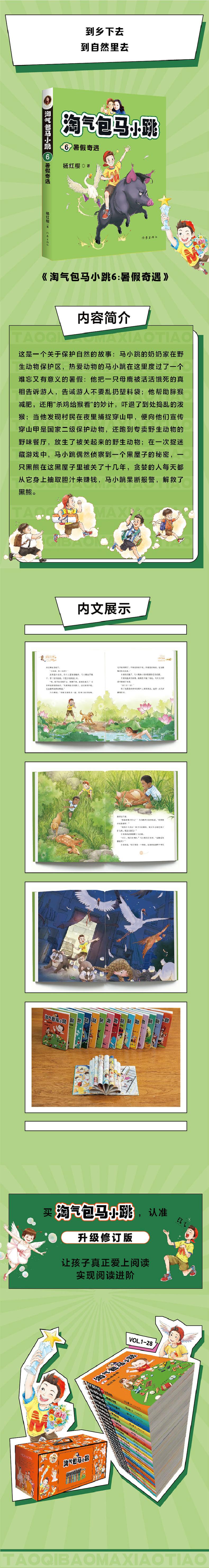 《淘气包马小跳6:暑假奇遇》是童书作家杨红樱所著"淘气包马小跳"系列的第6部:马小跳的奶奶家在野生动物保护区,热爱动物的马小跳,在这里度过了一个难忘又有意义的暑假。他把一只母鹿被活活饿死的真相告诉游人,告诫游人不要乱扔塑料袋;他帮助胖猴减肥,还用"杀鸡给猴看"的妙计,吓退了到处捣乱的泼猴;当他发现村民在夜里捕捉穿山甲,便向他们宣传穿山甲是国家二级保护动物,还跑到专卖野生动物的野味餐厅,放生了被关起来的野生动物,还救了一条珍稀动物娃娃鱼;在一次捉迷藏游戏中,马小跳偶然侦察到一个黑屋子的秘密,一只黑熊在这黑屋子里被关了十几年,贪婪的人每天都从它身上抽取胆汁来赚钱,马小跳果断报警,解救了黑熊。
