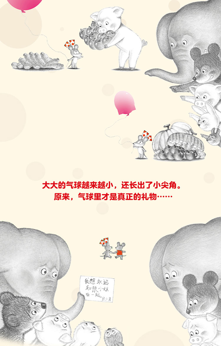 鼠小妹的生日到了,朋友们送了她各种各样的好吃的,鼠小弟却送她一个大大的气球。大大的气球越来越小,还长出了小尖角。原来,气球里才是真正的礼物……