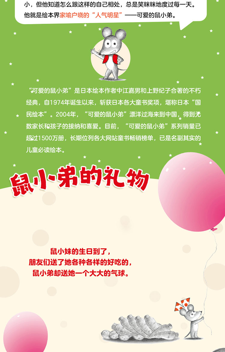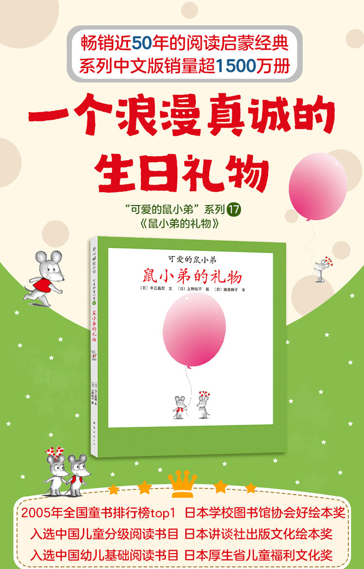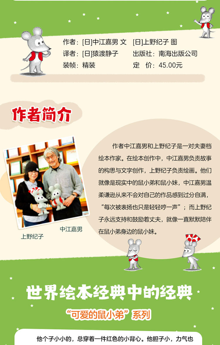 “可爱的鼠小弟”系列是日本绘本作者中江嘉男和上野纪子合著的不朽经典,自1974年诞生以来,斩获日本各大童书奖项——日本学校图书馆协会好绘本奖、日本产经儿童出版文化奖、日本讲谈社出版文化绘本奖、日本厚生省儿童福利文化奖,堪称日本“国民绘本”。