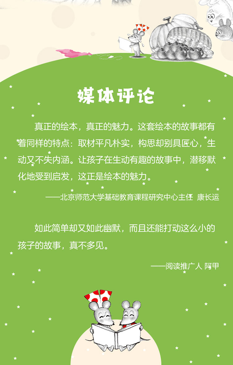 每一本“鼠小弟”都带给我们一个快乐、一个惊喜。每一本“鼠小弟”都在承接着一个延续的主题:在鼠小弟的世界里充满了困惑不解,而这些困惑不解不也正是成长过程中我们的孩子会面临的问题吗?——北京五一幼儿园教学主任 邢爱玲
