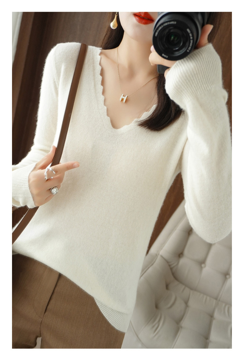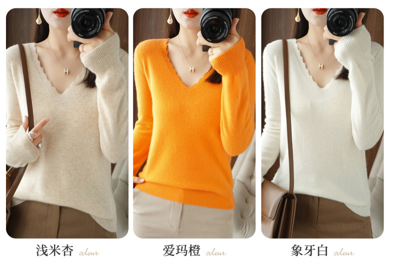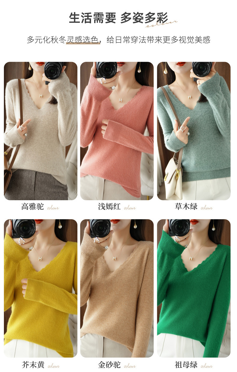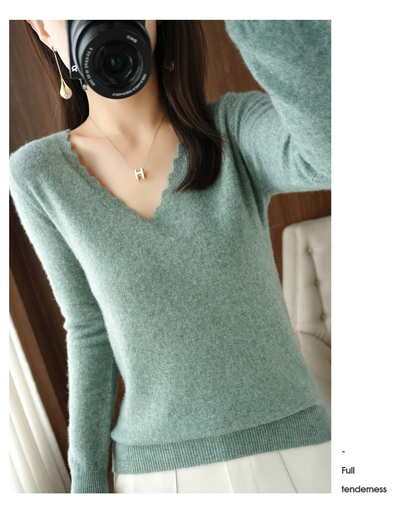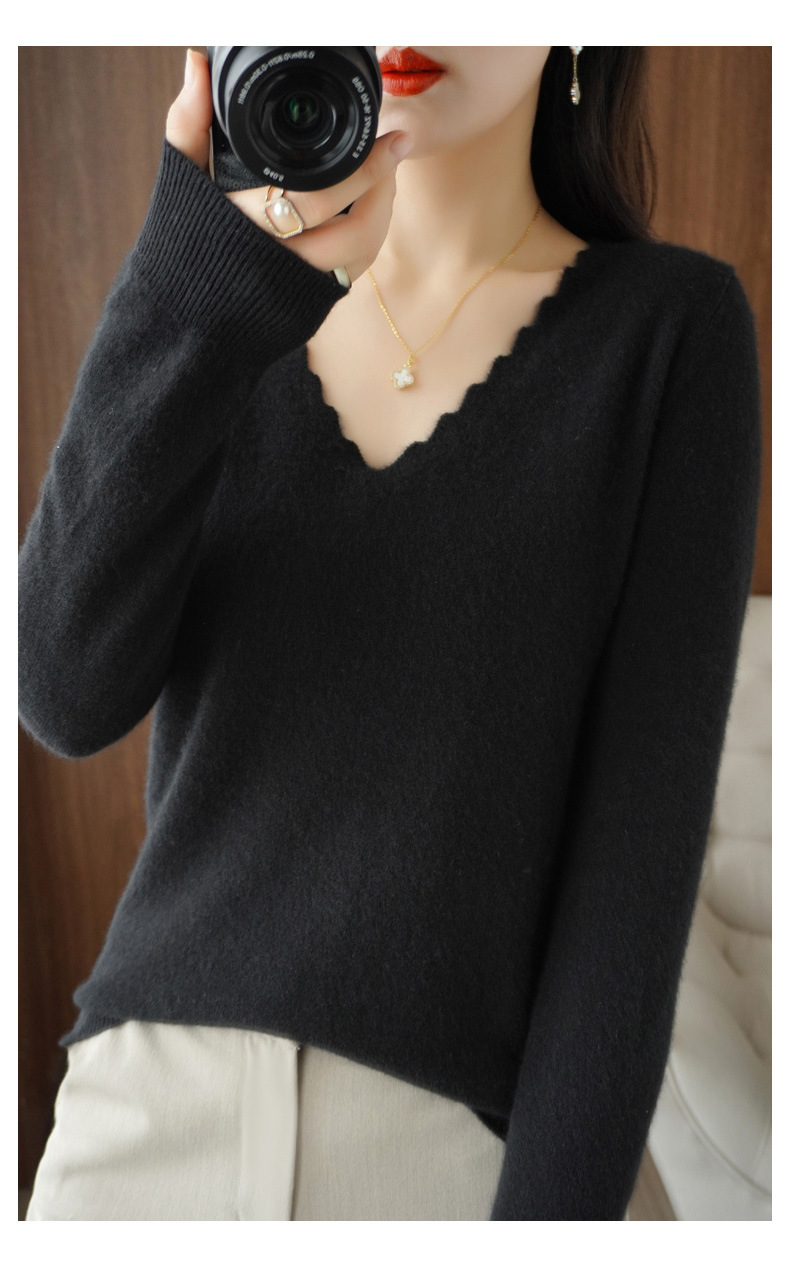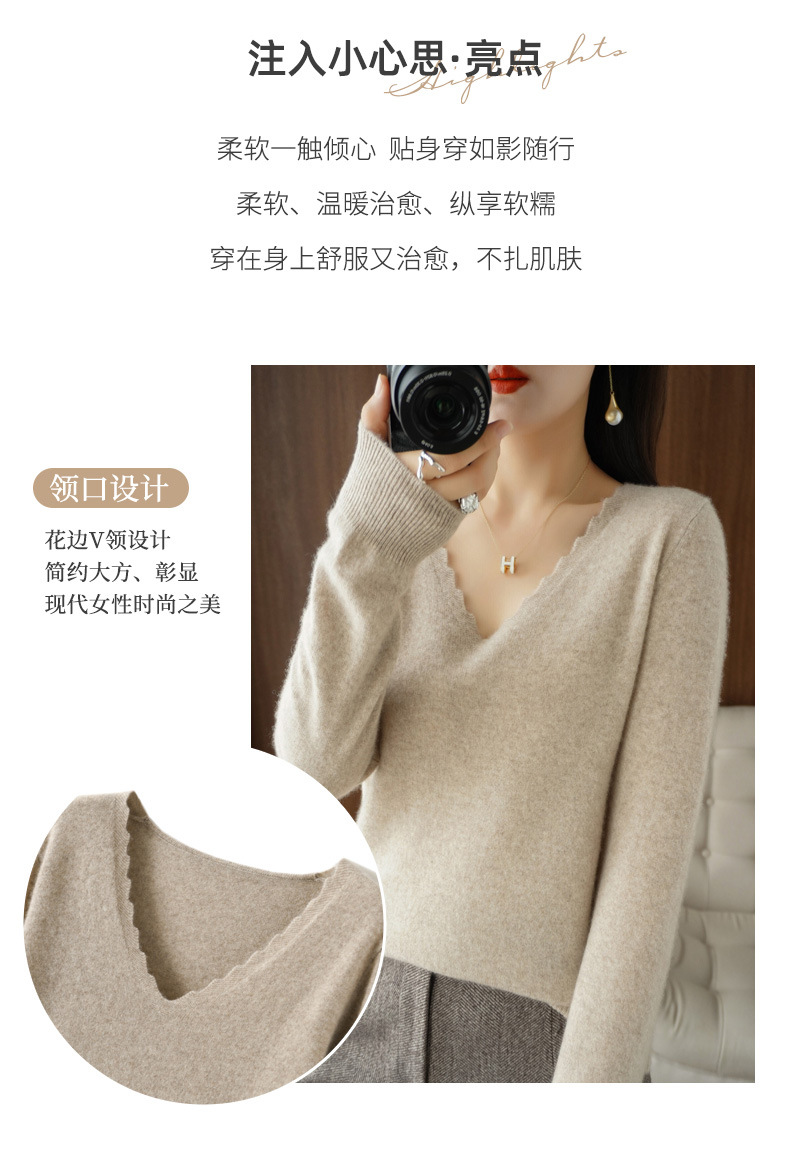 QHJY-JYVL2259秋季新款软糯羊毛针织衫女长袖花边V领修身打底衫毛衣一件