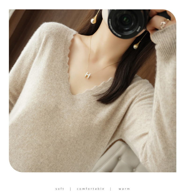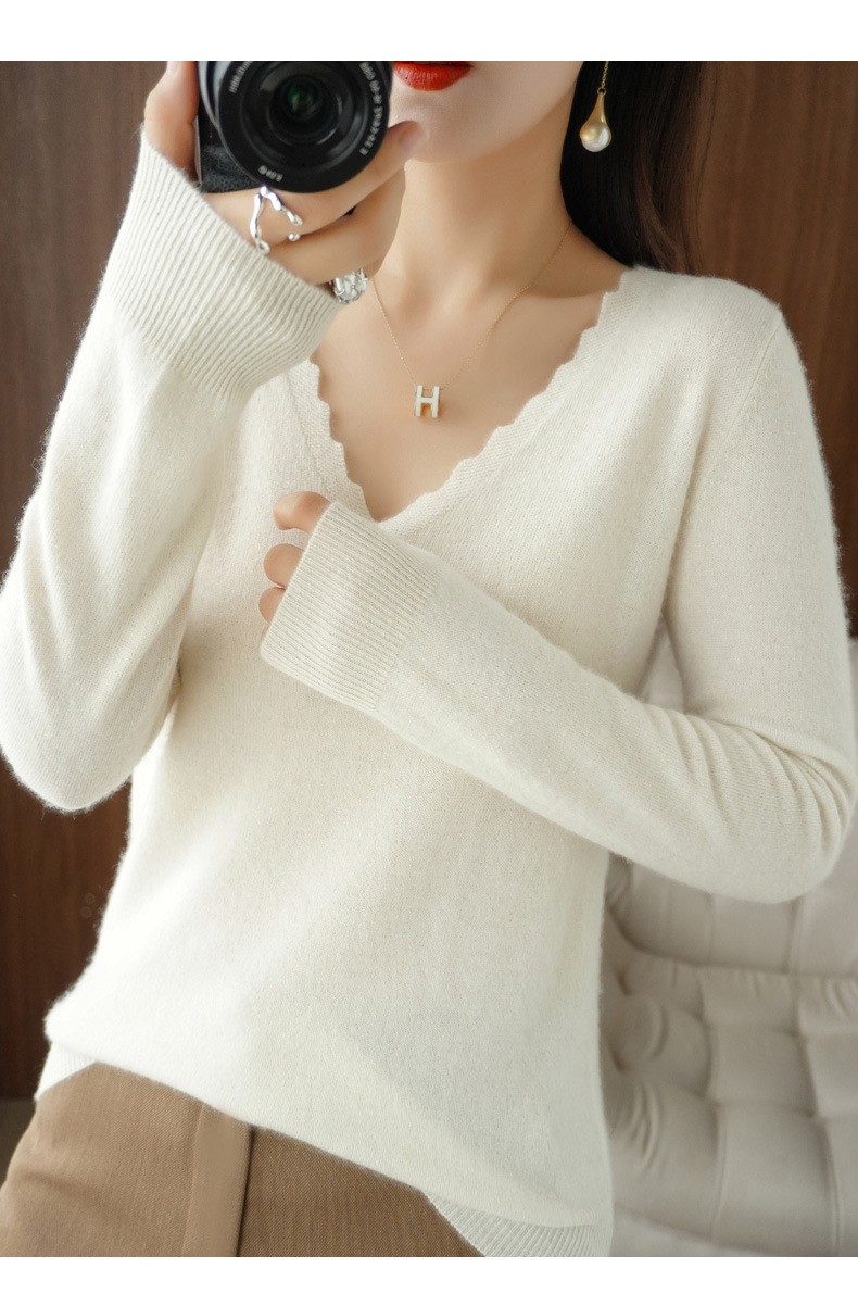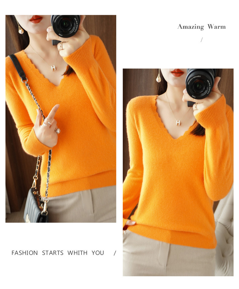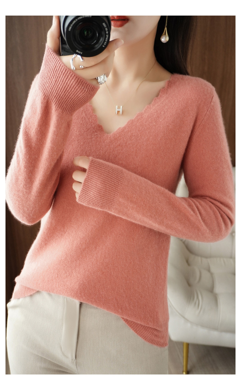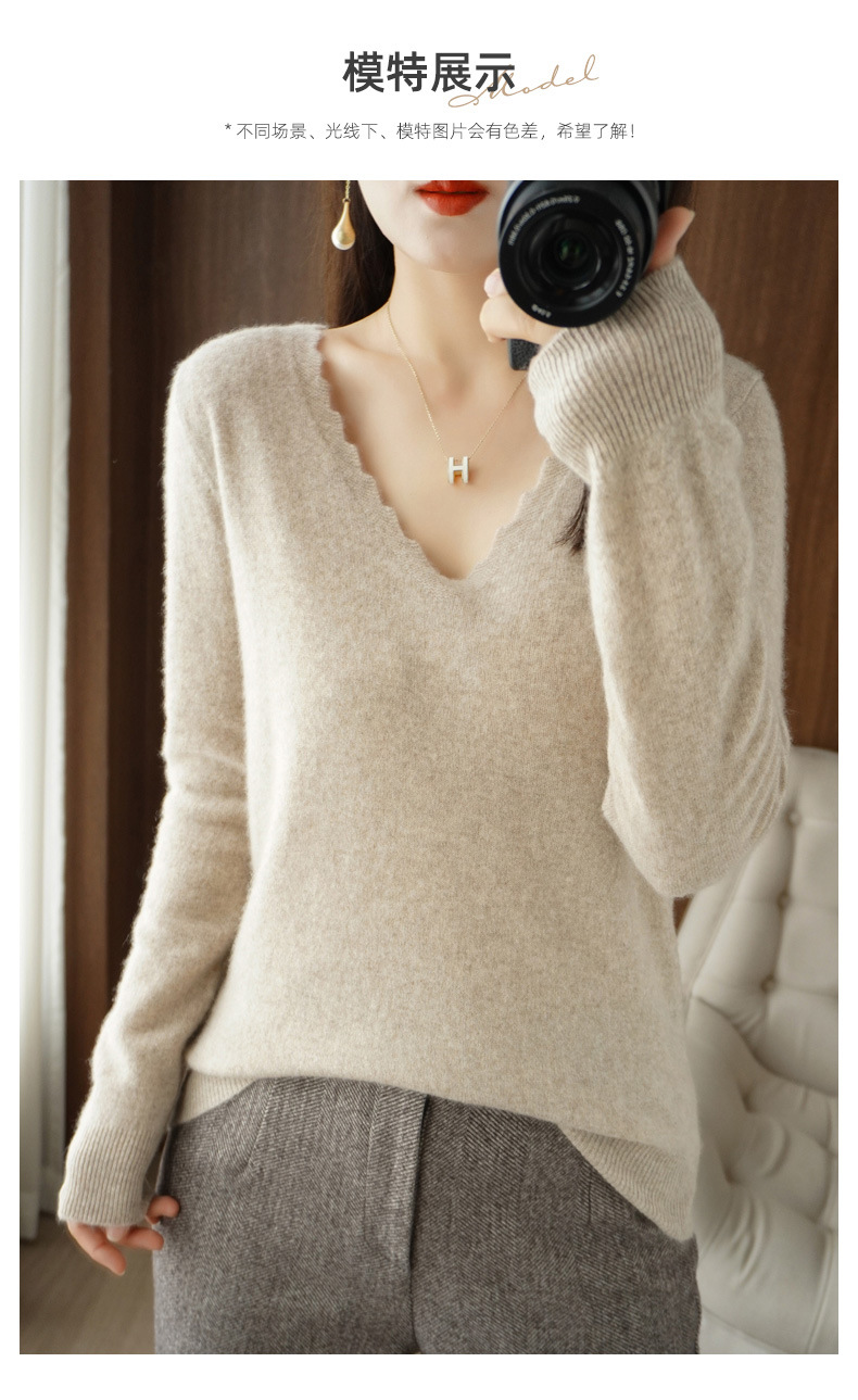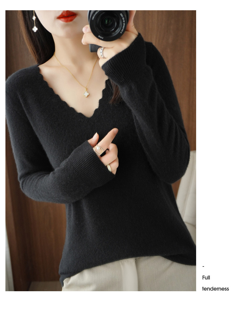 QHJY-JYVL2259秋季新款软糯羊毛针织衫女长袖花边V领修身打底衫毛衣一件
