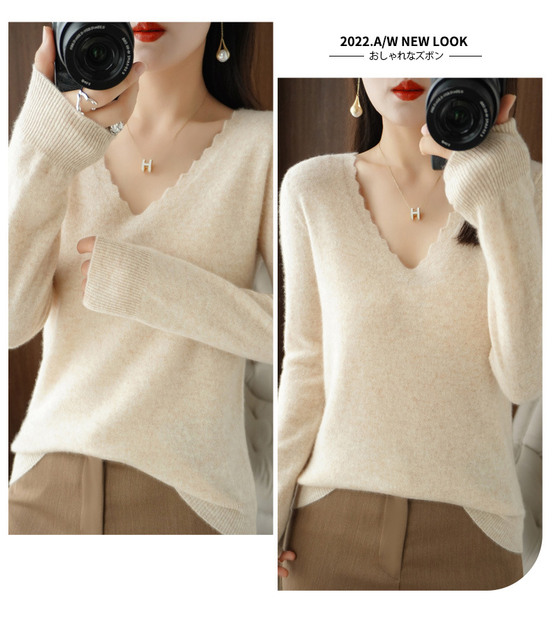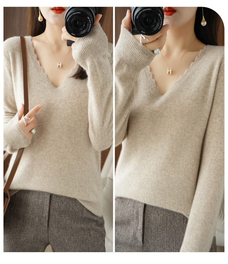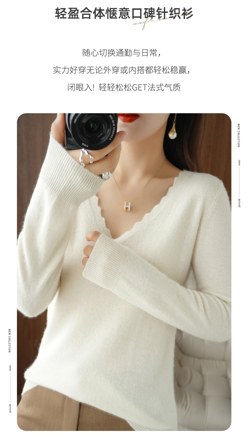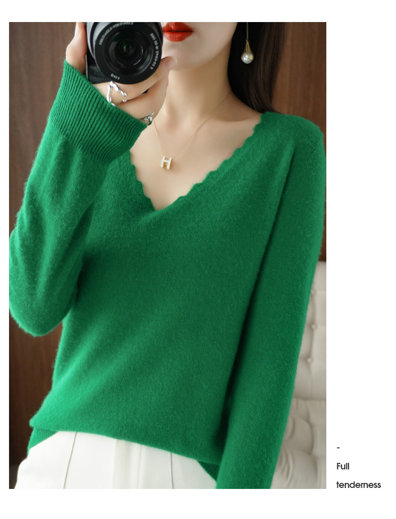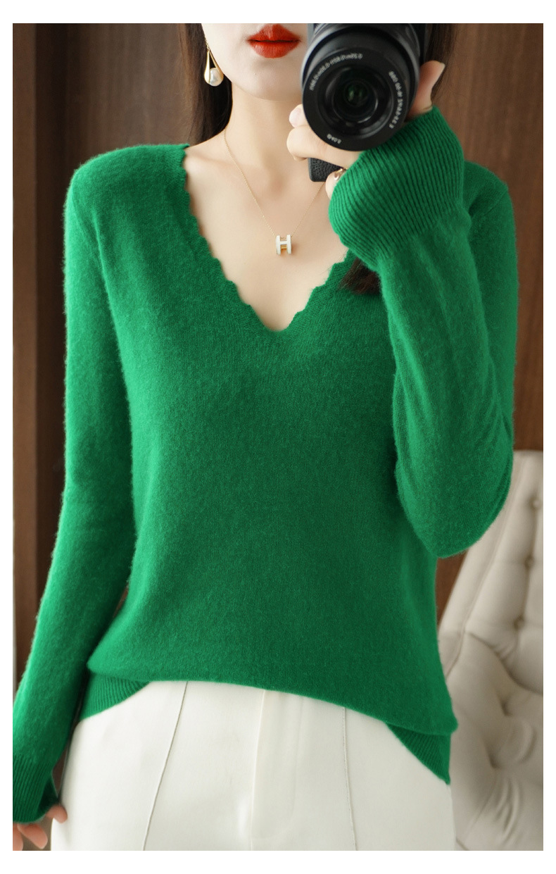 QHJY-JYVL2259秋季新款软糯羊毛针织衫女长袖花边V领修身打底衫毛衣一件