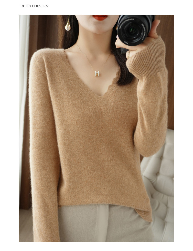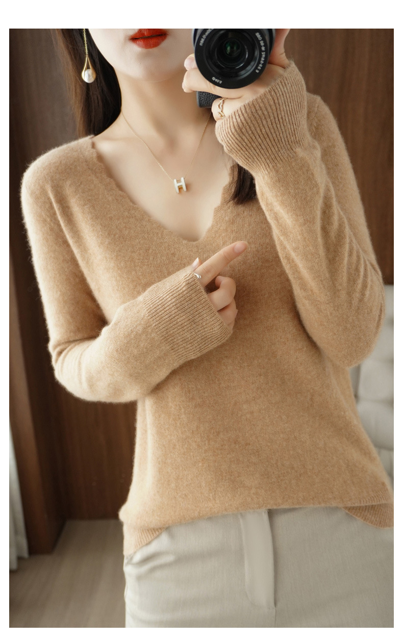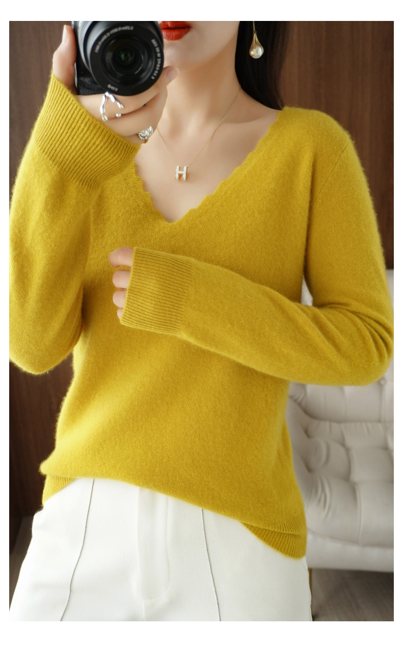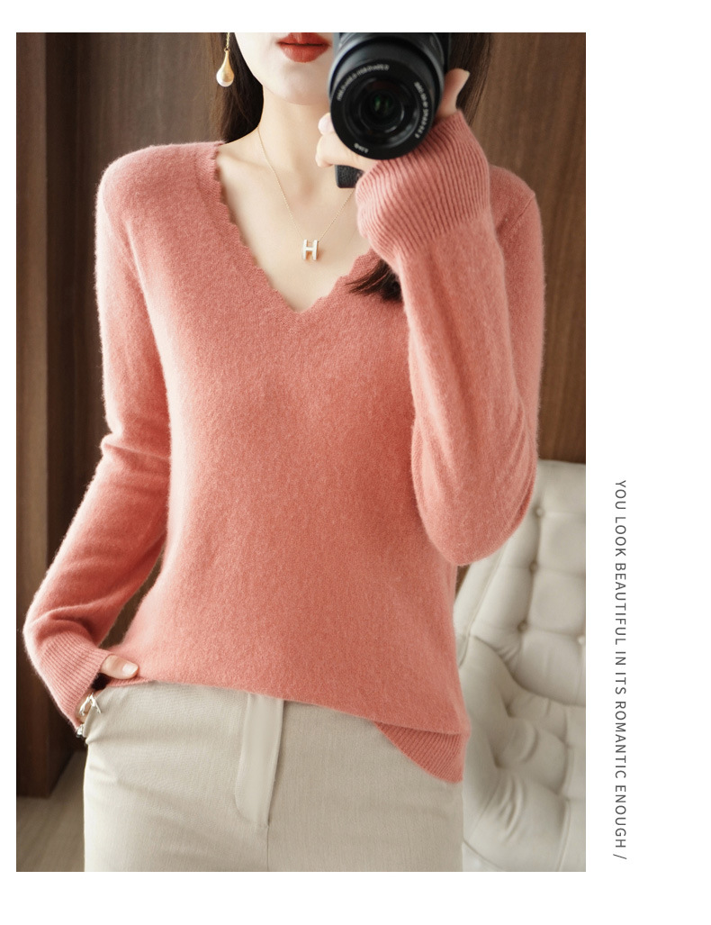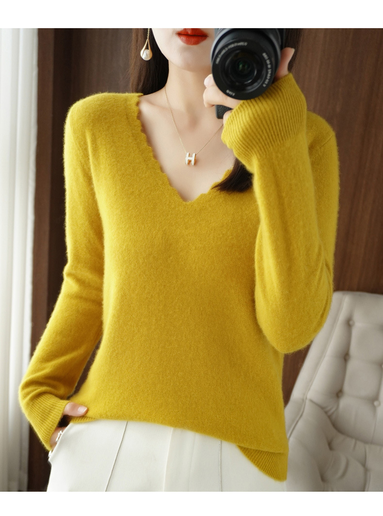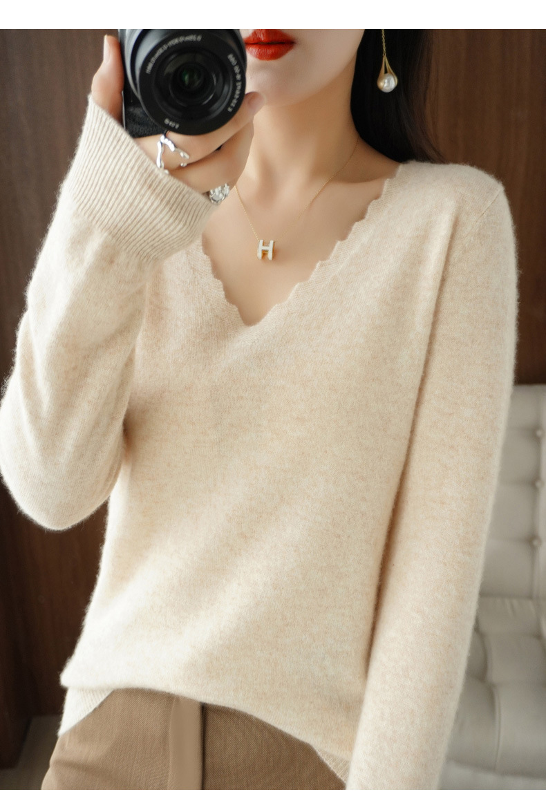 QHJY-JYVL2259秋季新款软糯羊毛针织衫女长袖花边V领修身打底衫毛衣一件