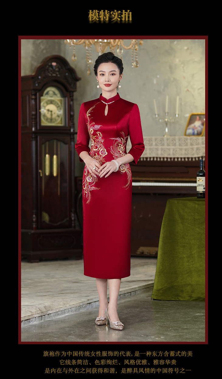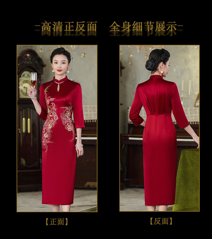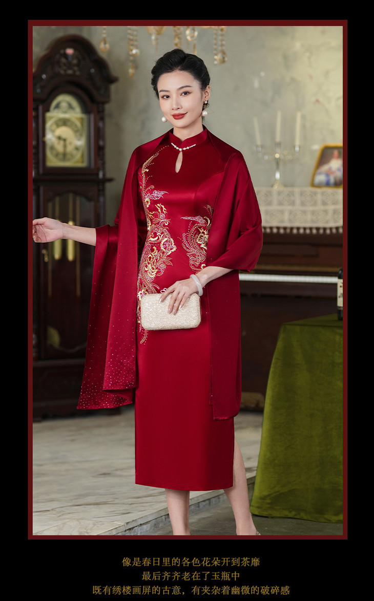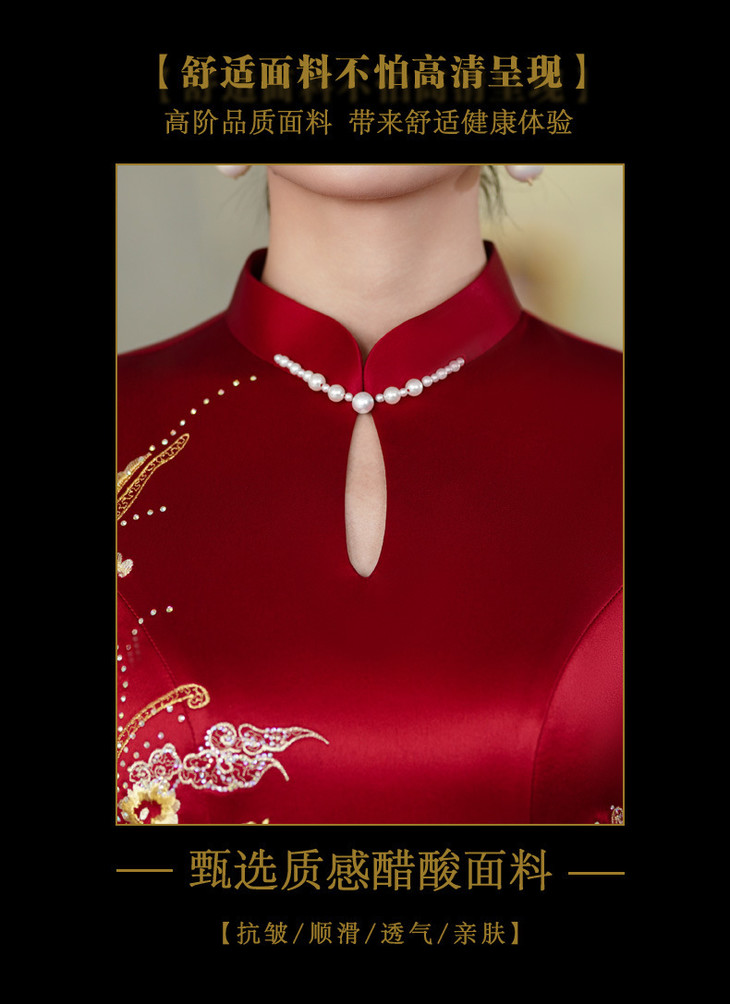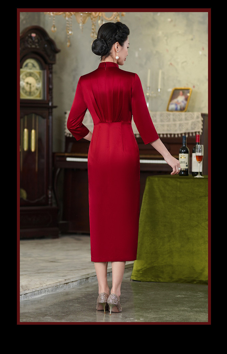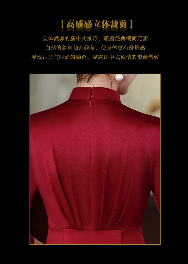 上海旗袍厂酒红色醋酸旗袍婚宴气质主持人年会礼服【9972】