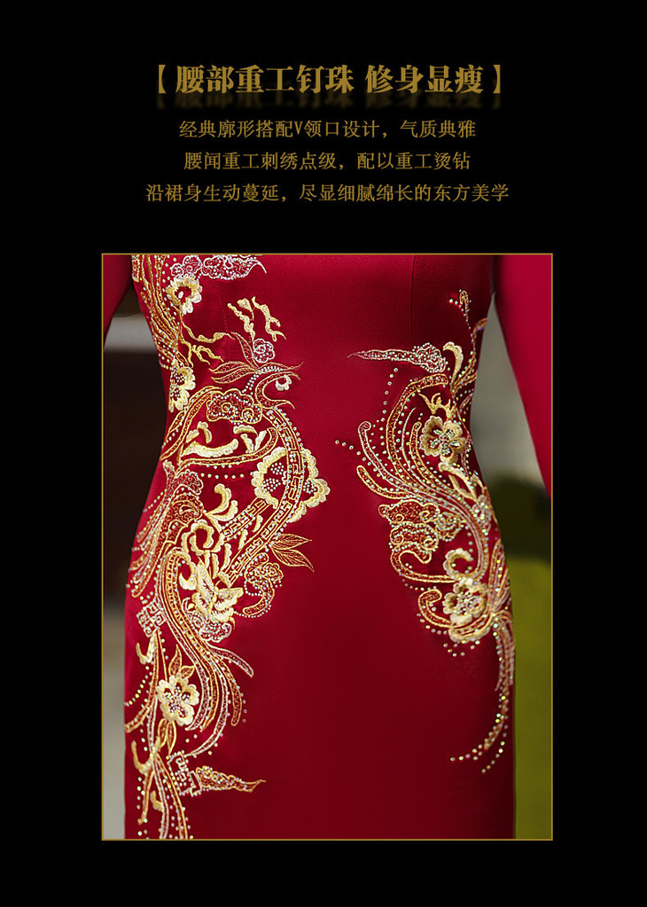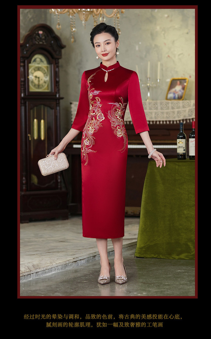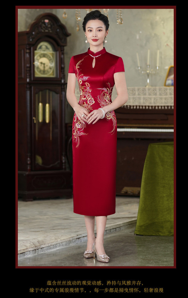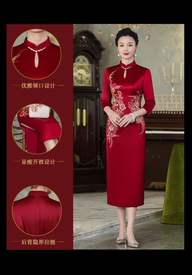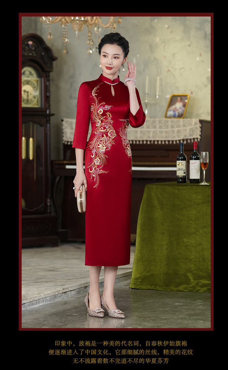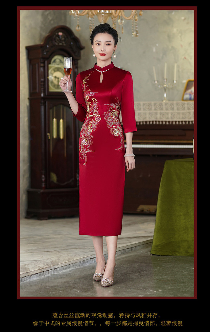 上海旗袍厂酒红色醋酸旗袍婚宴气质主持人年会礼服【9972】