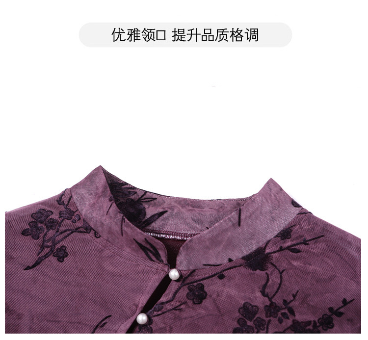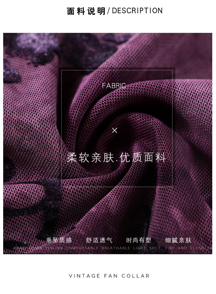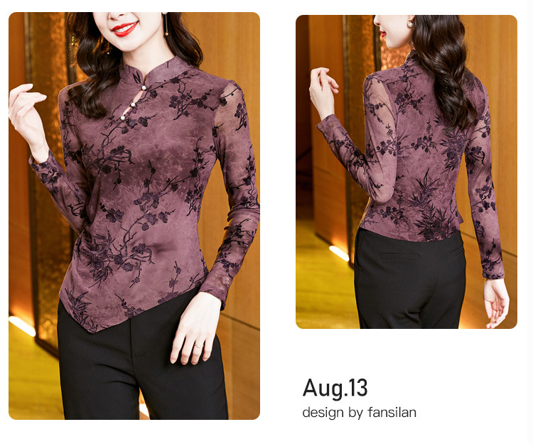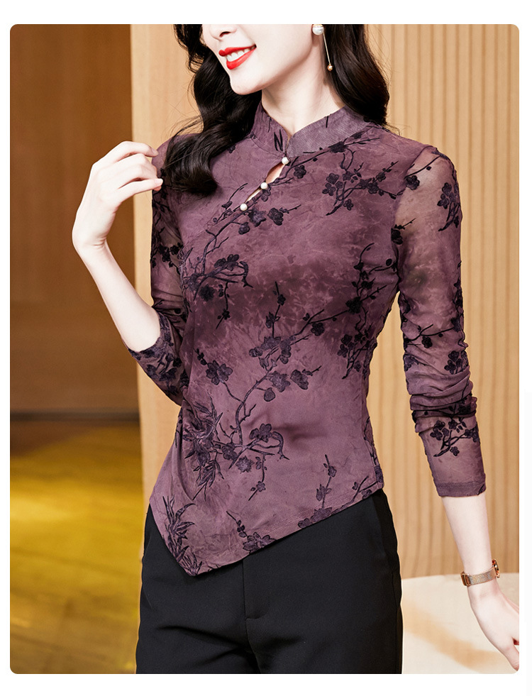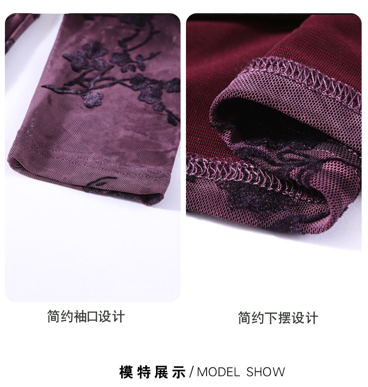 KQL E37M2938中式气质植绒印花长袖网纱打底衫修身显瘦T恤