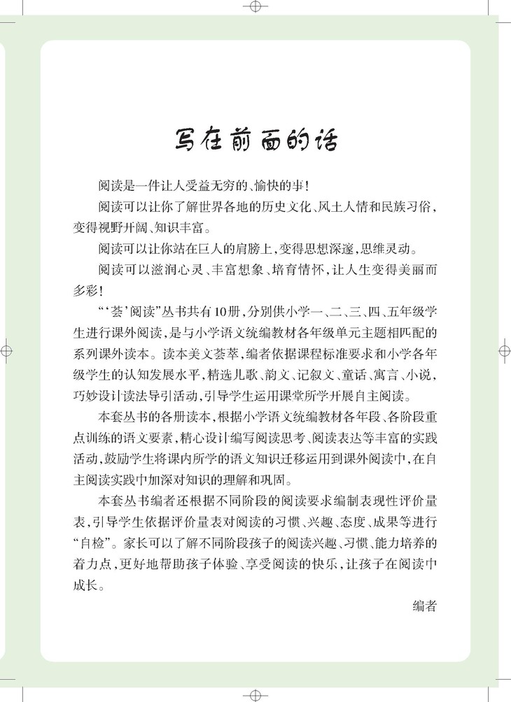 本套丛书编者还根据不同阶段的阅读要求编制表现性评价量表,引导学生依据评价量表对阅读的习惯、兴趣、态度、成果等进行“自检”。同时也让家长能了解每一阶段对孩子阅读兴趣、习惯培养、阅读能力提升的着力点,从而更好地引导不同阶段的孩子体验、享受阅读的快乐,促使孩子在阅读中成长。