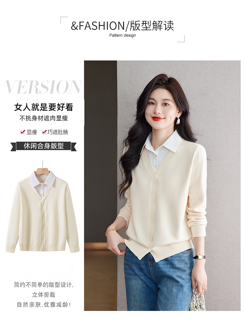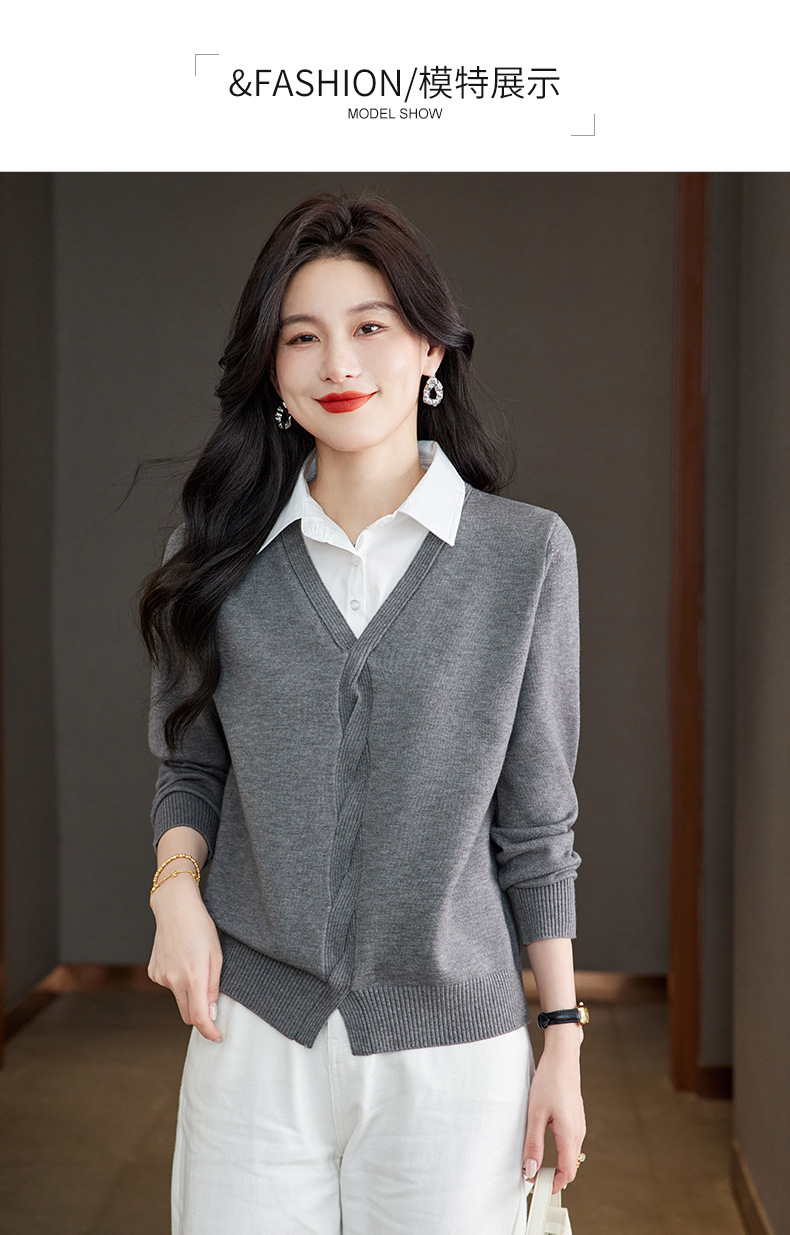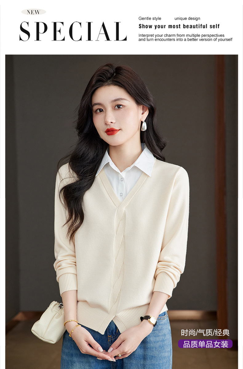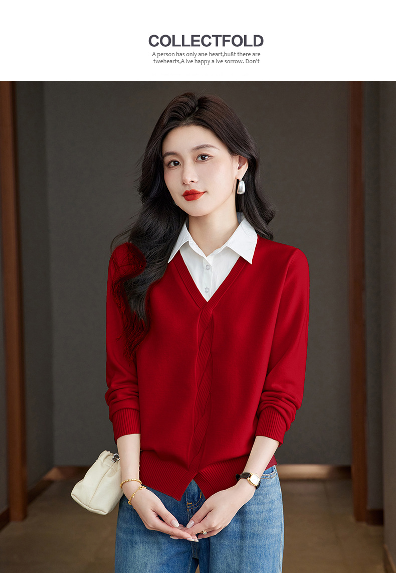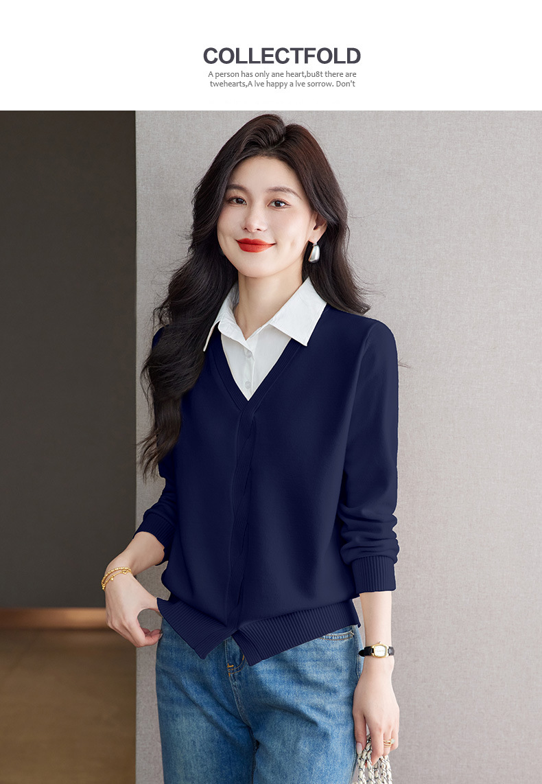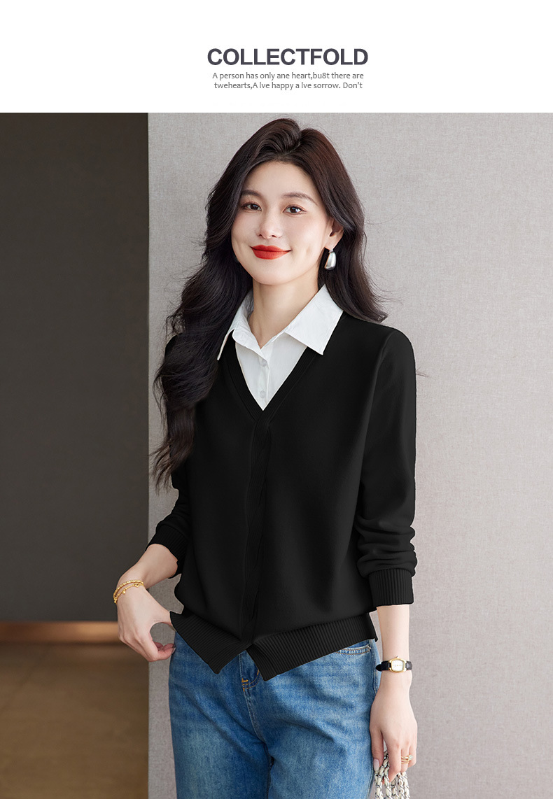 CC秋季衬衫领长袖针织t恤女2025新款气质洋气打底衫内搭假两件上衣