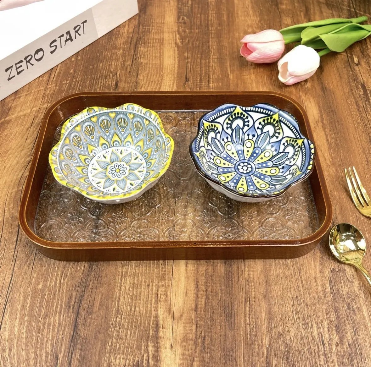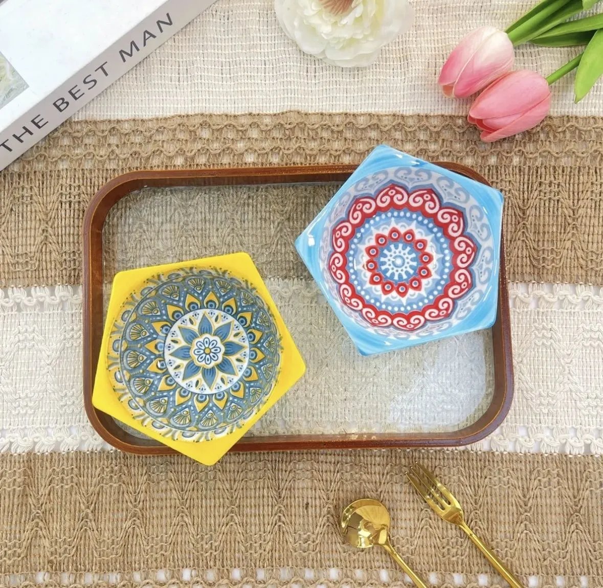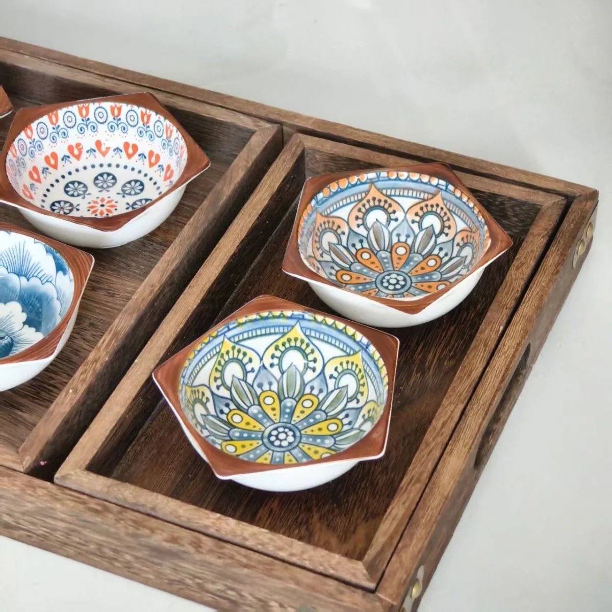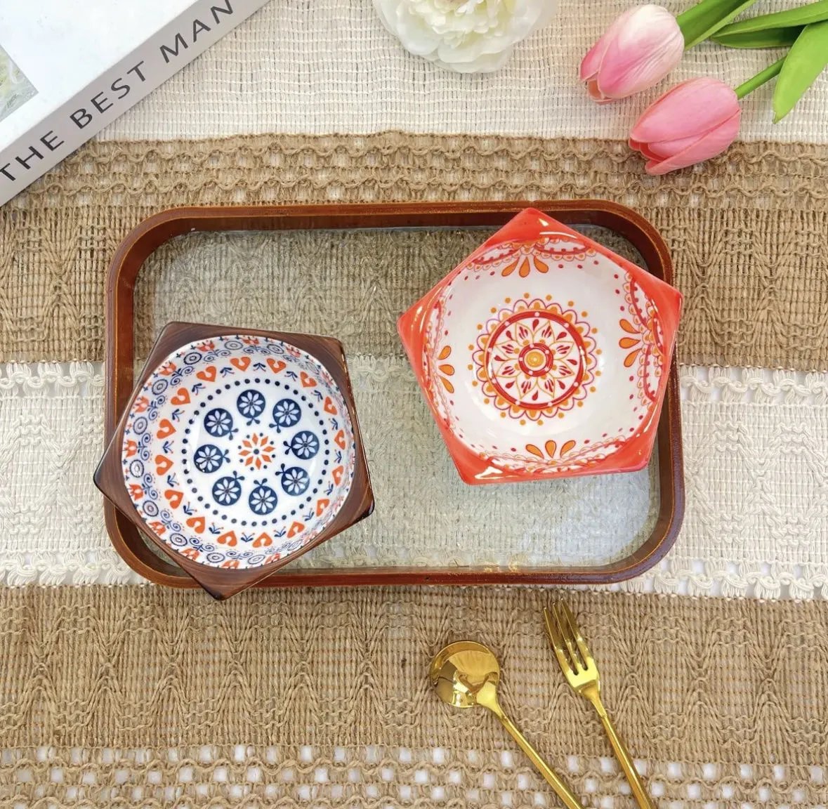 上一波餐盘福袋反响特别好 好多姐妹催着我们出其他款式🤣 这次大家带来的是蘸酱神器 陶瓷料碗哦 三种碗型:双耳/花瓣/五边形 工厂出口日本的订单尾货 打包成福袋盲盒清仓❗ 在亚马逊上一个就要百元以上❗ ✅釉下彩工艺,耐用不掉色不掉漆 能出口的,你就想吧,质感差不了❗ 因为每款花色都是孤品 所以只能当福袋盲盒给大家发货 买套餐具还体验到了拆盲盒的乐趣❗
