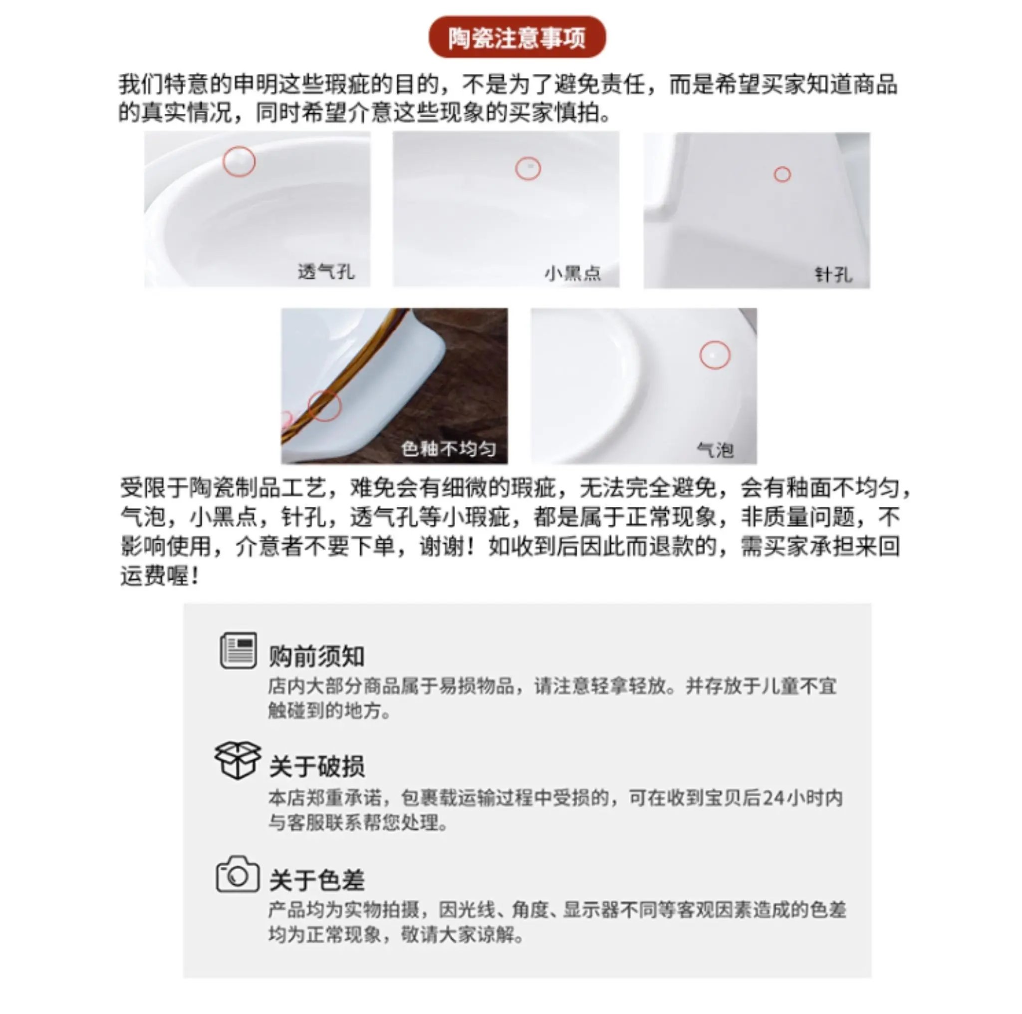 ⚠️【温馨提示】: 陶瓷采用天然陶土,土壤里面含有铁元素,烧制温度到达顶点会凝聚形成黑点,是不会影响安全使用的,在烧制过程中难免产生小凸起小白点小气泡小黑点跳釉的现象,这个是属于正常现象,不作为售后处理,介意慎拍哦!!! -----------------------------------------