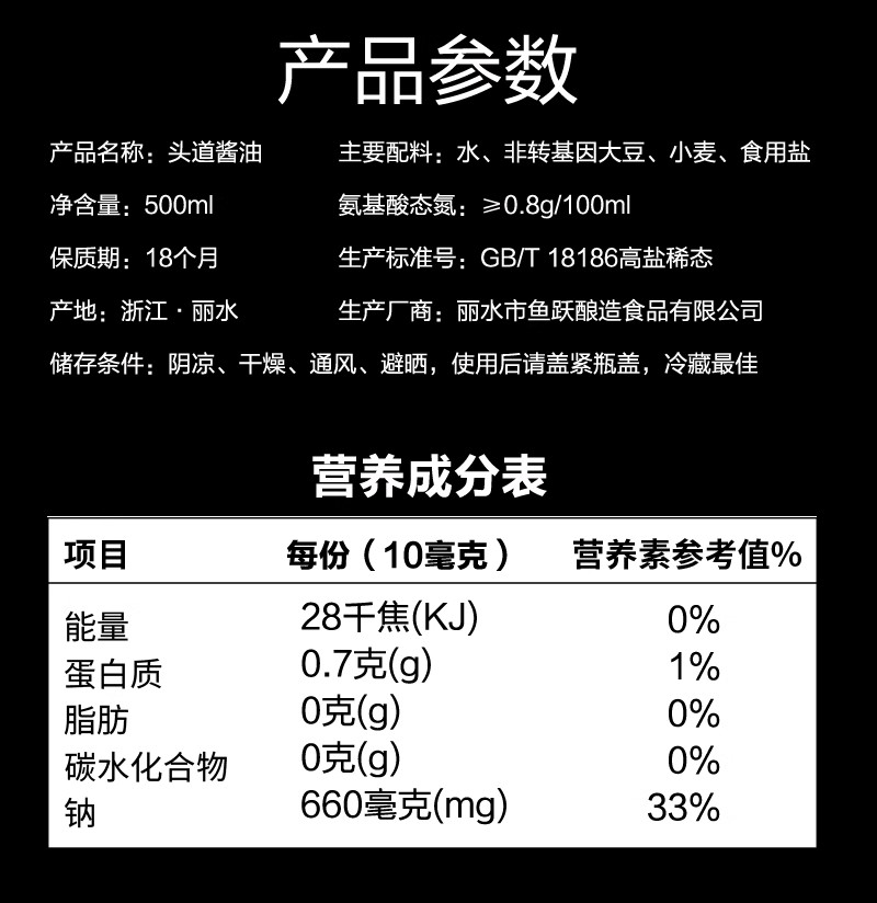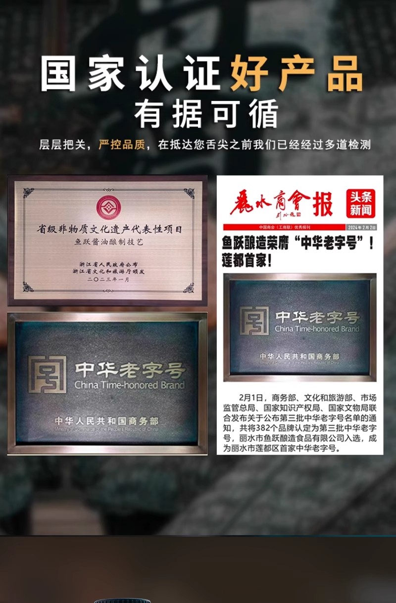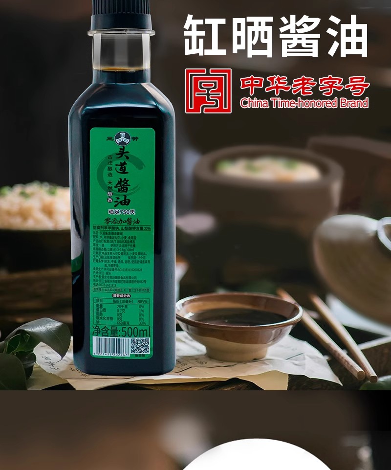 【拒绝添加】鱼跃头道酱油500ml*2瓶 古法手工纯粮酿造非遗天然发酵缸晒酱油