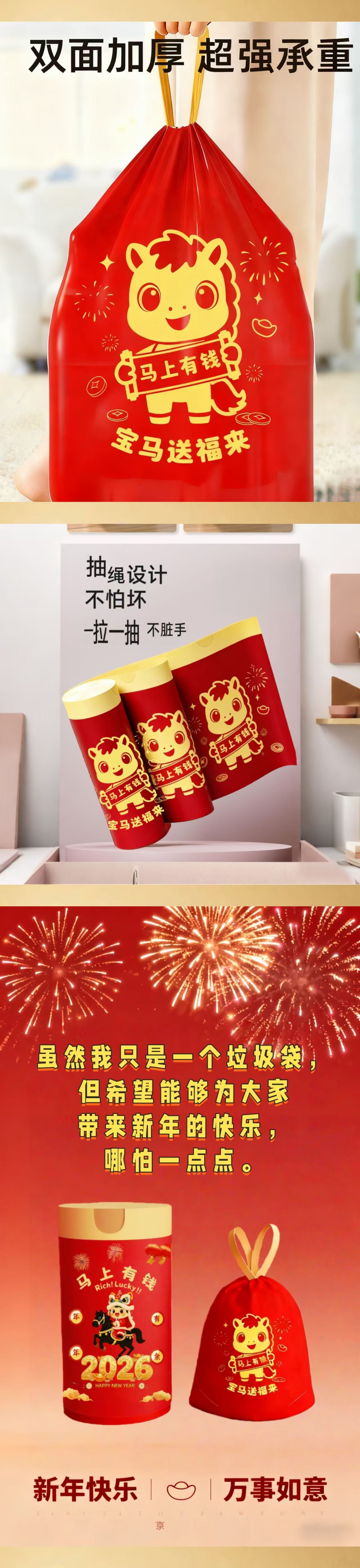 【免撕抽取不惧高温❗️厚实韧性加固袋体】2026新年马年春节印花图案抽绳垃圾袋加大加厚家庭办公室用穿绳垃圾袋。jb