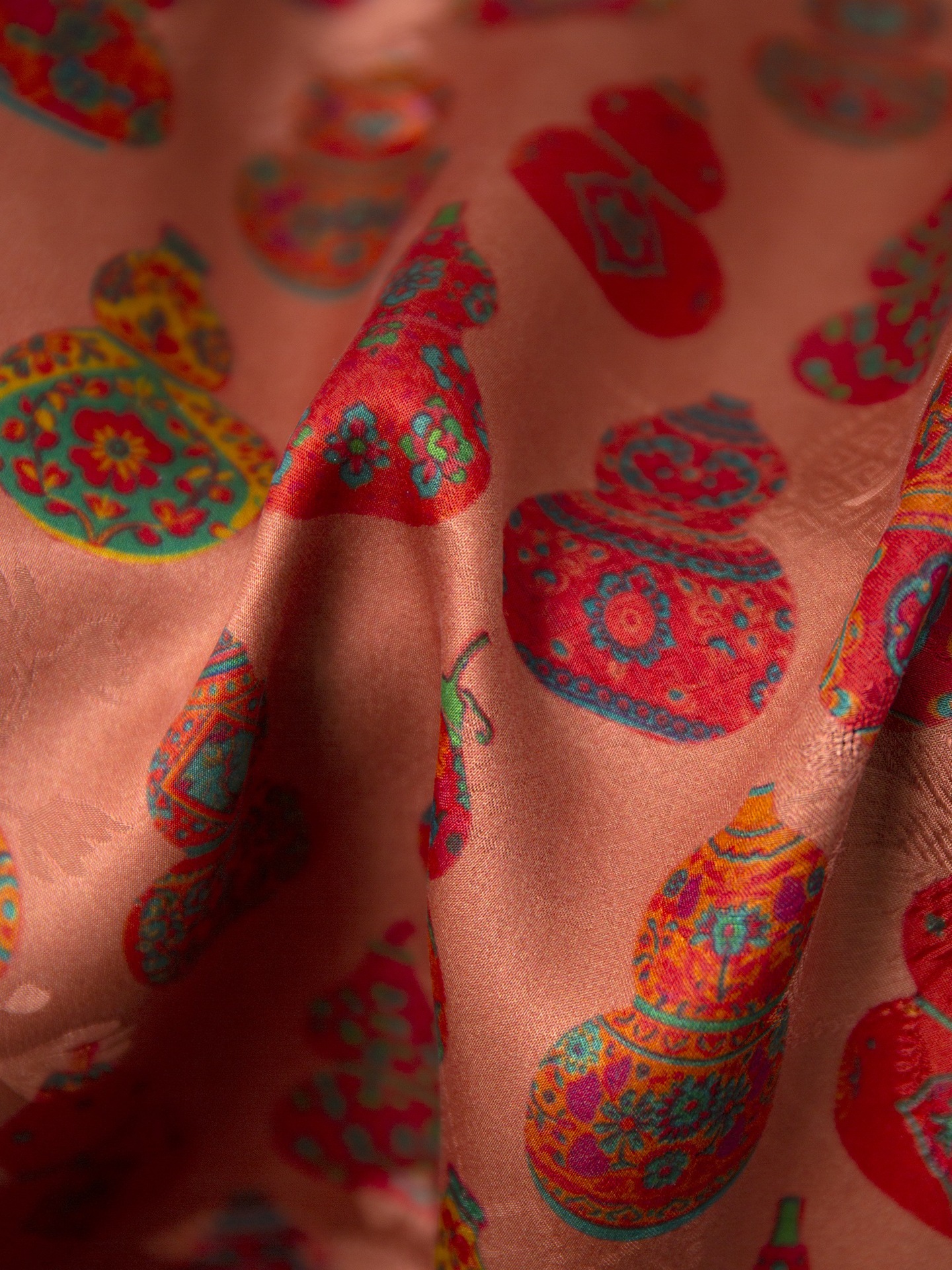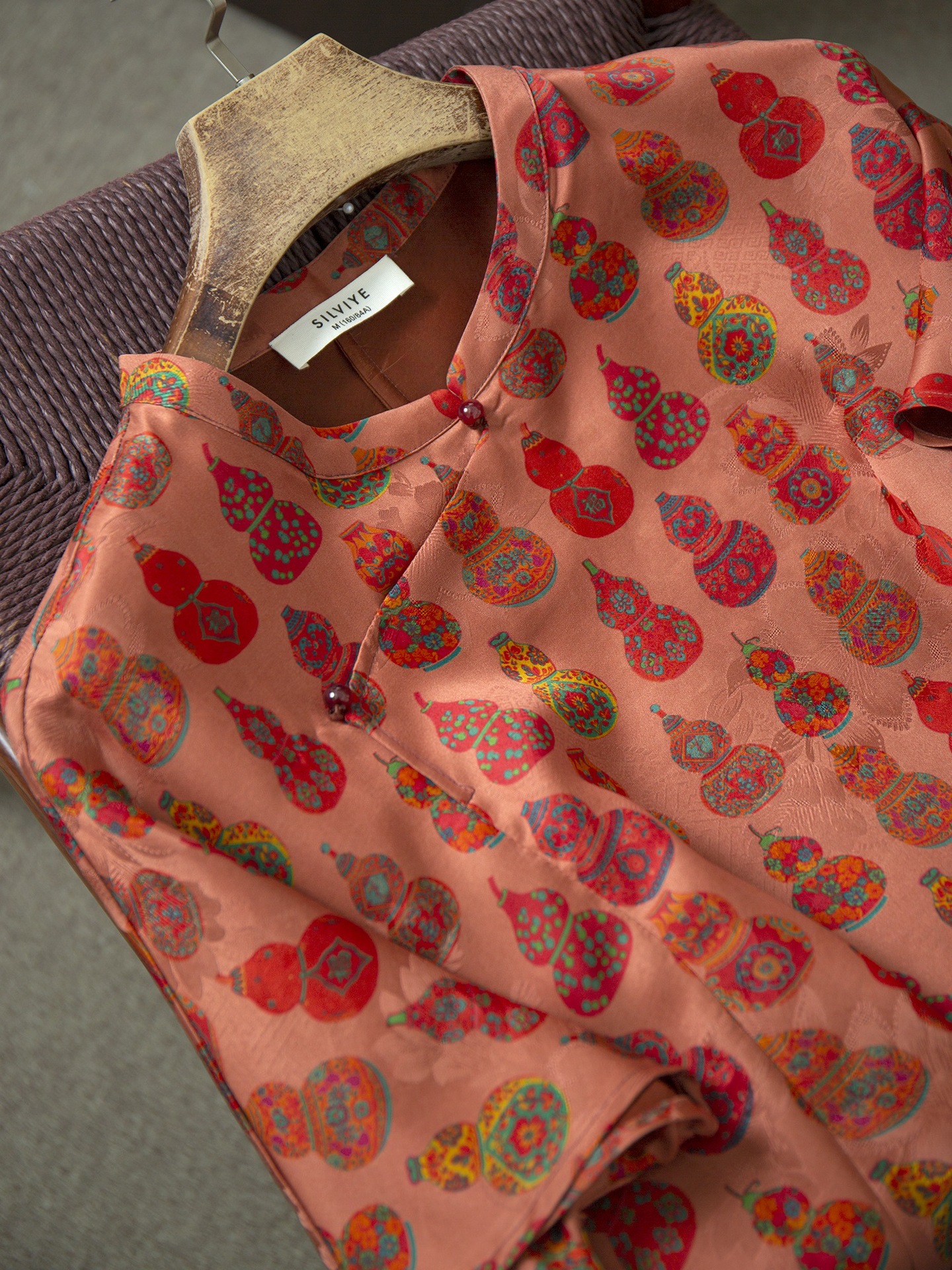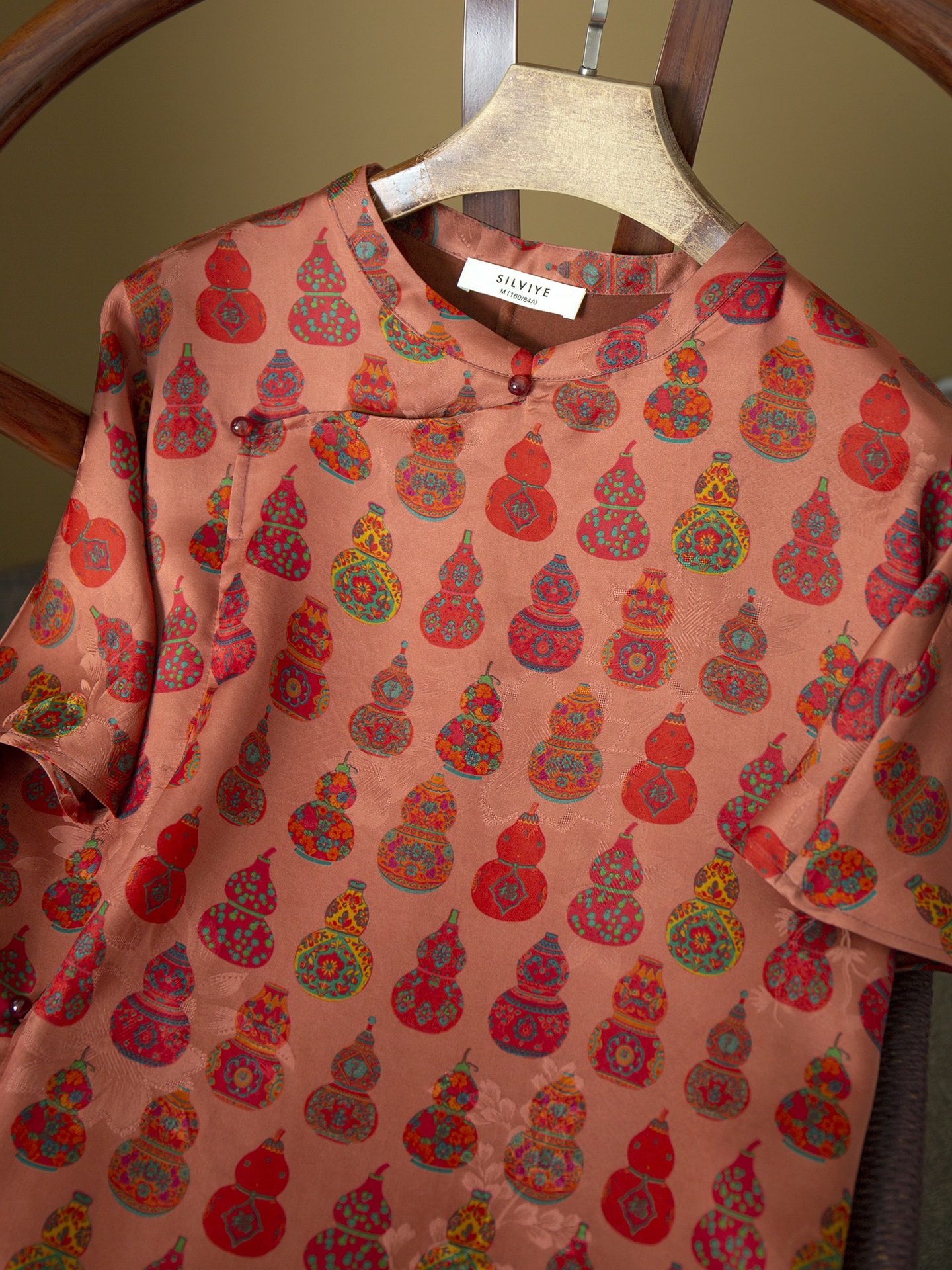 丁摩 真丝香云纱新中式连衣裙女福禄葫芦100桑蚕丝印花改良版旗袍裙5ZF- YSC007