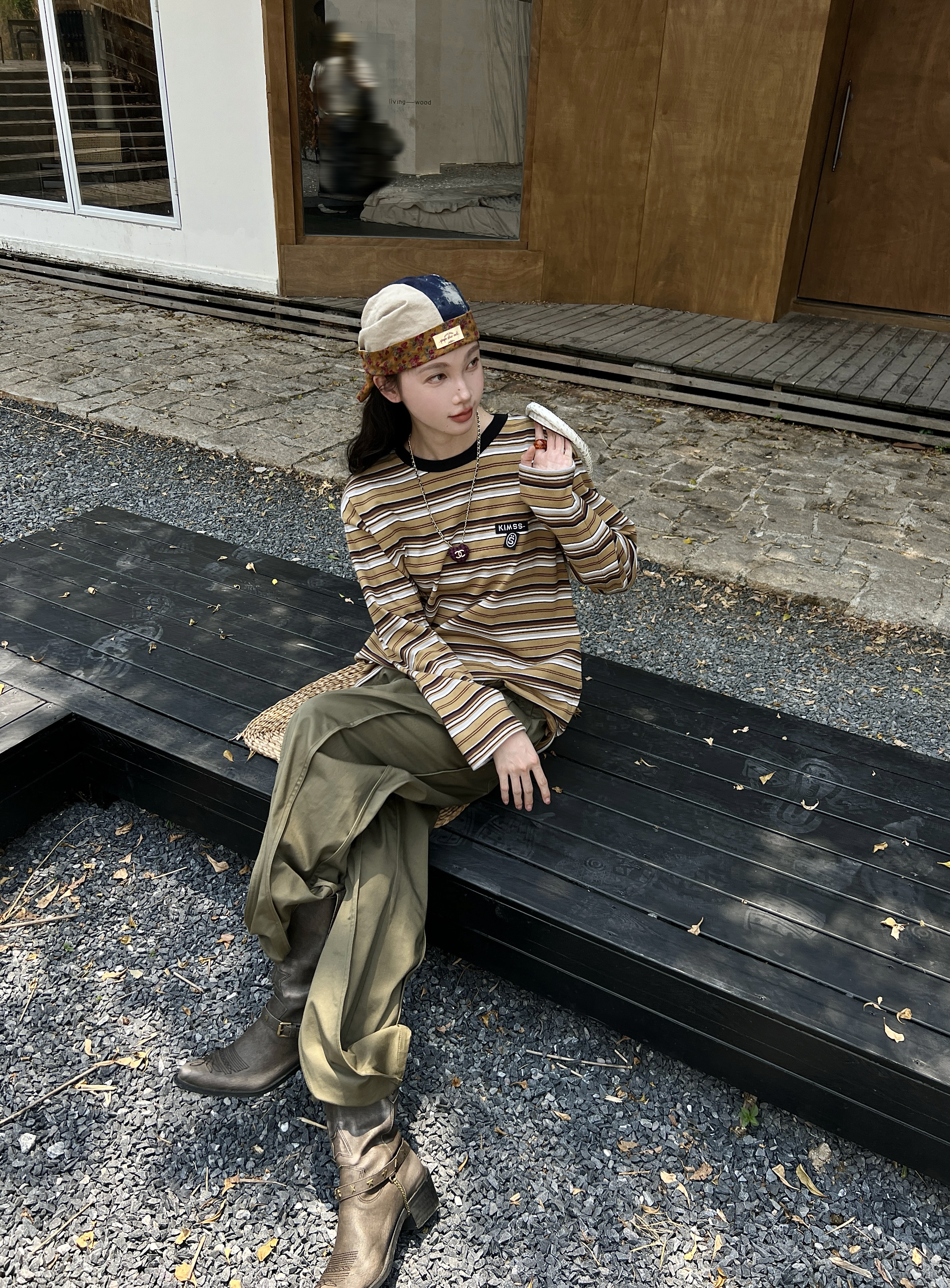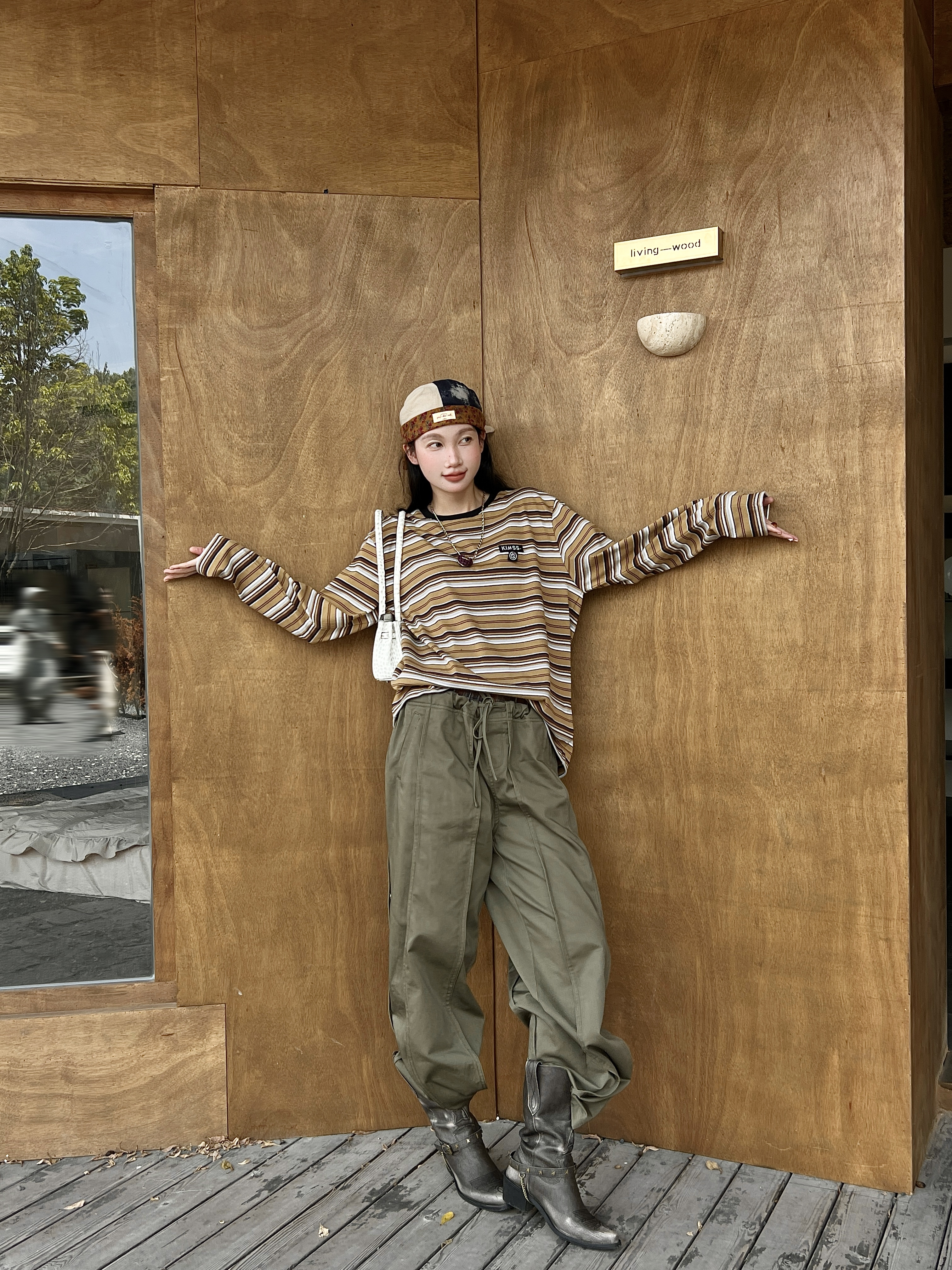 「美式街头复古条纹纯棉长袖T」条纹控必入