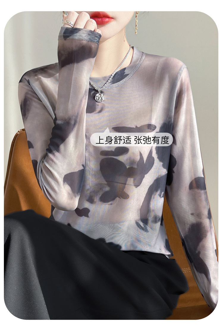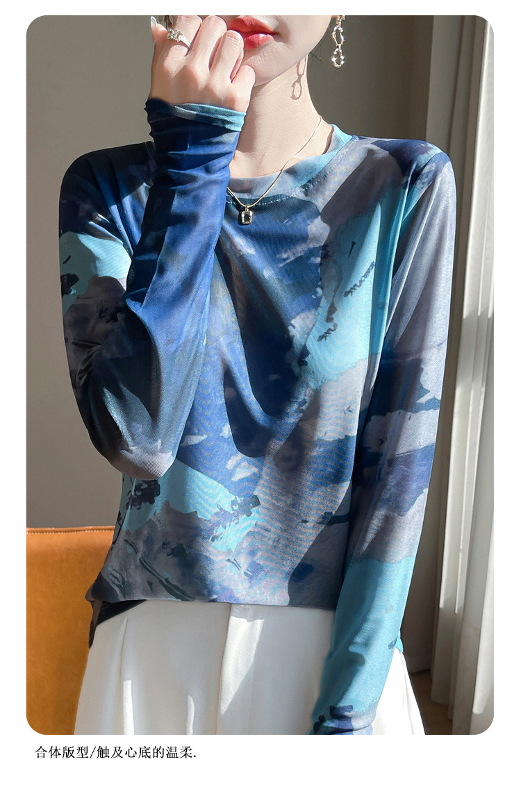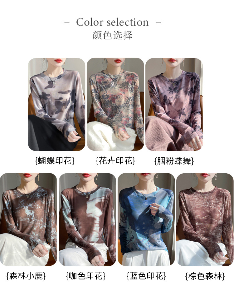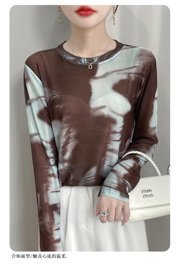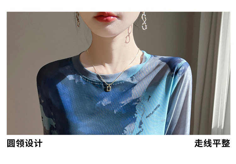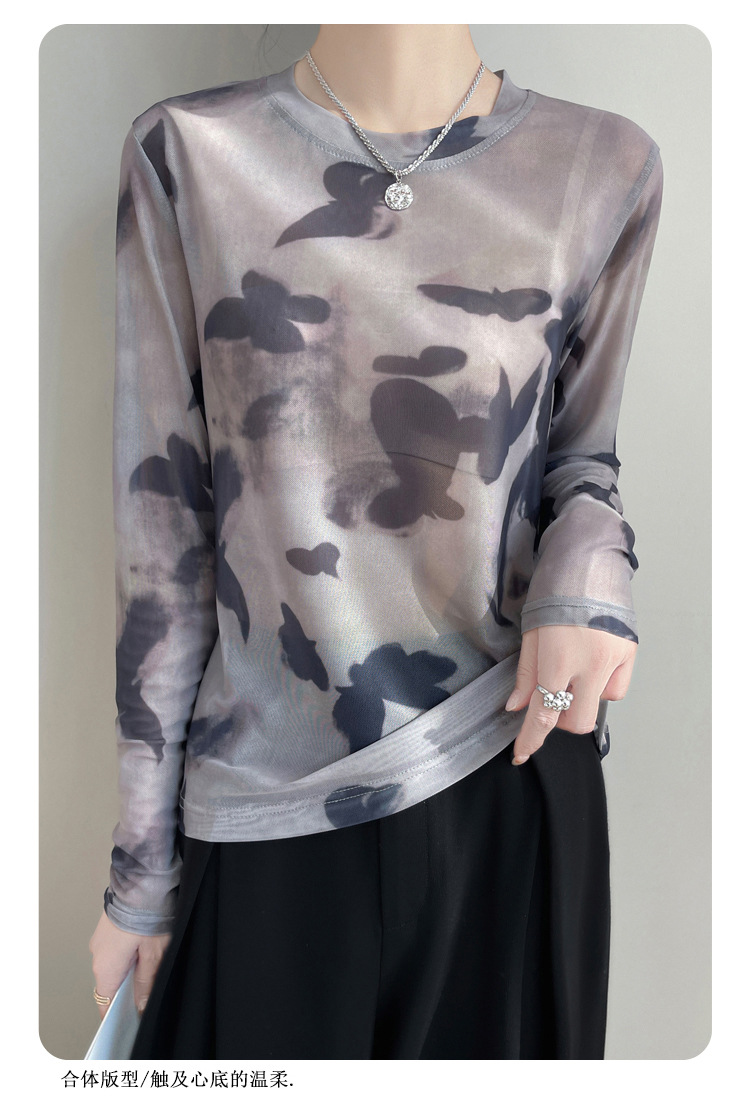 百媚生 圆领修身短款晕染印花网纱T恤YT-A62