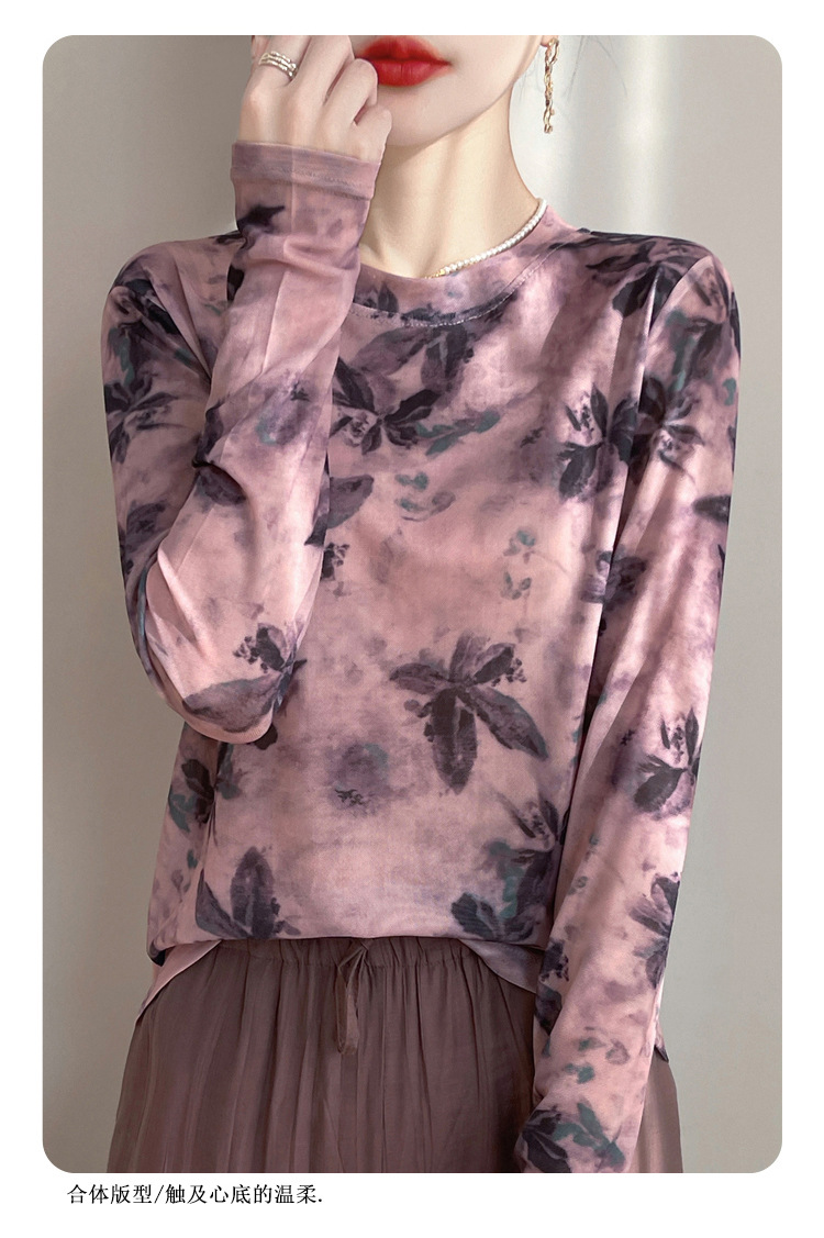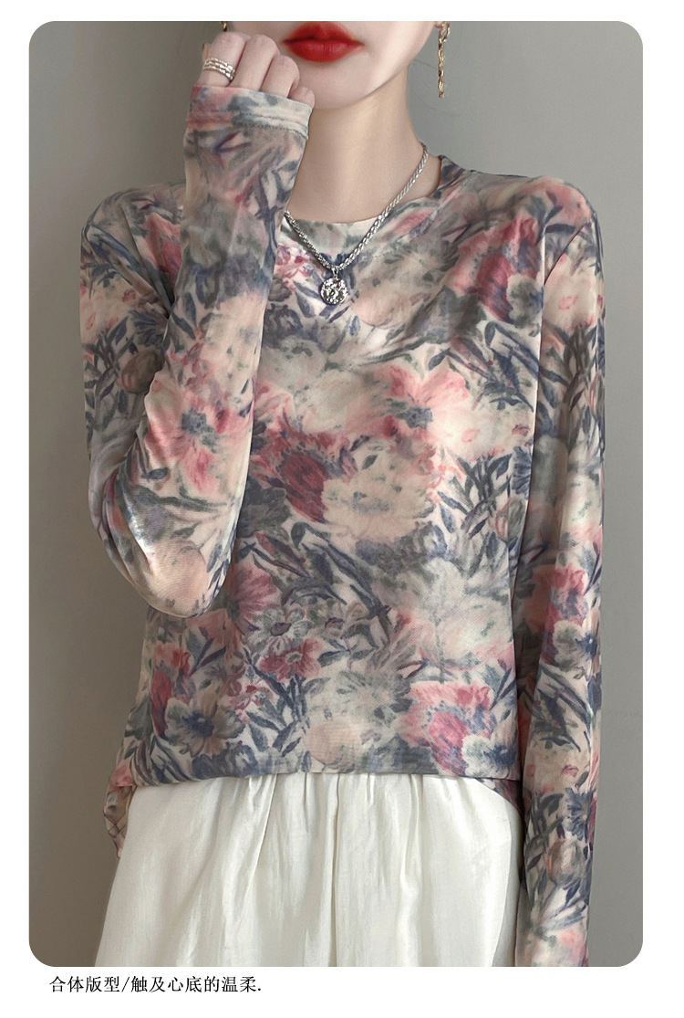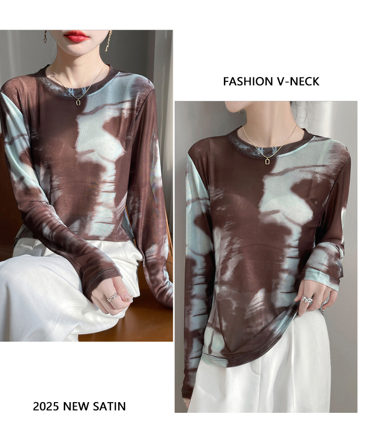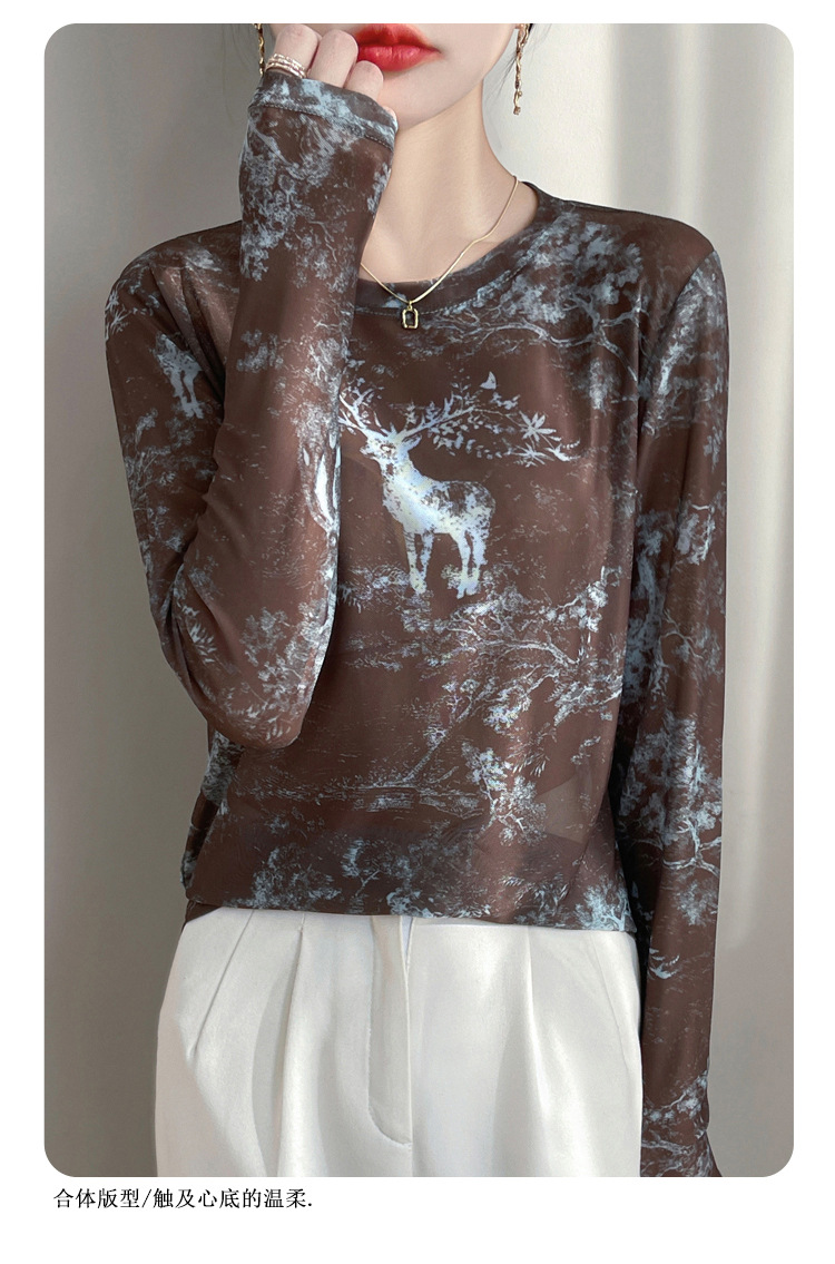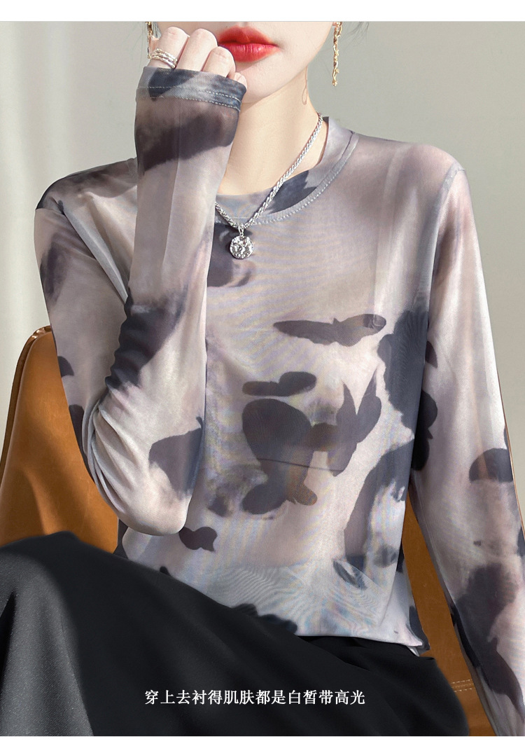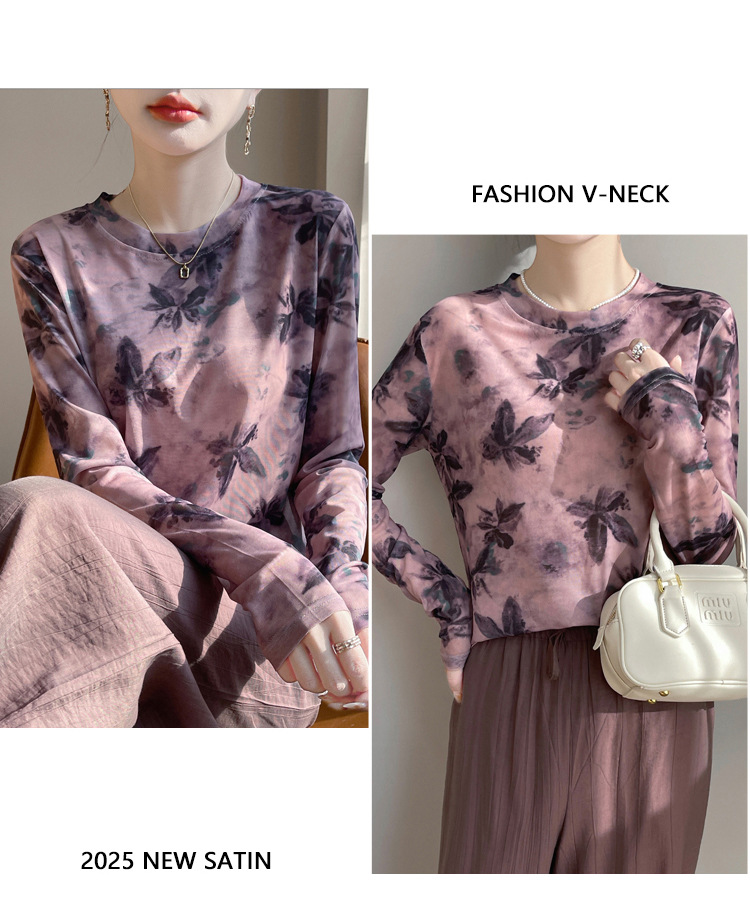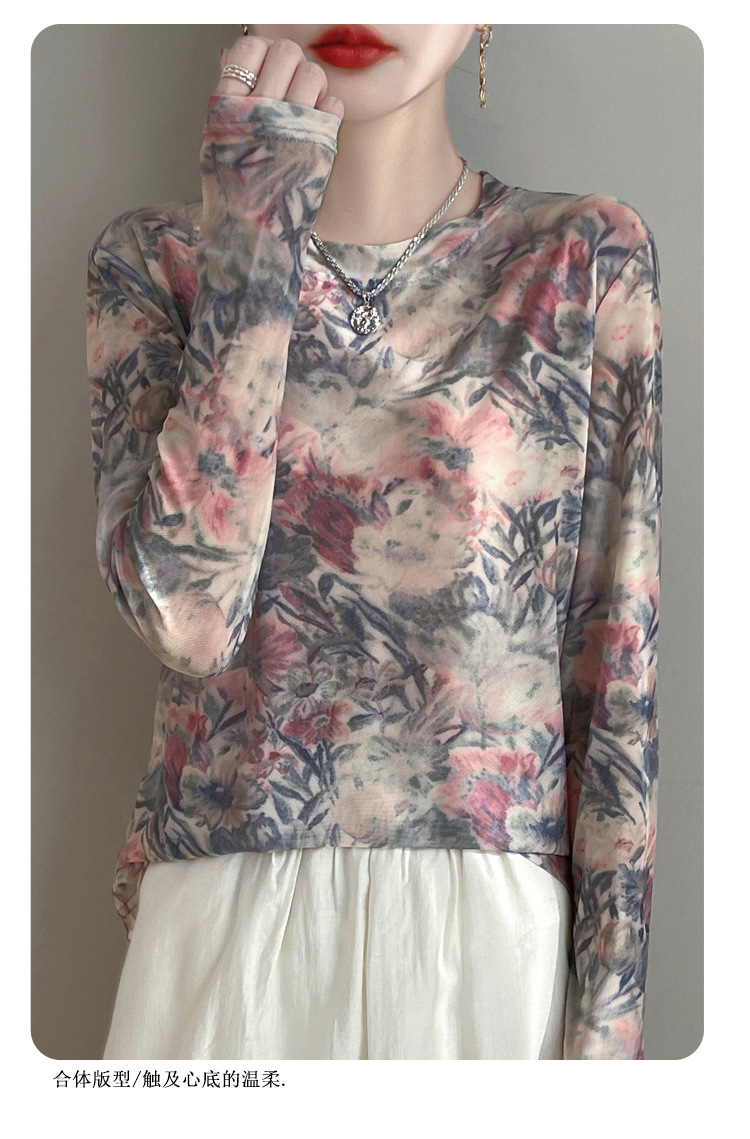 百媚生 圆领修身短款晕染印花网纱T恤YT-A62