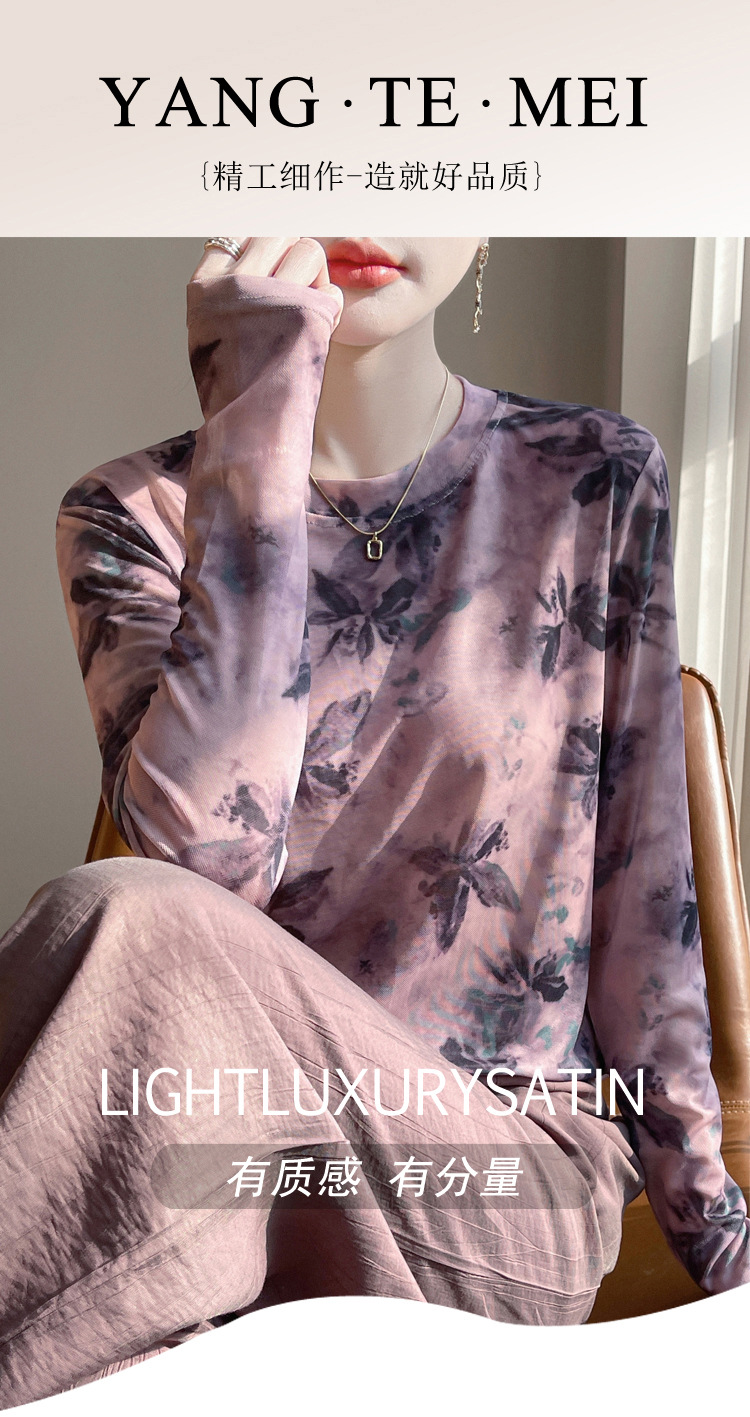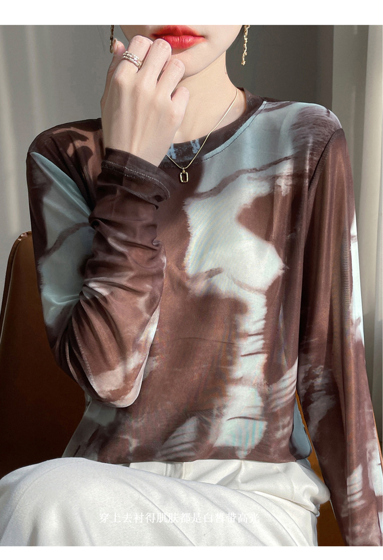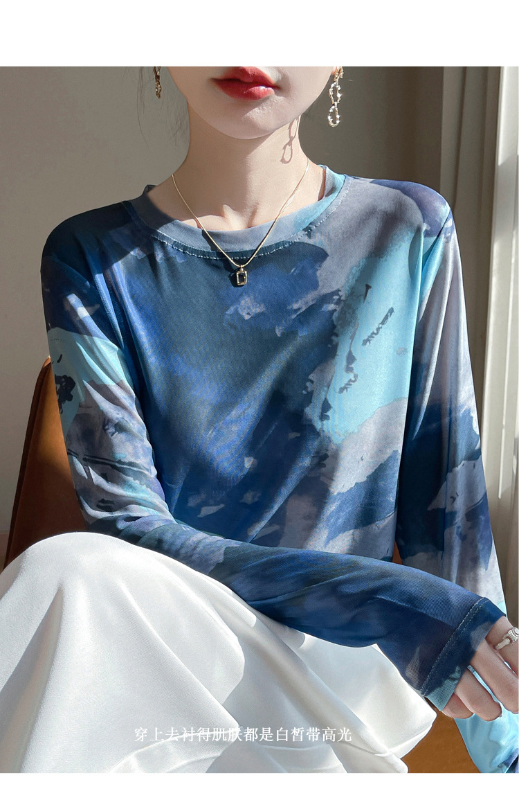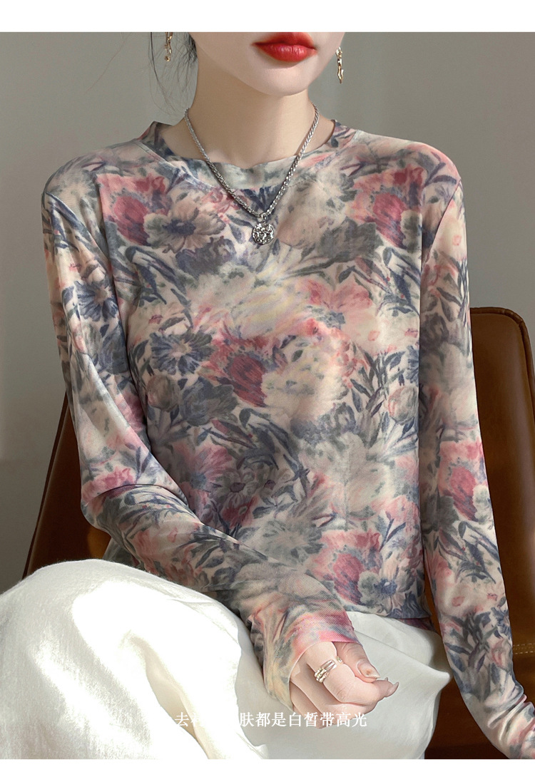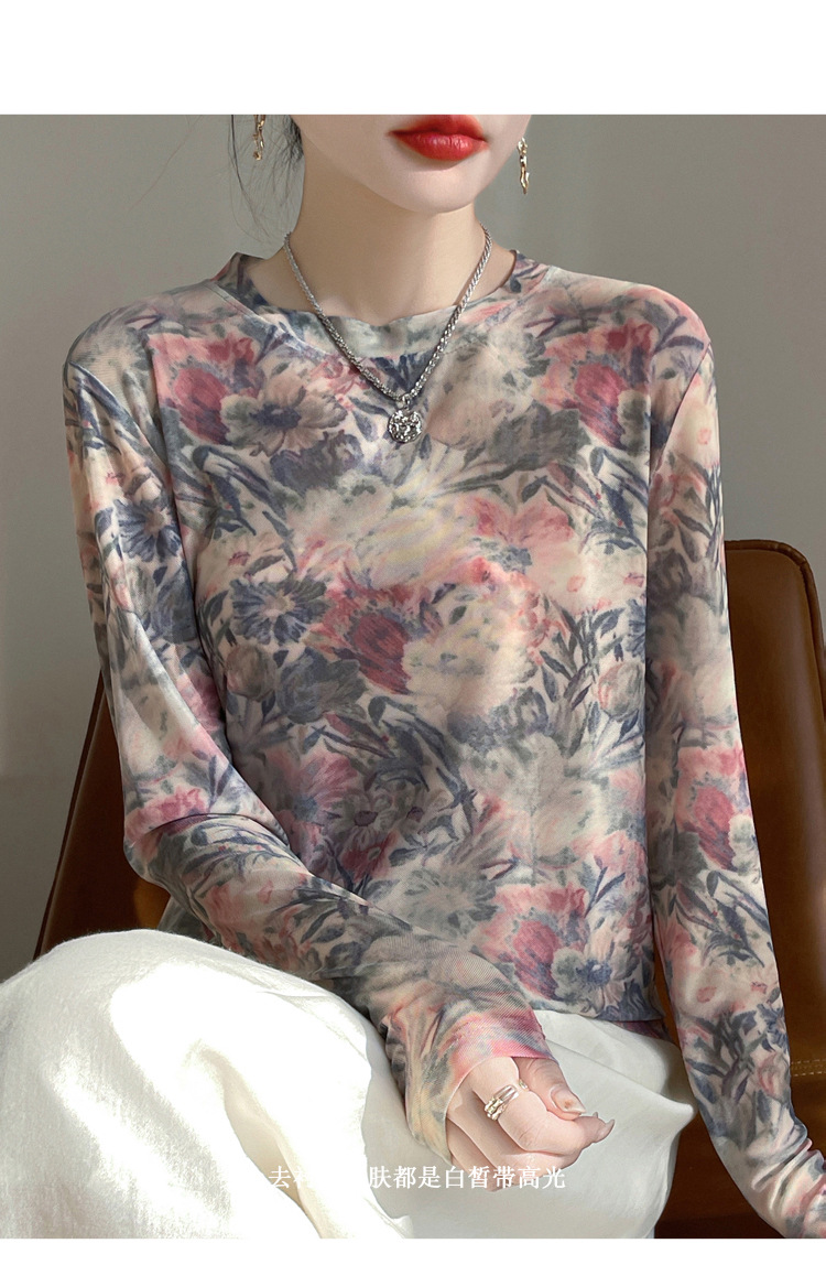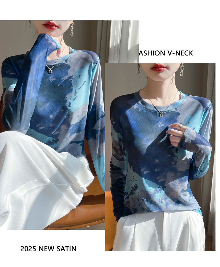百媚生 圆领修身短款晕染印花网纱T恤YT-A62