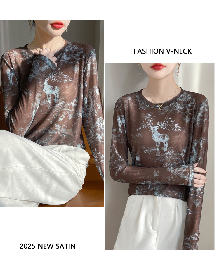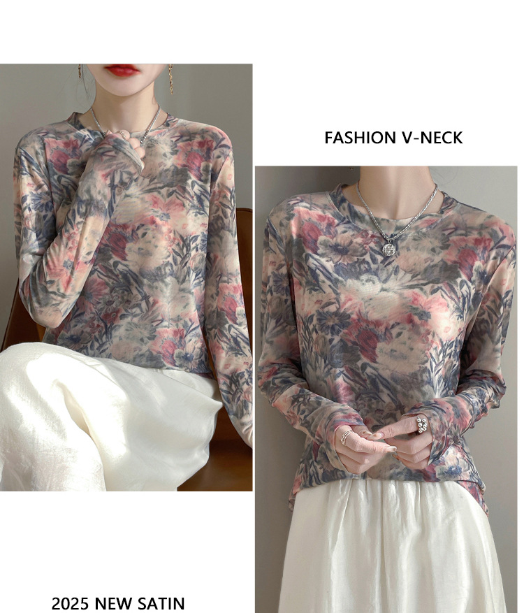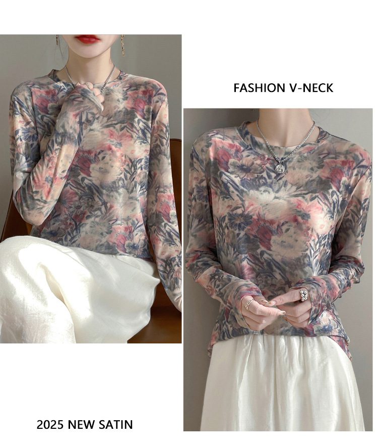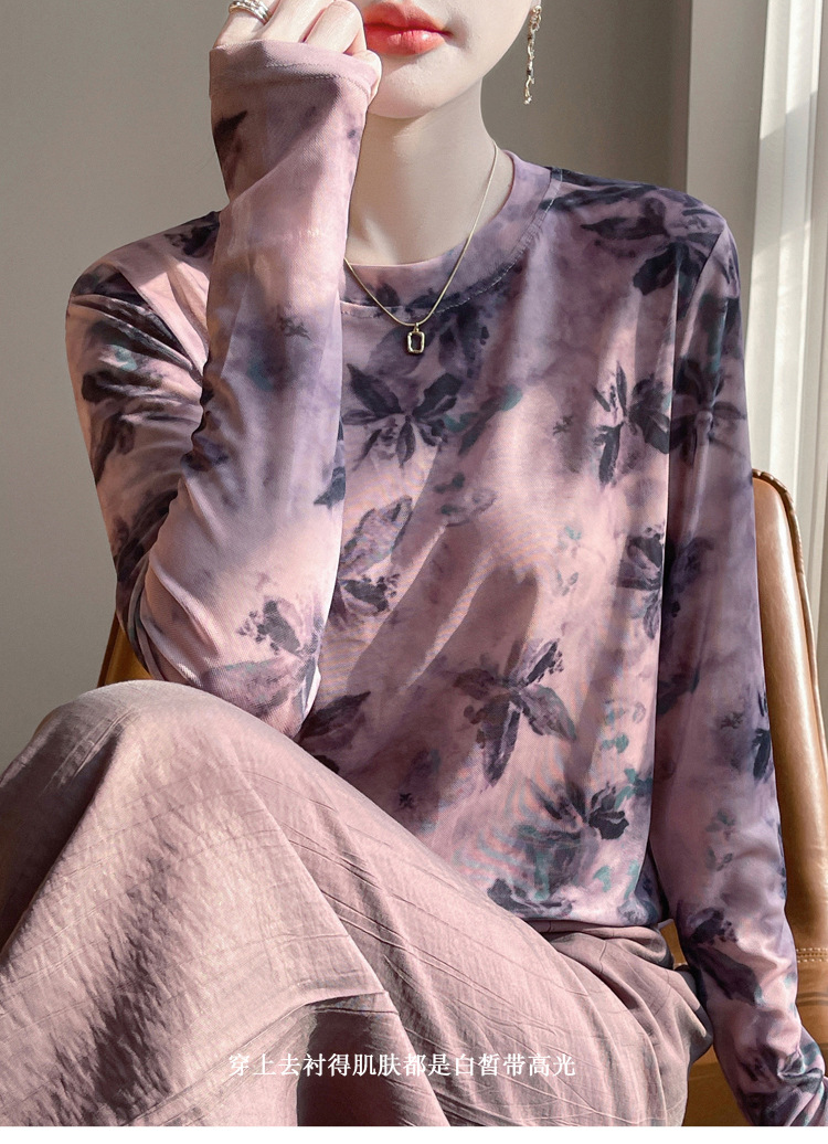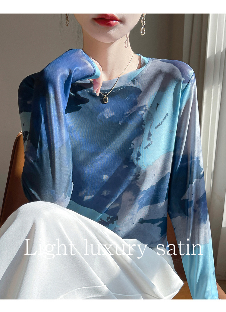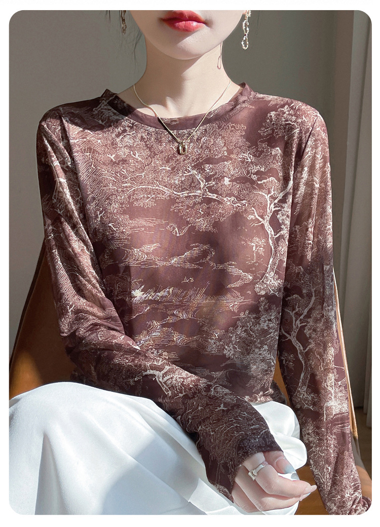 百媚生 圆领修身短款晕染印花网纱T恤YT-A62