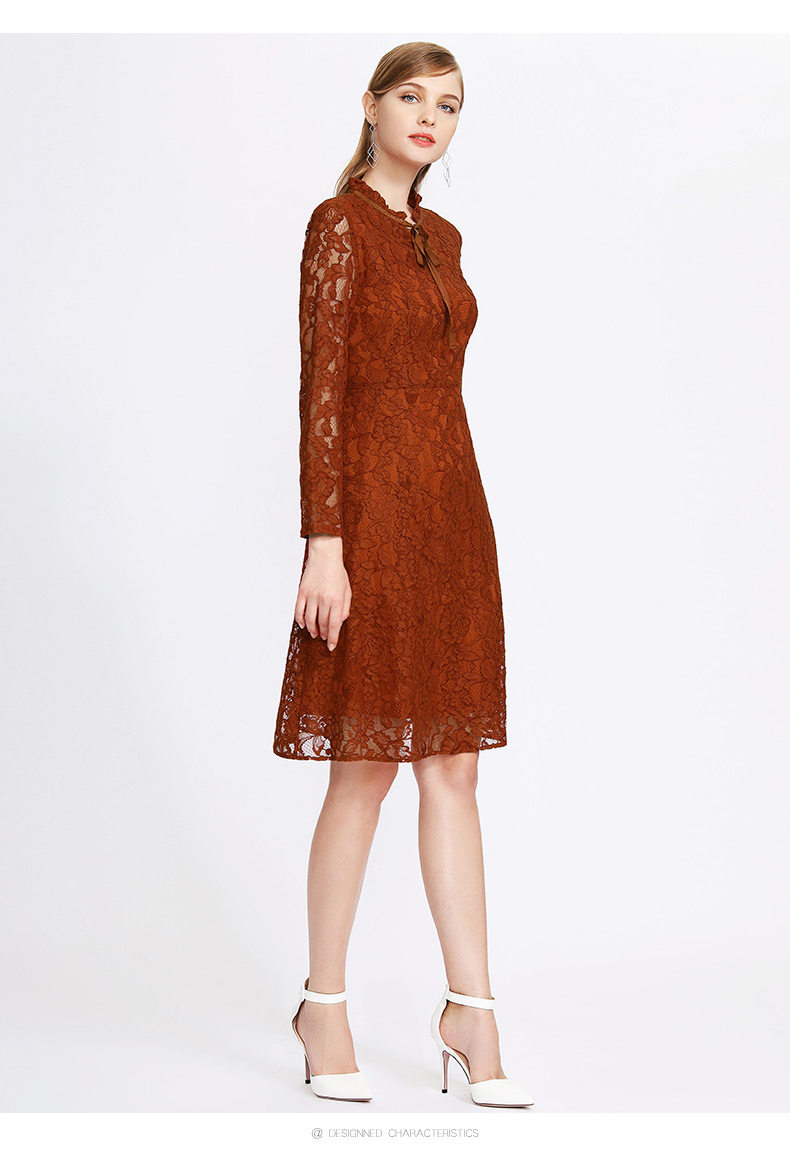 EITIE爱特爱女装早秋新款长袖蕾丝花边绷带中长款A字裙连衣裙C1807136