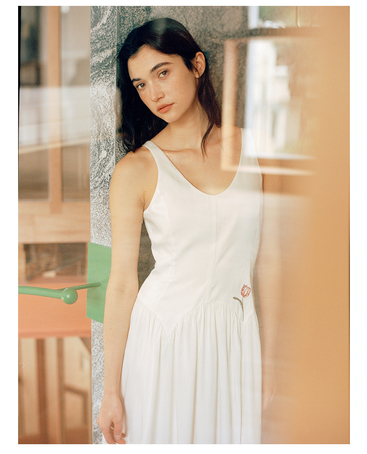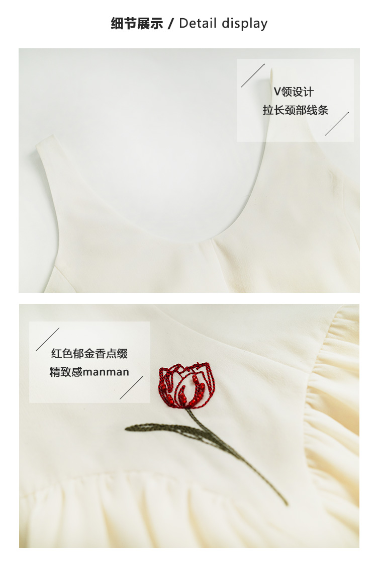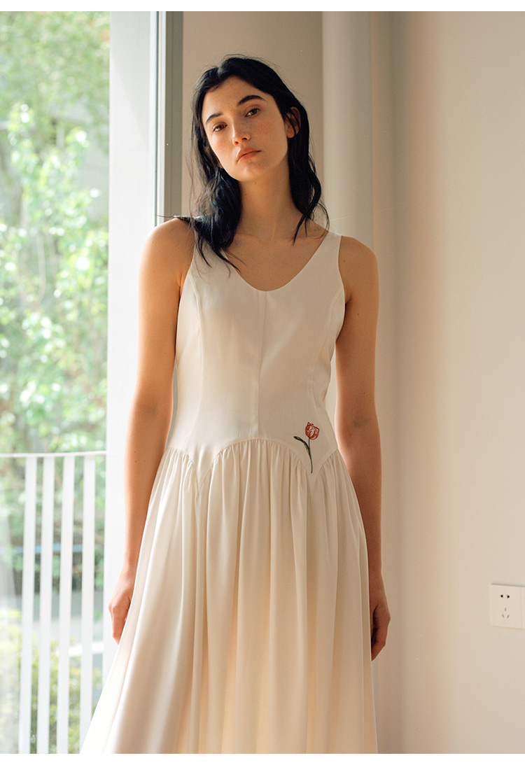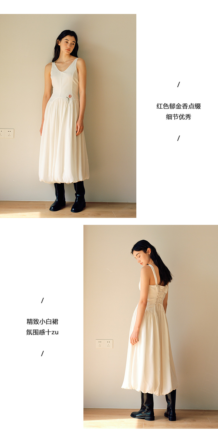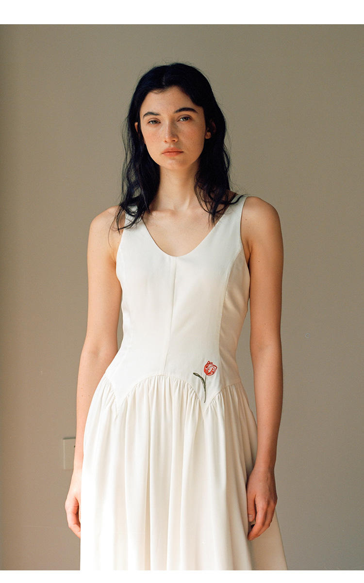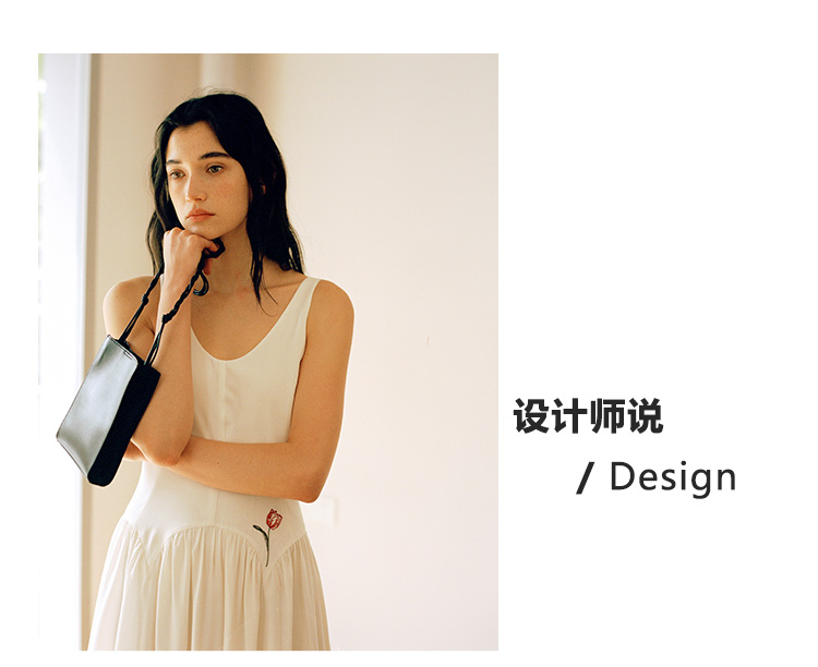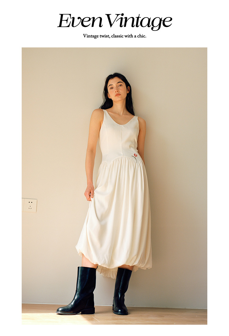 Even Vintage |绒面缎面料 V领艺术感背带连衣裙刺绣郁金香小白裙