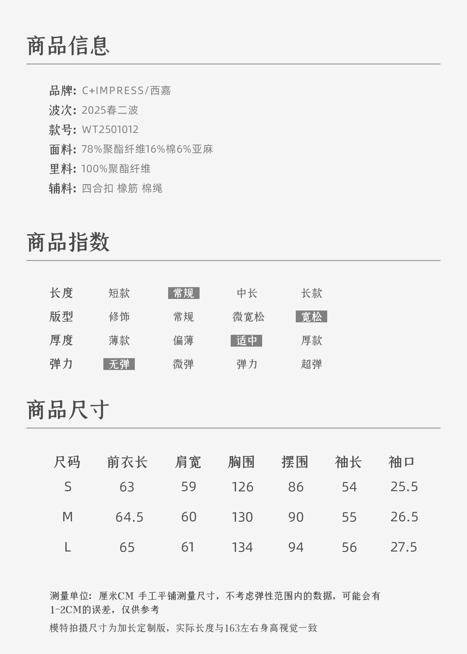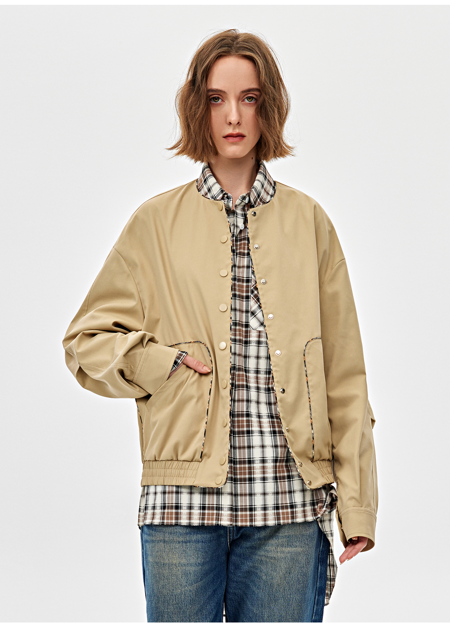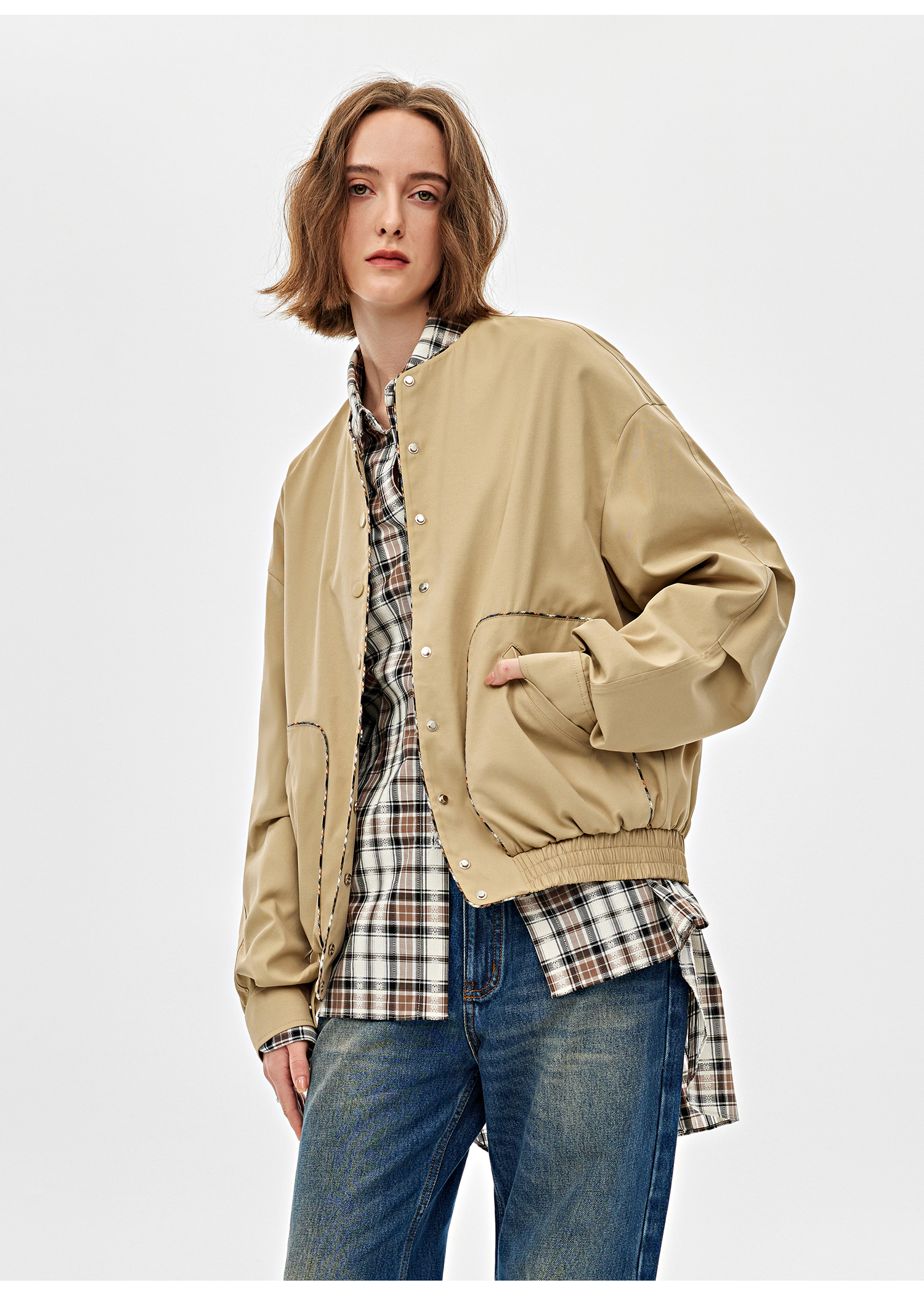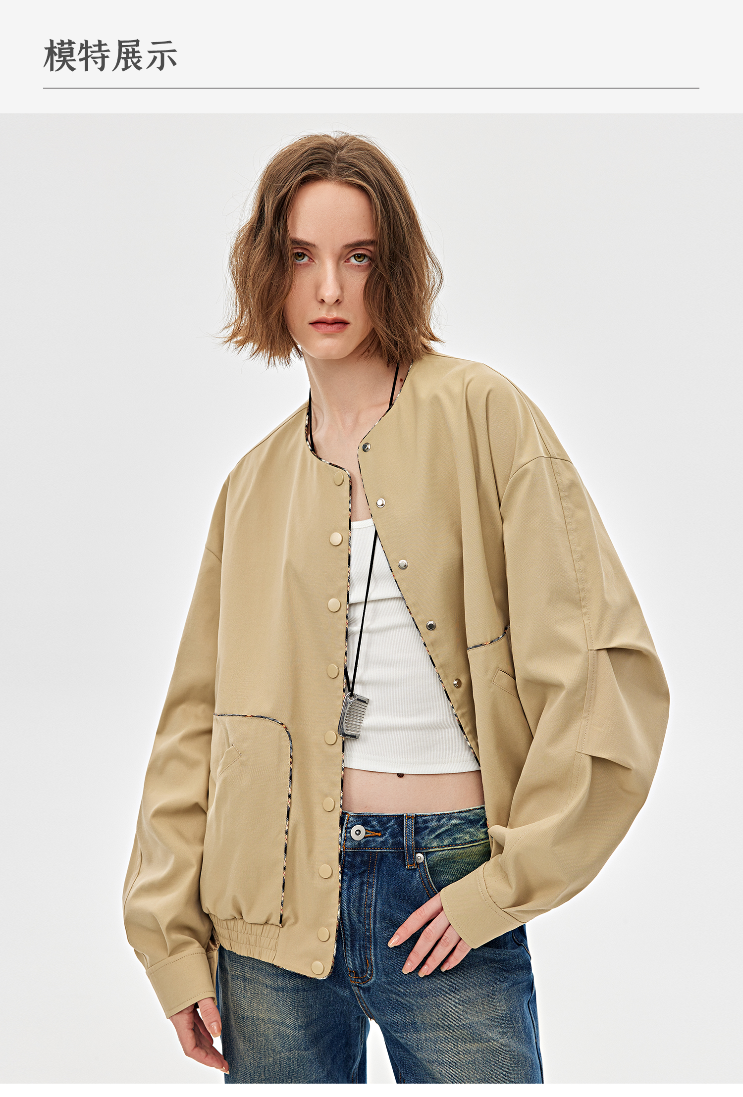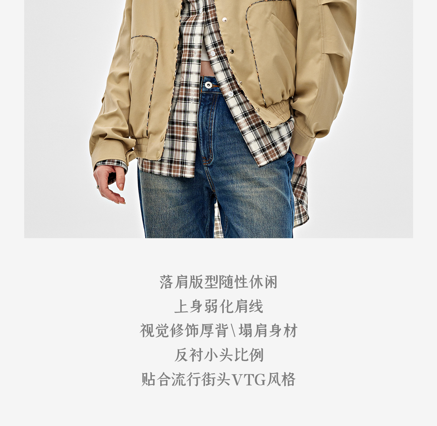 西嘉棉麻混纺重工格纹饰边休闲飞行夹克短款外套女春秋单排扣上衣WT2501012