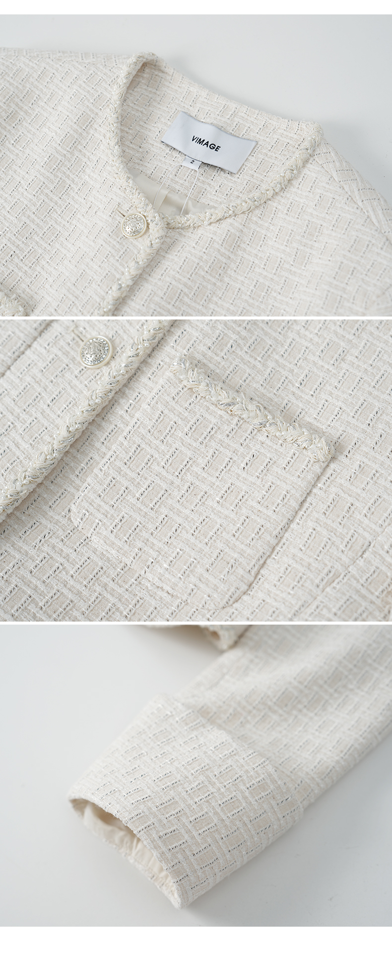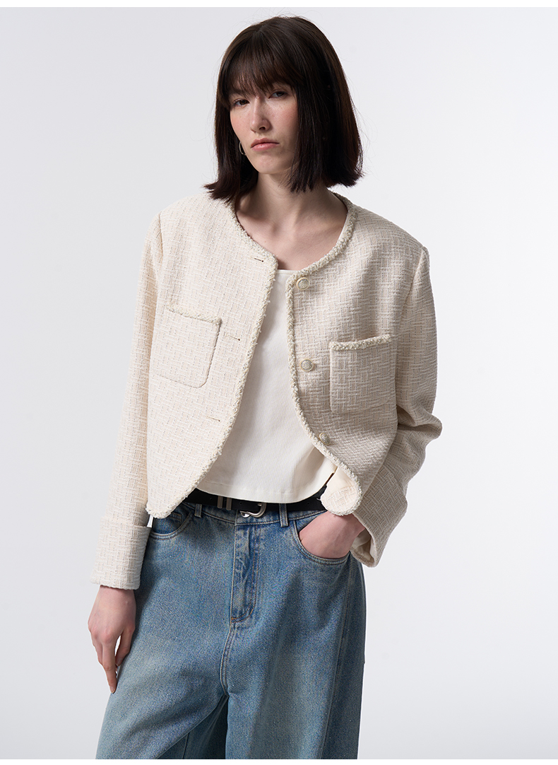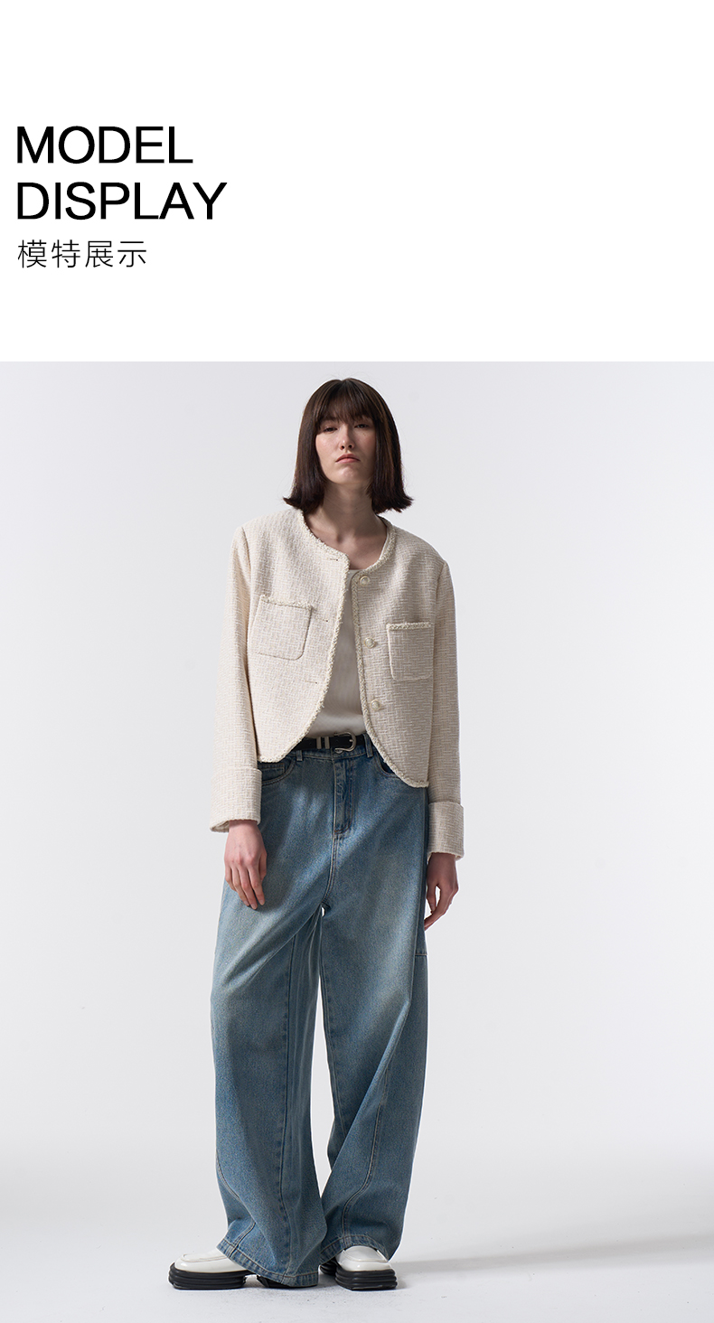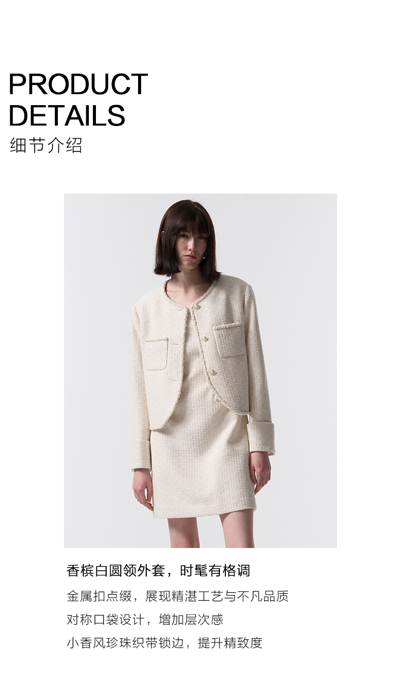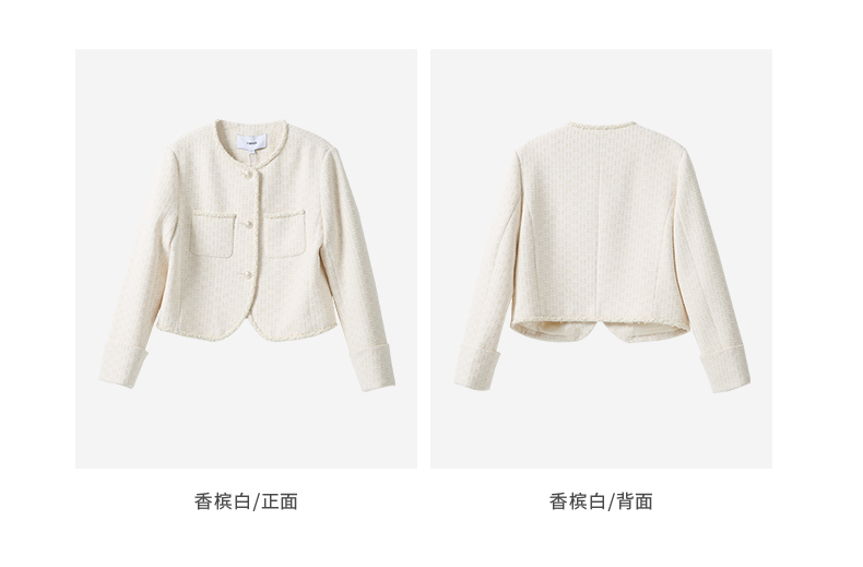 VIMAGE纬漫纪小香风复古香槟白圆领小个子短款外套女2026春季新款V2503206